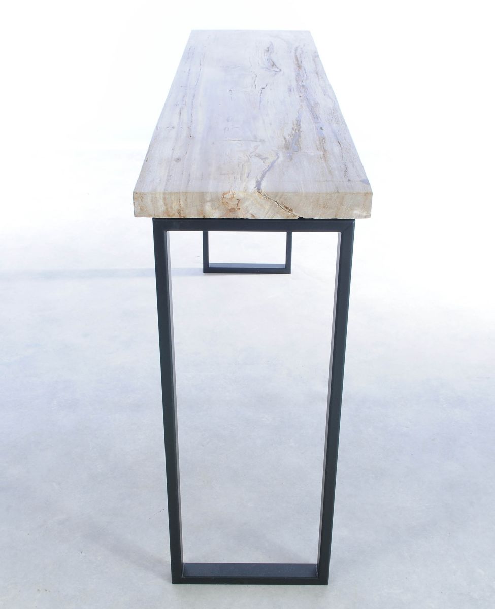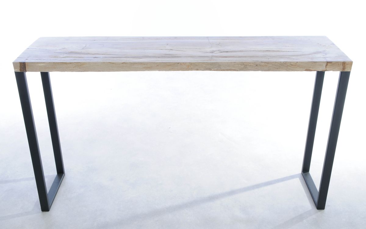 Deze unieke consoletafel van versteend hout past in ieder interieur. Het tafelblad is gezaagd uit een grote versteende boom, die ongeveer 20 miljoen jaar geleden geleefd heeft. De kleuren zijn bepaald door de mineralen die het hout van deze boom vervangen hebben.