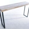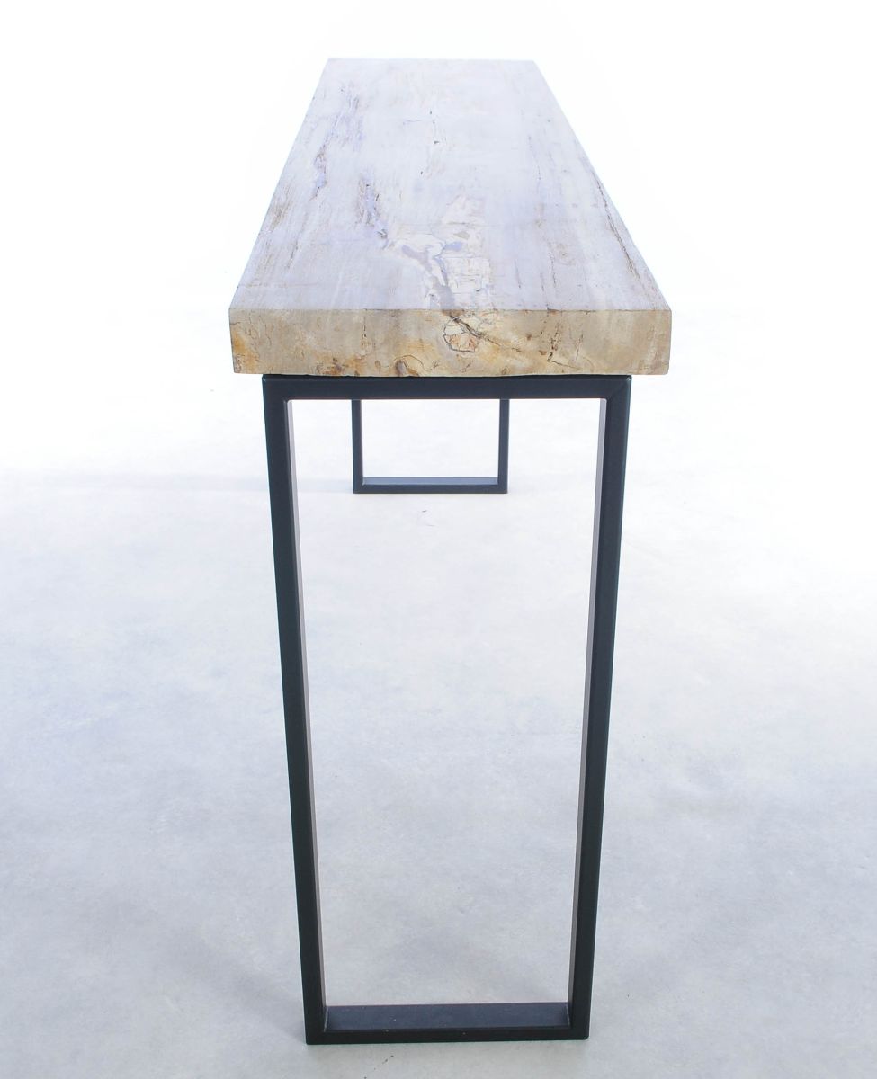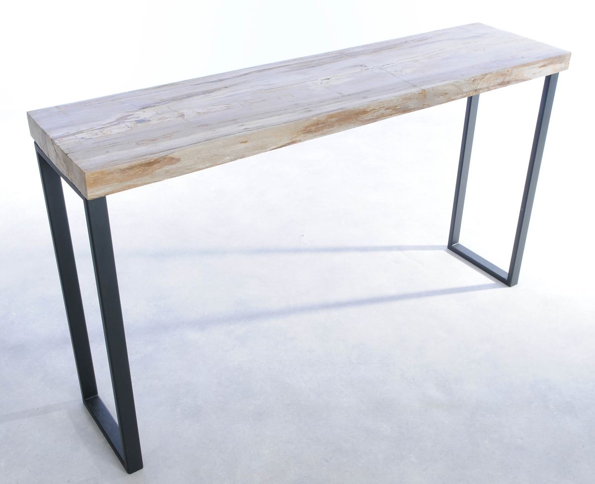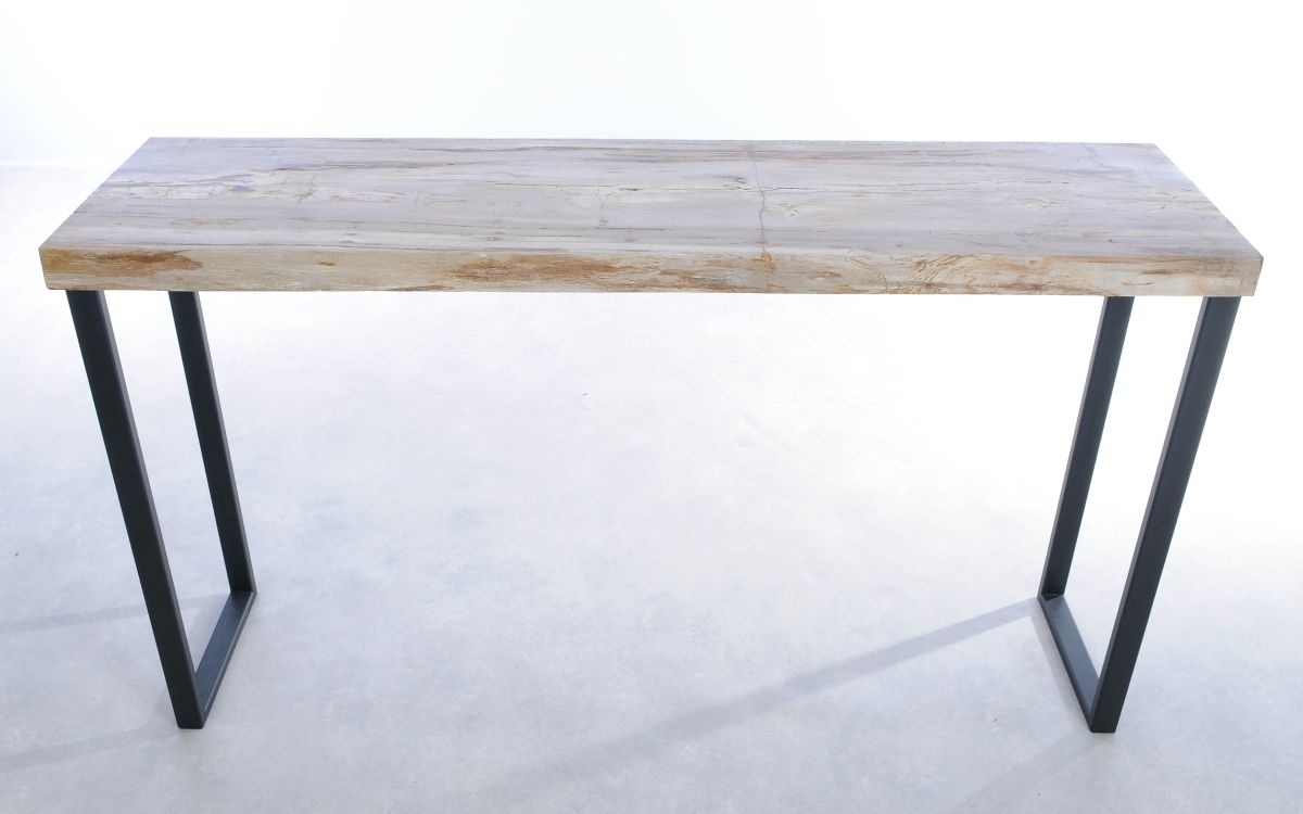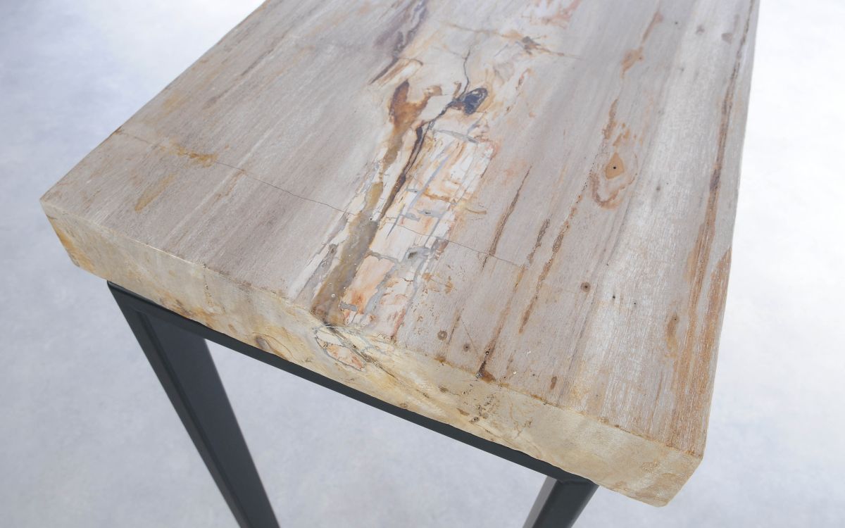 Deze unieke consoletafel van versteend hout past in ieder interieur. Het tafelblad is gezaagd uit een grote versteende boom, die ongeveer 20 miljoen jaar geleden geleefd heeft. De kleuren zijn bepaald door de mineralen die het hout van deze boom vervangen hebben.