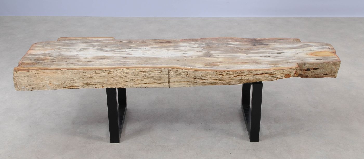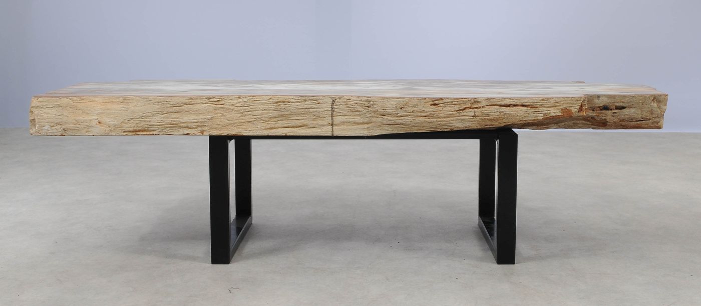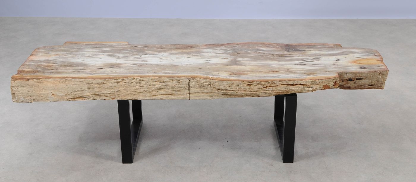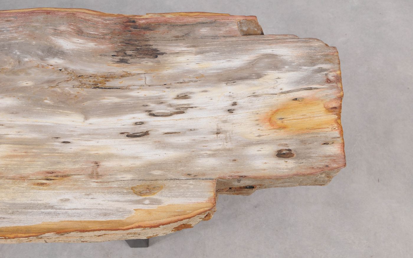 Deze unieke consoletafel van versteend hout past in ieder interieur. Het tafelblad is gezaagd uit een grote versteende boom, die ongeveer 20 miljoen jaar geleden geleefd heeft. De kleuren zijn bepaald door de mineralen die het hout van deze boom vervangen hebben.