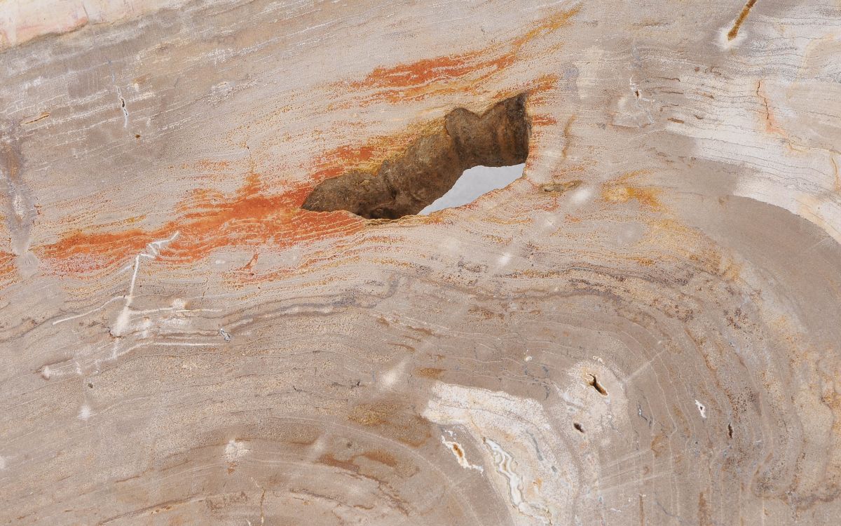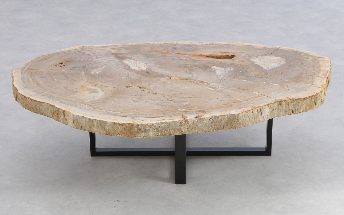 Deze unieke salontafel van versteend hout past in ieder interieur. Het tafelblad is gezaagd uit een grote versteende boom, die ongeveer 20 miljoen jaar geleden geleefd heeft. De kleuren zijn bepaald door de mineralen die het hout van deze boom vervangen hebben.