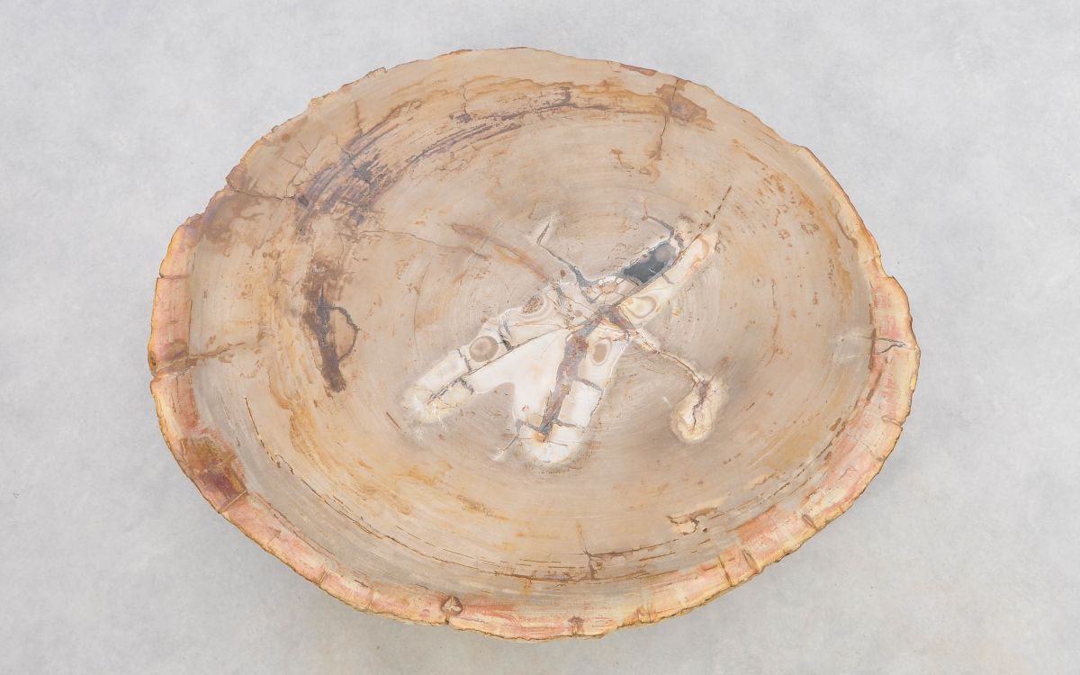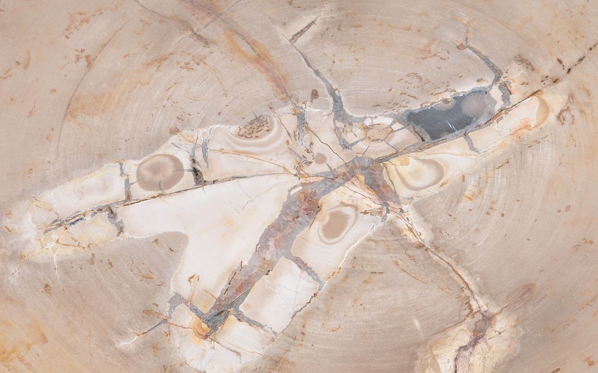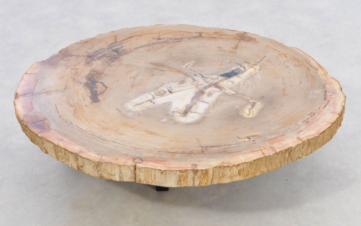 Deze unieke salontafel van versteend hout past in ieder interieur. Het tafelblad is gezaagd uit een grote versteende boom, die ongeveer 20 miljoen jaar geleden geleefd heeft. De kleuren zijn bepaald door de mineralen die het hout van deze boom vervangen hebben.