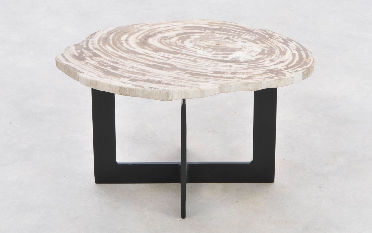 Deze unieke salontafel van versteend hout past in ieder interieur. Het tafelblad is gezaagd uit een grote versteende boom, die ongeveer 20 miljoen jaar geleden geleefd heeft. De kleuren zijn bepaald door de mineralen die het hout van deze boom vervangen hebben.