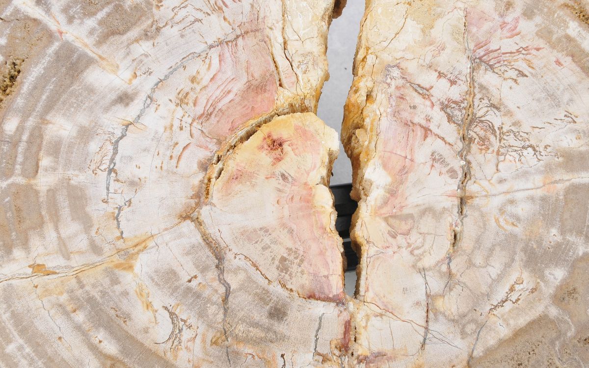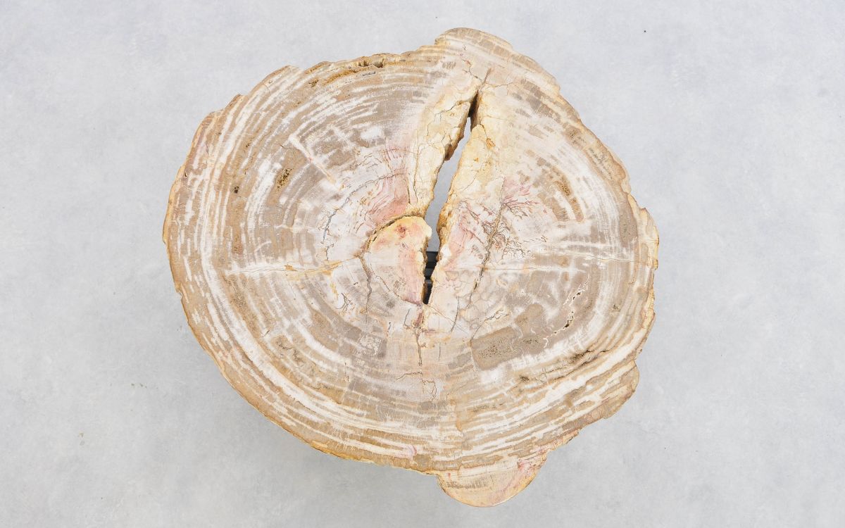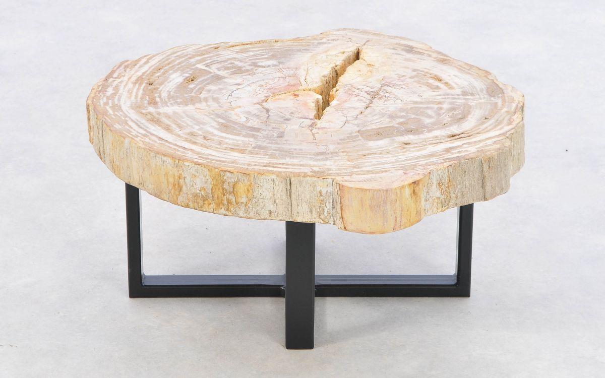 Deze unieke salontafel van versteend hout past in ieder interieur. Het tafelblad is gezaagd uit een grote versteende boom, die ongeveer 20 miljoen jaar geleden geleefd heeft. De kleuren zijn bepaald door de mineralen die het hout van deze boom vervangen hebben.