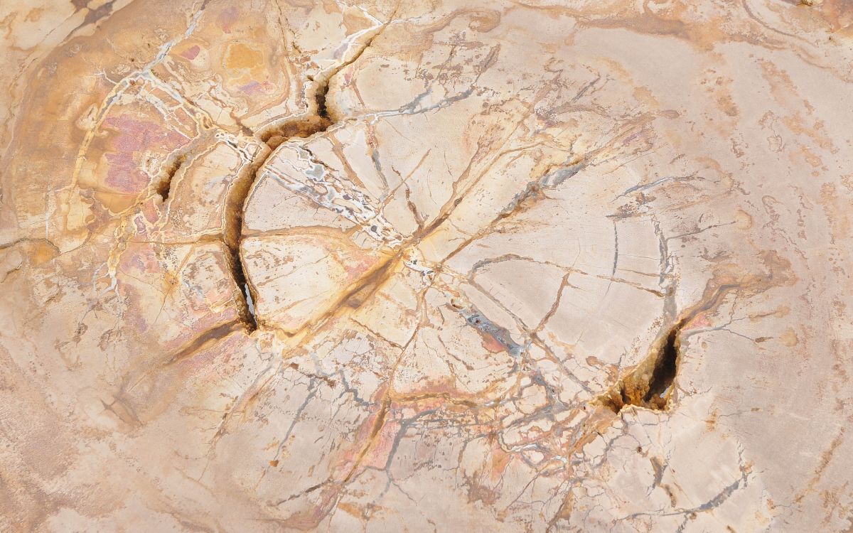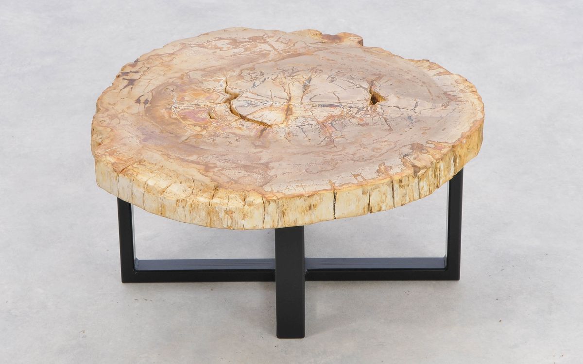 Deze unieke salontafel van versteend hout past in ieder interieur. Het tafelblad is gezaagd uit een grote versteende boom, die ongeveer 20 miljoen jaar geleden geleefd heeft. De kleuren zijn bepaald door de mineralen die het hout van deze boom vervangen hebben.