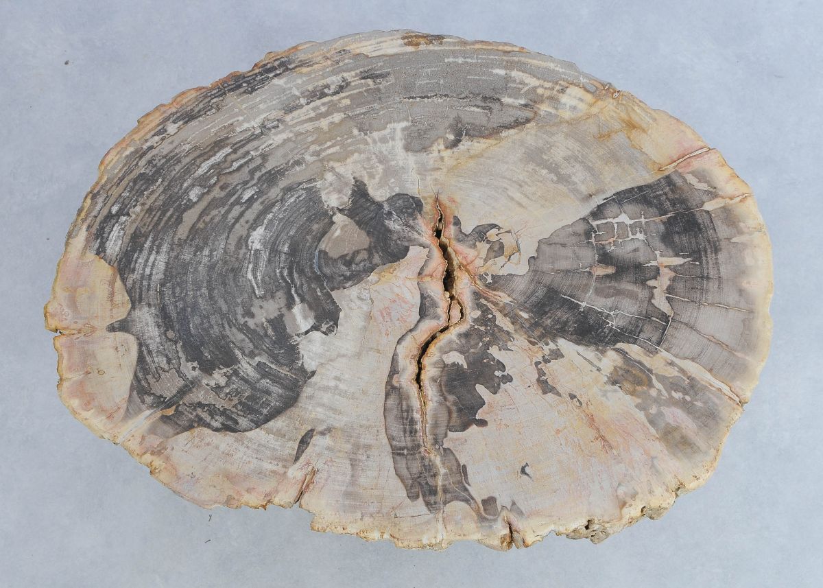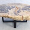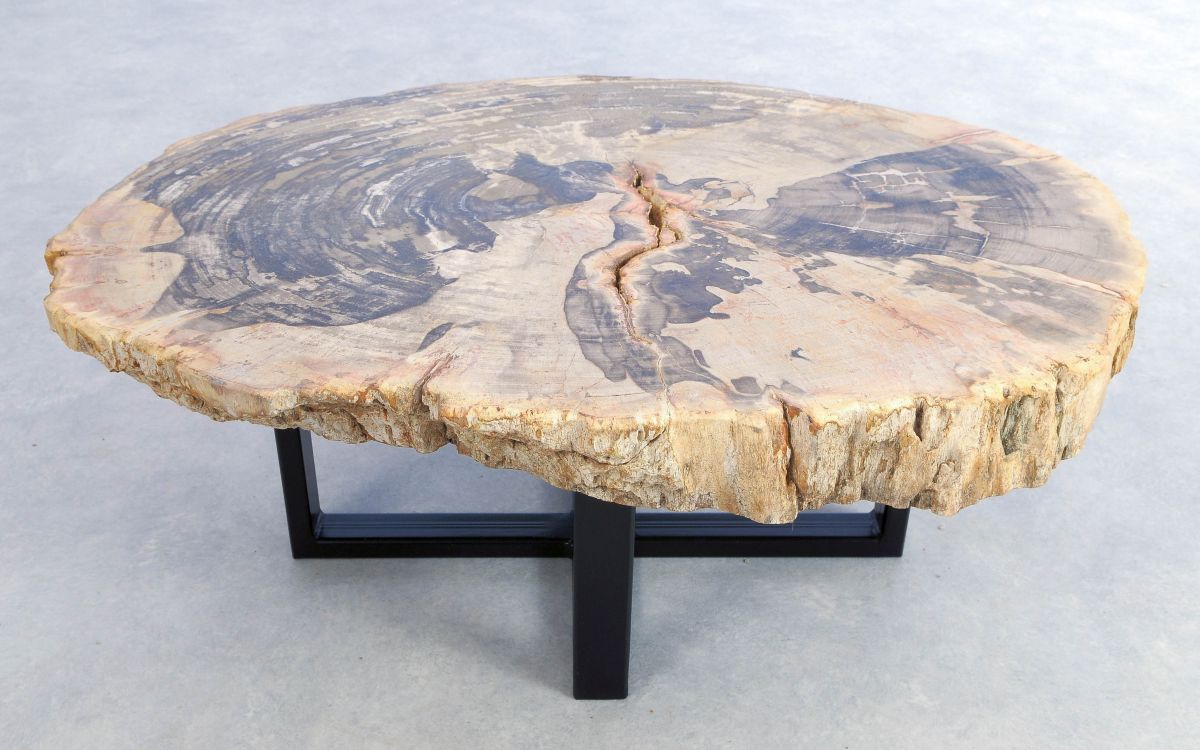 Deze unieke salontafel van versteend hout past in ieder interieur. Het tafelblad is gezaagd uit een grote versteende boom, die ongeveer 20 miljoen jaar geleden geleefd heeft. De kleuren zijn bepaald door de mineralen die het hout van deze boom vervangen hebben.