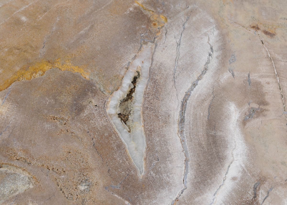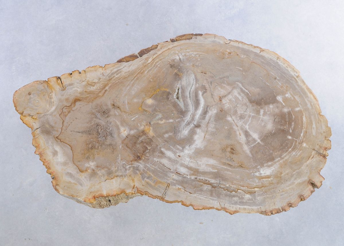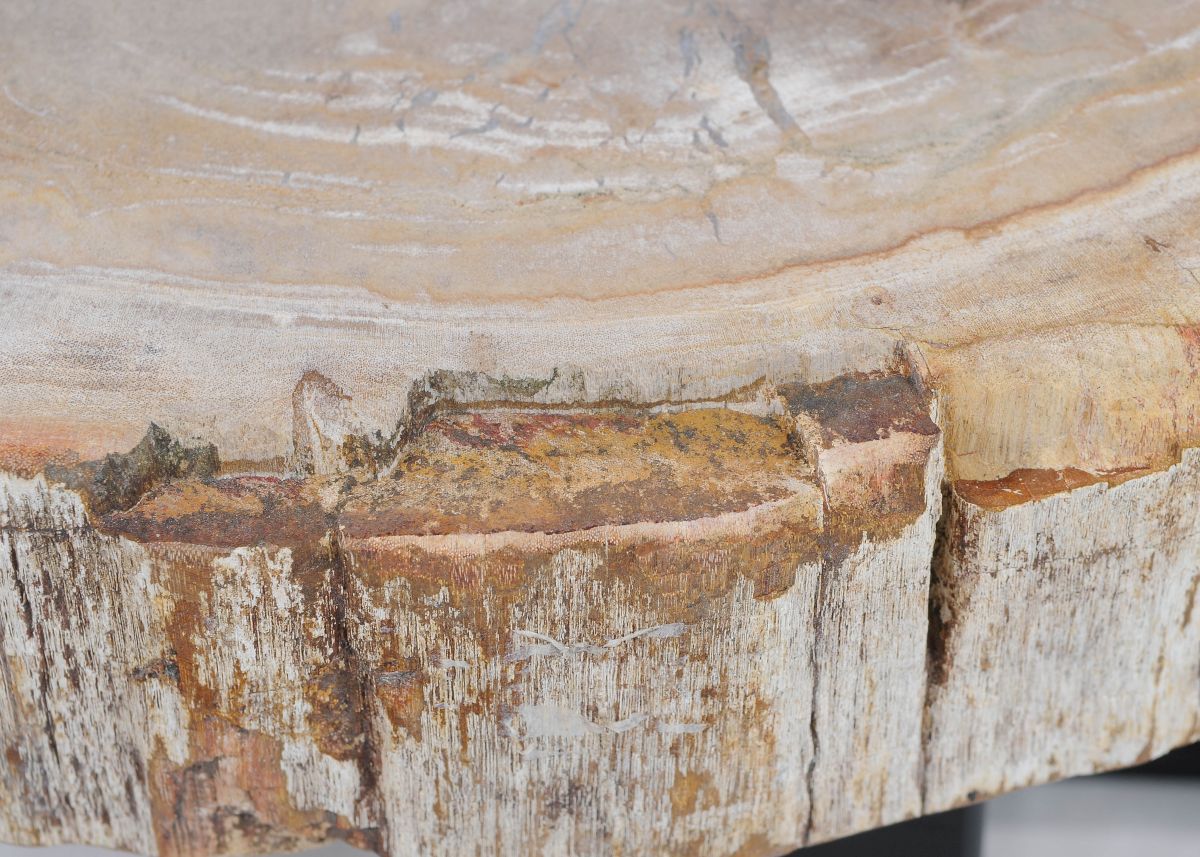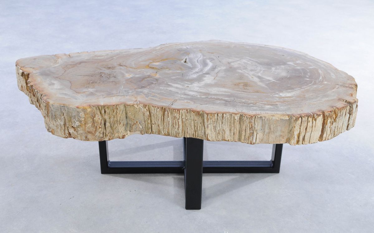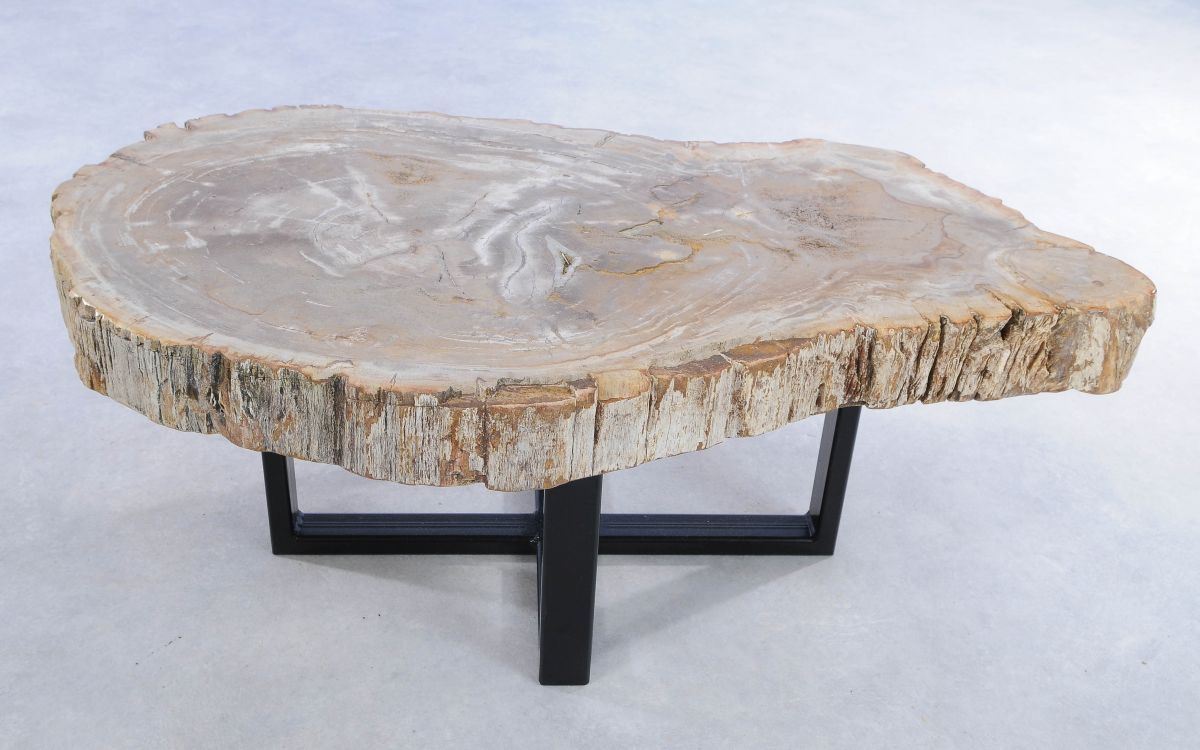 Deze unieke salontafel van versteend hout past in ieder interieur. Het tafelblad is gezaagd uit een grote versteende boom, die ongeveer 20 miljoen jaar geleden geleefd heeft. De kleuren zijn bepaald door de mineralen die het hout van deze boom vervangen hebben.