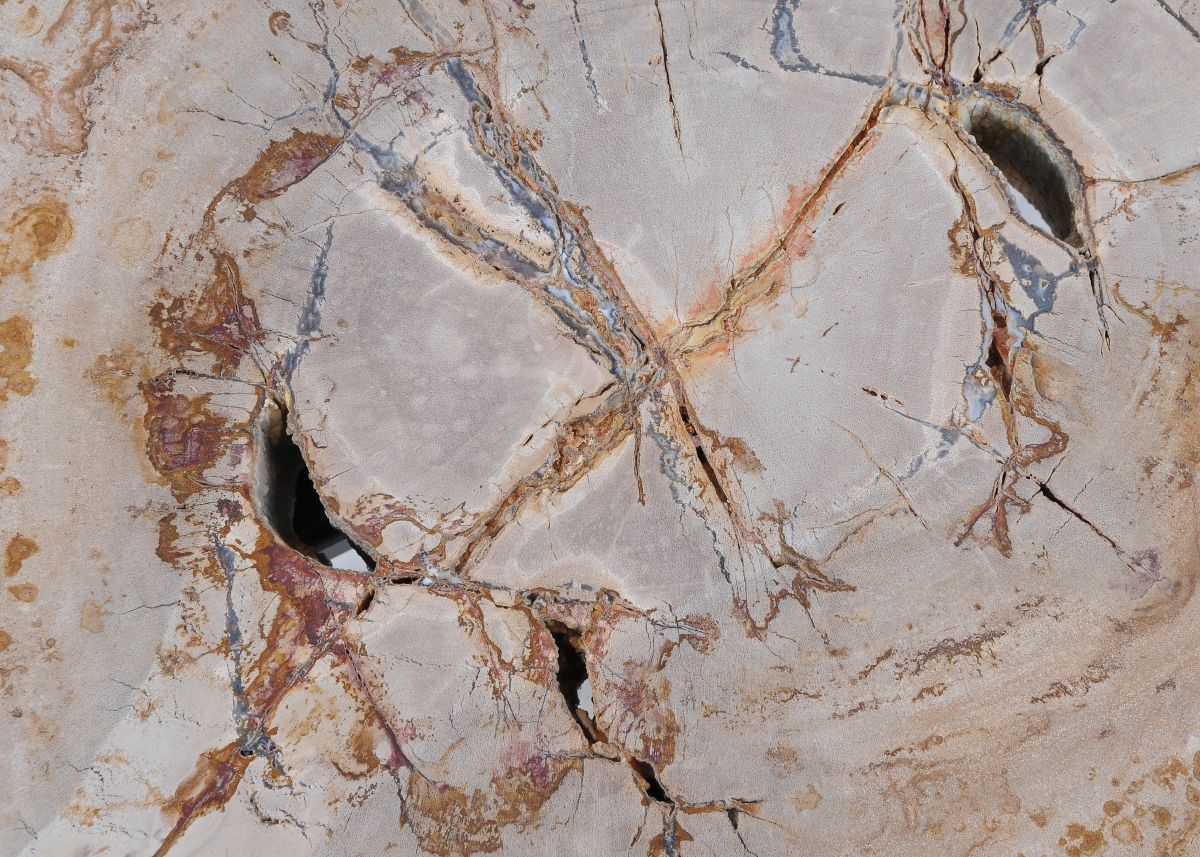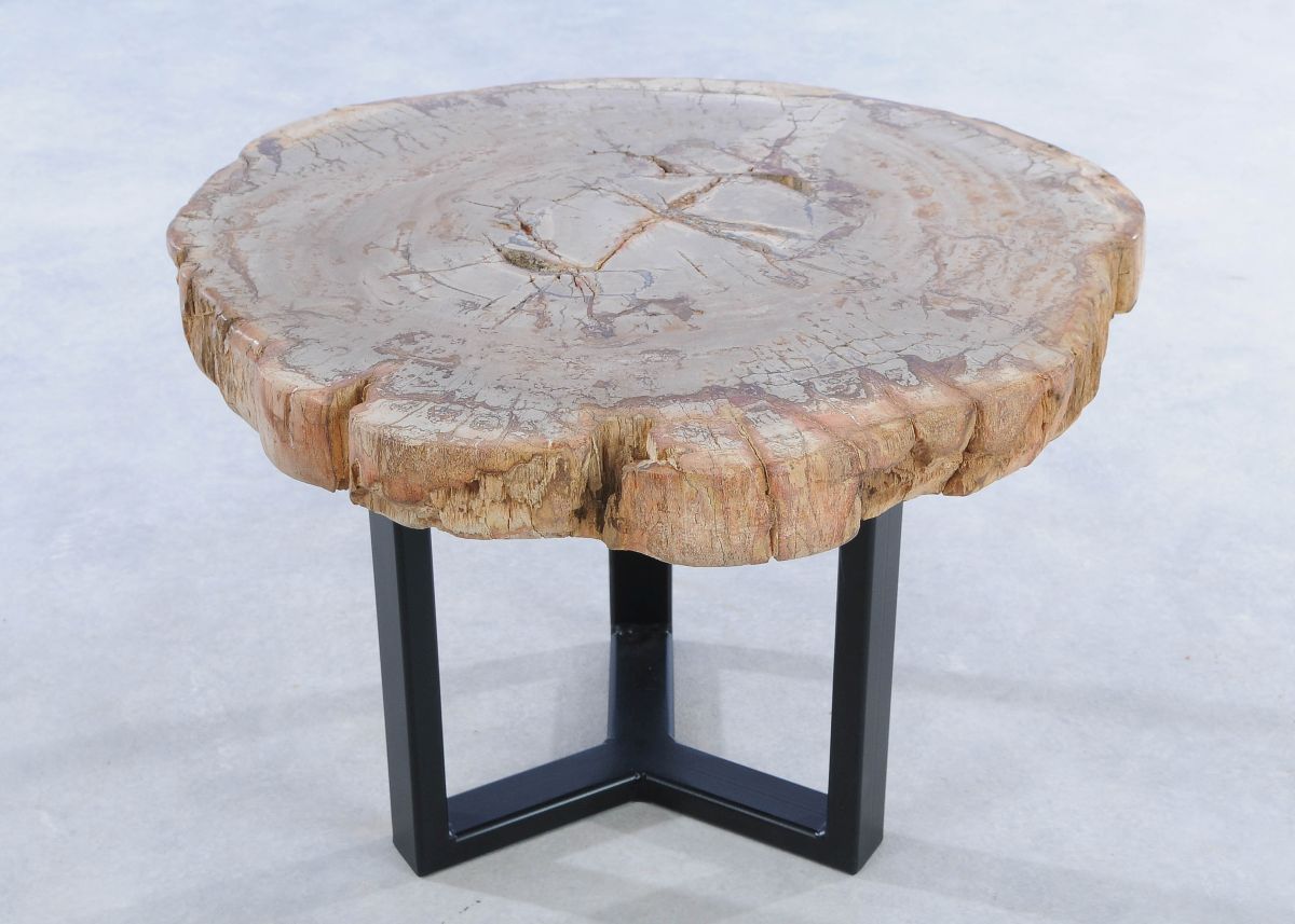 Deze unieke salontafel van versteend hout past in ieder interieur. Het tafelblad is gezaagd uit een grote versteende boom, die ongeveer 20 miljoen jaar geleden geleefd heeft. De kleuren zijn bepaald door de mineralen die het hout van deze boom vervangen hebben.
