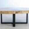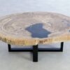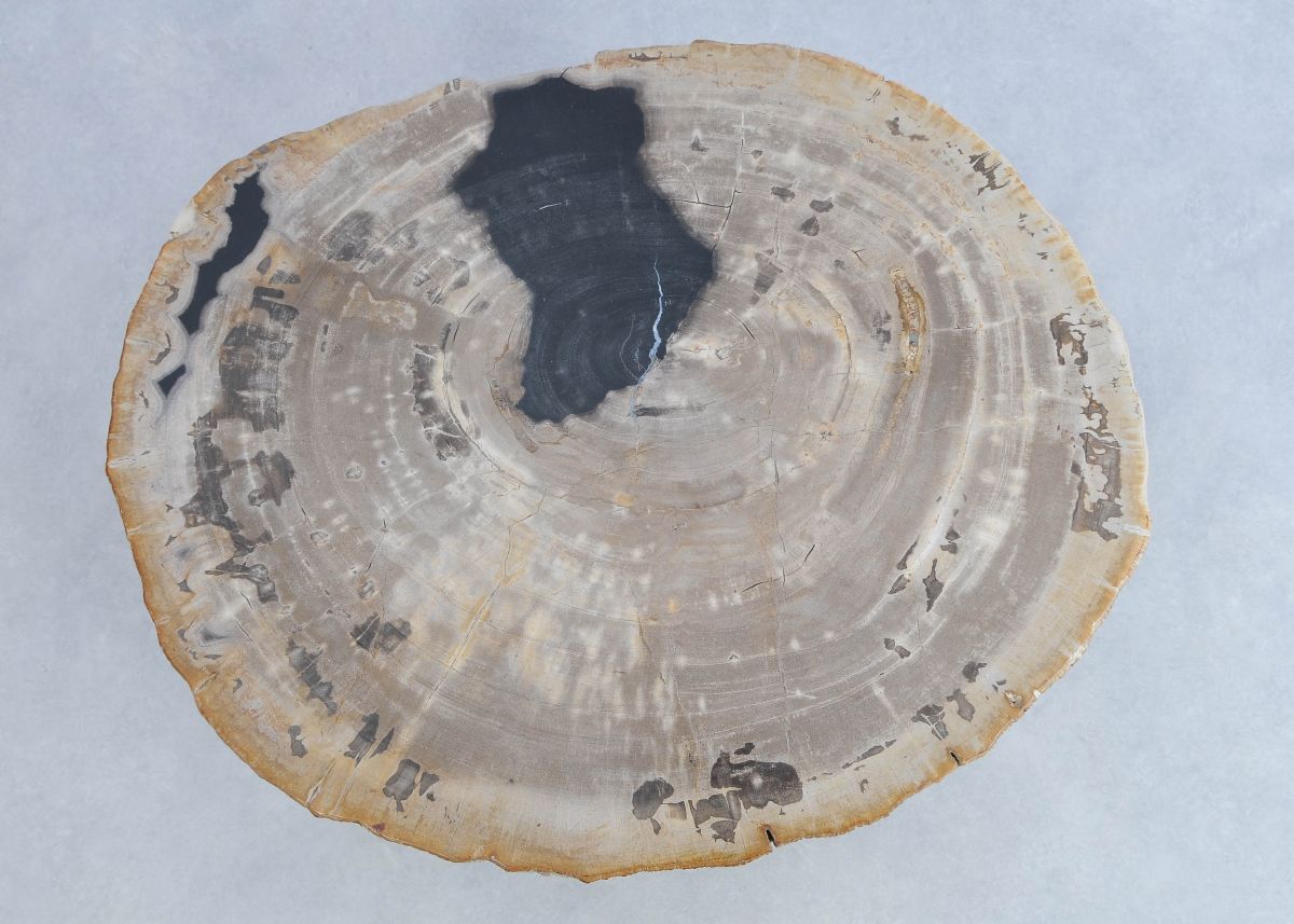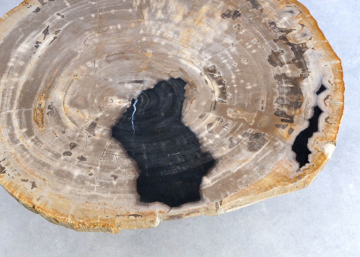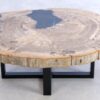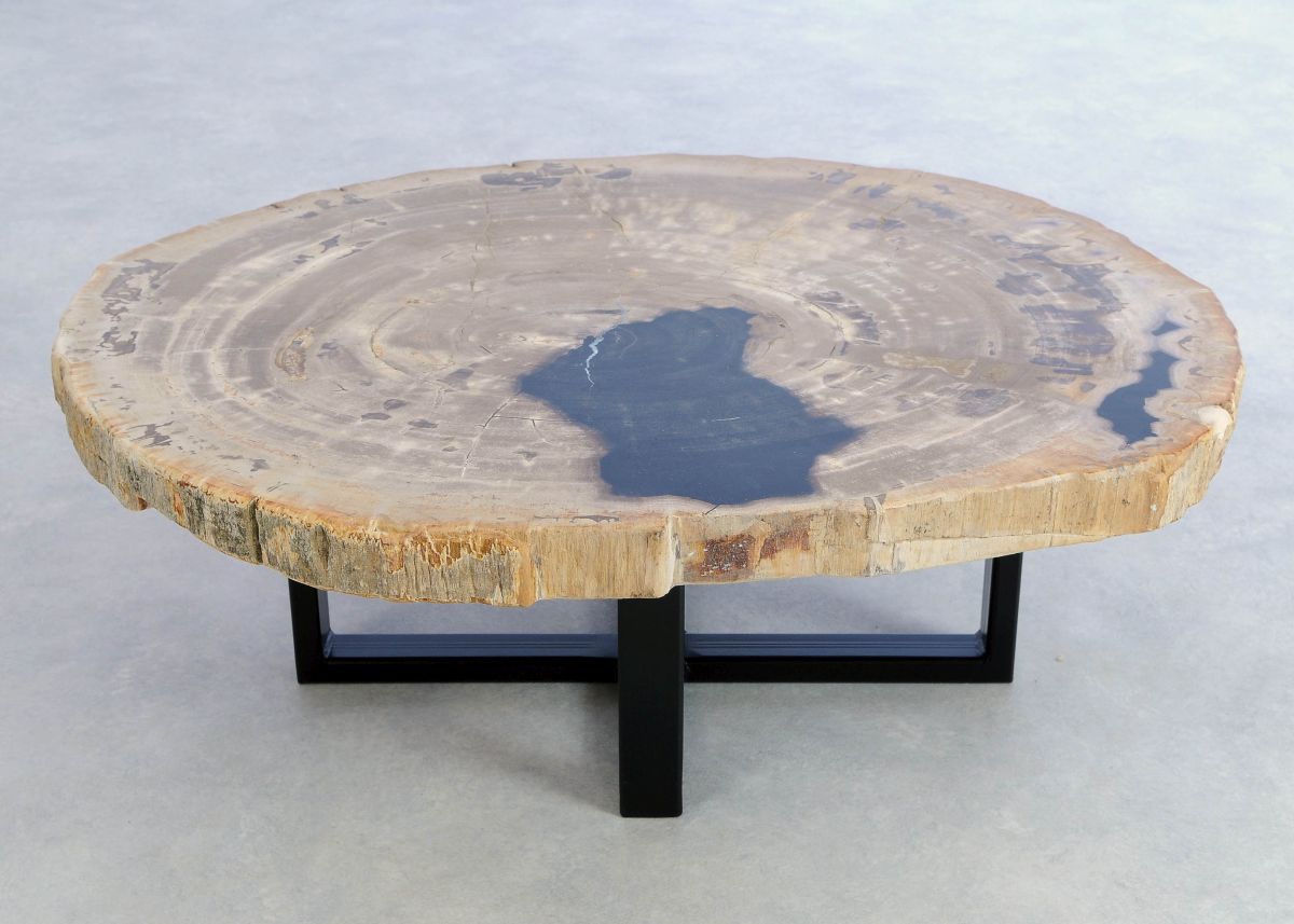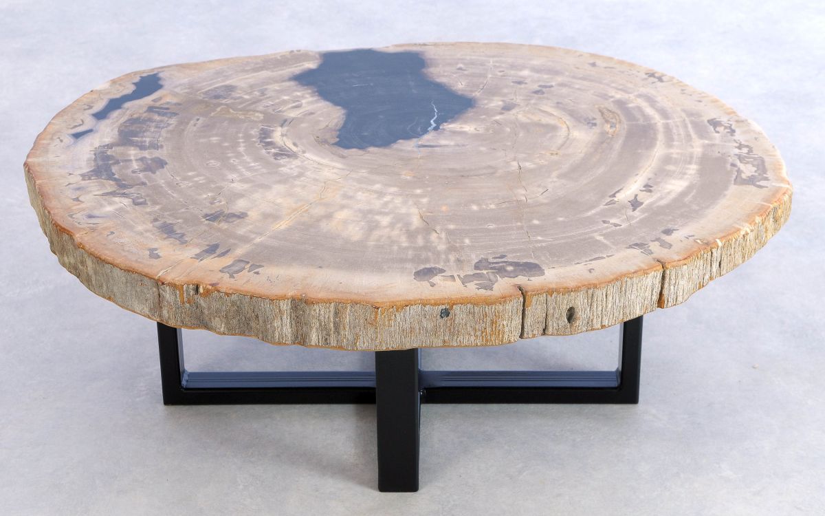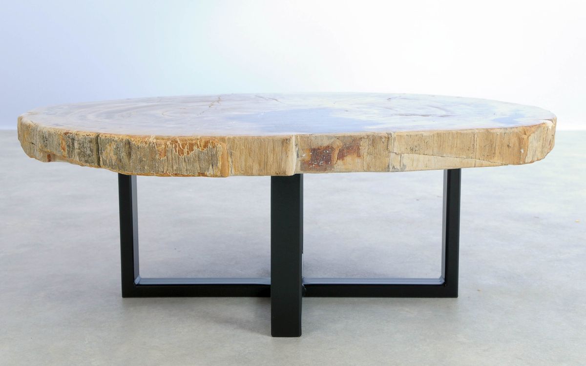 Deze unieke salontafel van versteend hout past in ieder interieur. Het tafelblad is gezaagd uit een grote versteende boom, die ongeveer 20 miljoen jaar geleden geleefd heeft. De kleuren zijn bepaald door de mineralen die het hout van deze boom vervangen hebben.