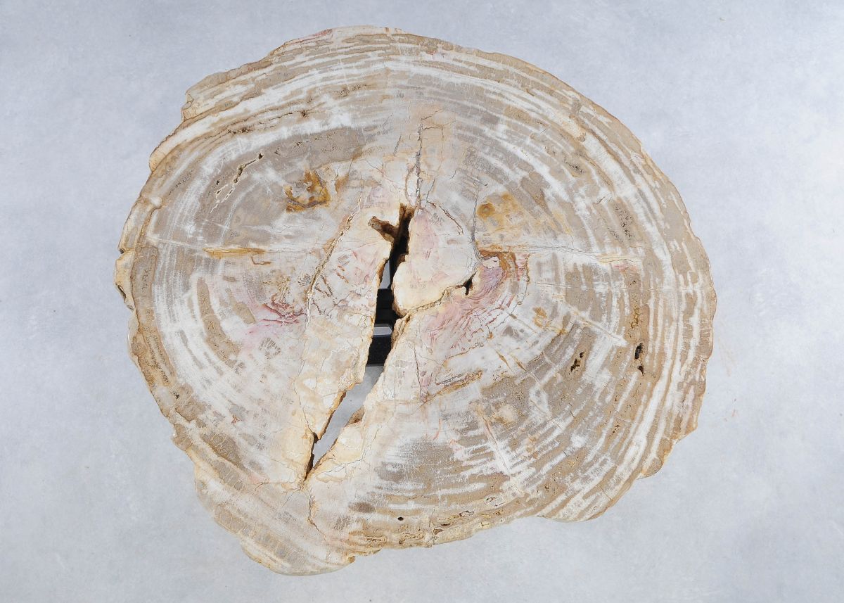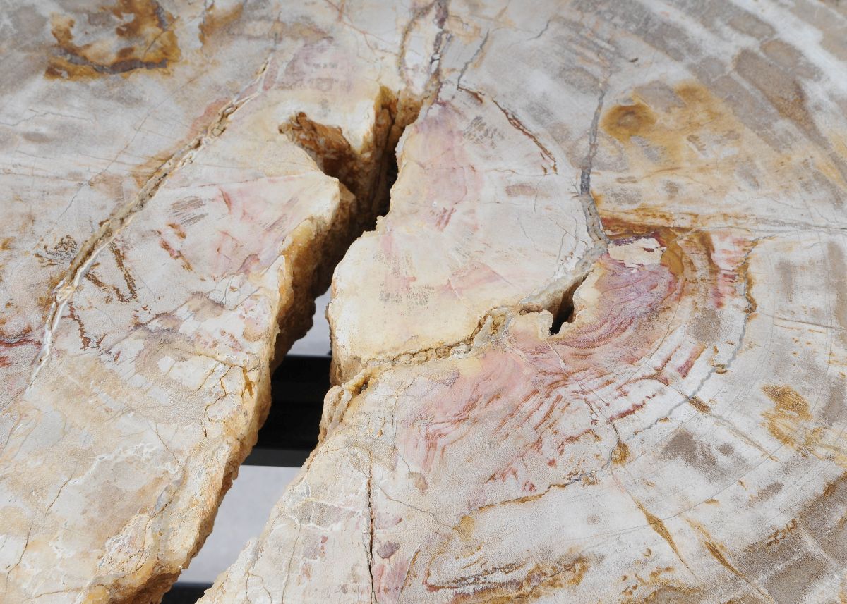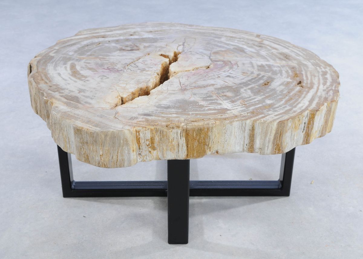 Deze unieke salontafel van versteend hout past in ieder interieur. Het tafelblad is gezaagd uit een grote versteende boom, die ongeveer 20 miljoen jaar geleden geleefd heeft. De kleuren zijn bepaald door de mineralen die het hout van deze boom vervangen hebben.