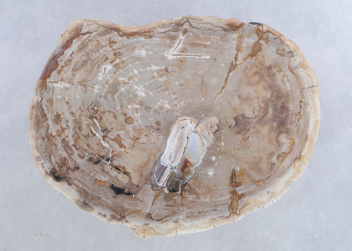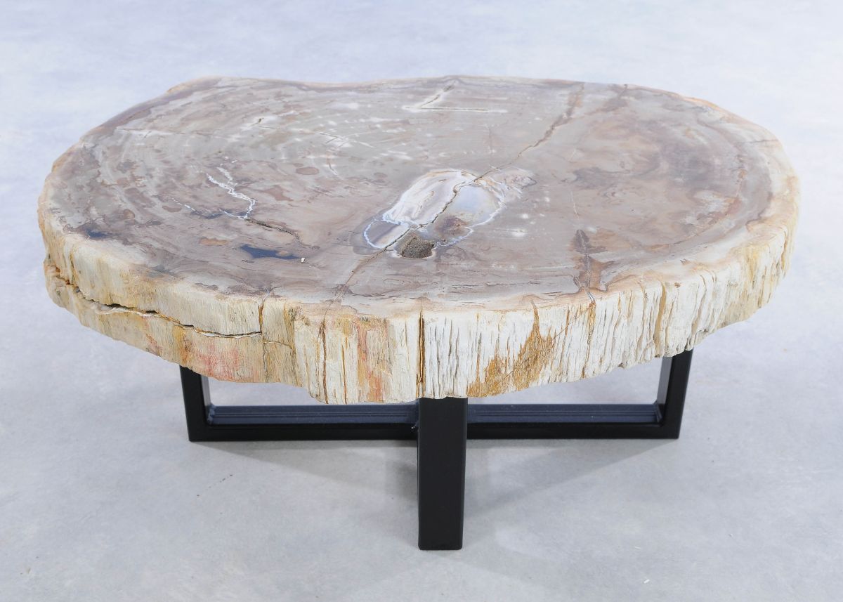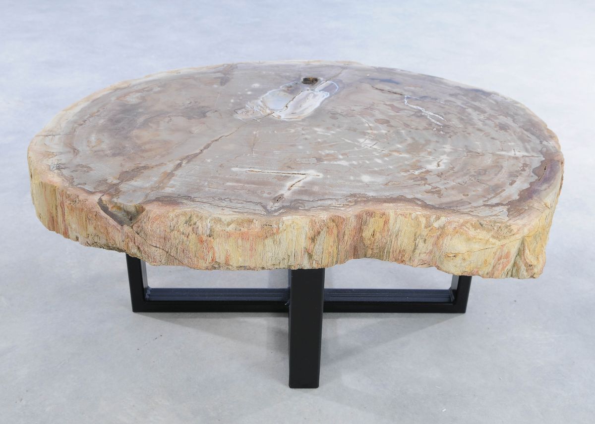 Deze unieke salontafel van versteend hout past in ieder interieur. Het tafelblad is gezaagd uit een grote versteende boom, die ongeveer 20 miljoen jaar geleden geleefd heeft. De kleuren zijn bepaald door de mineralen die het hout van deze boom vervangen hebben.