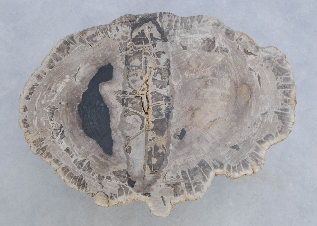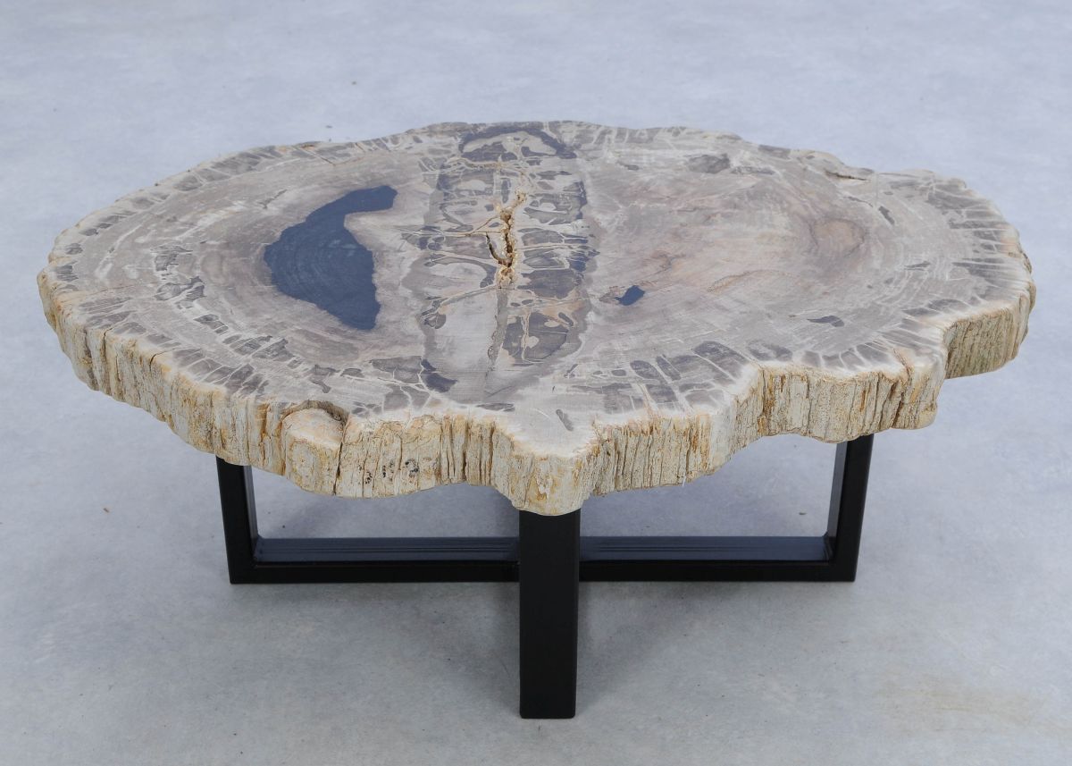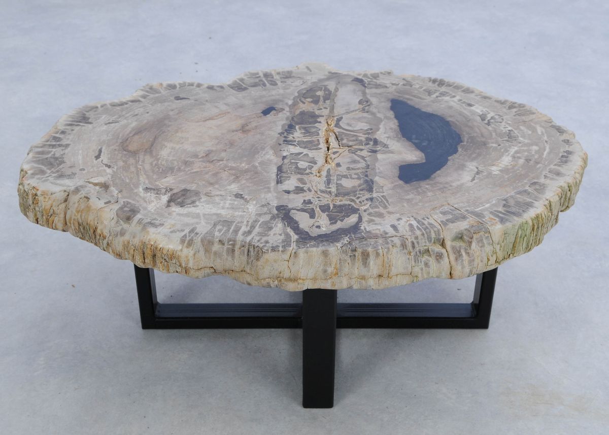 Deze unieke salontafel van versteend hout past in ieder interieur. Het tafelblad is gezaagd uit een grote versteende boom, die ongeveer 20 miljoen jaar geleden geleefd heeft. De kleuren zijn bepaald door de mineralen die het hout van deze boom vervangen hebben.