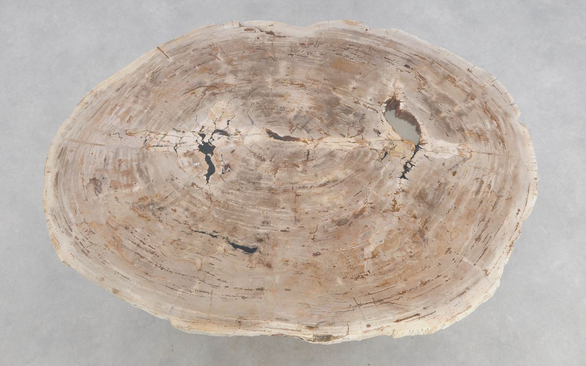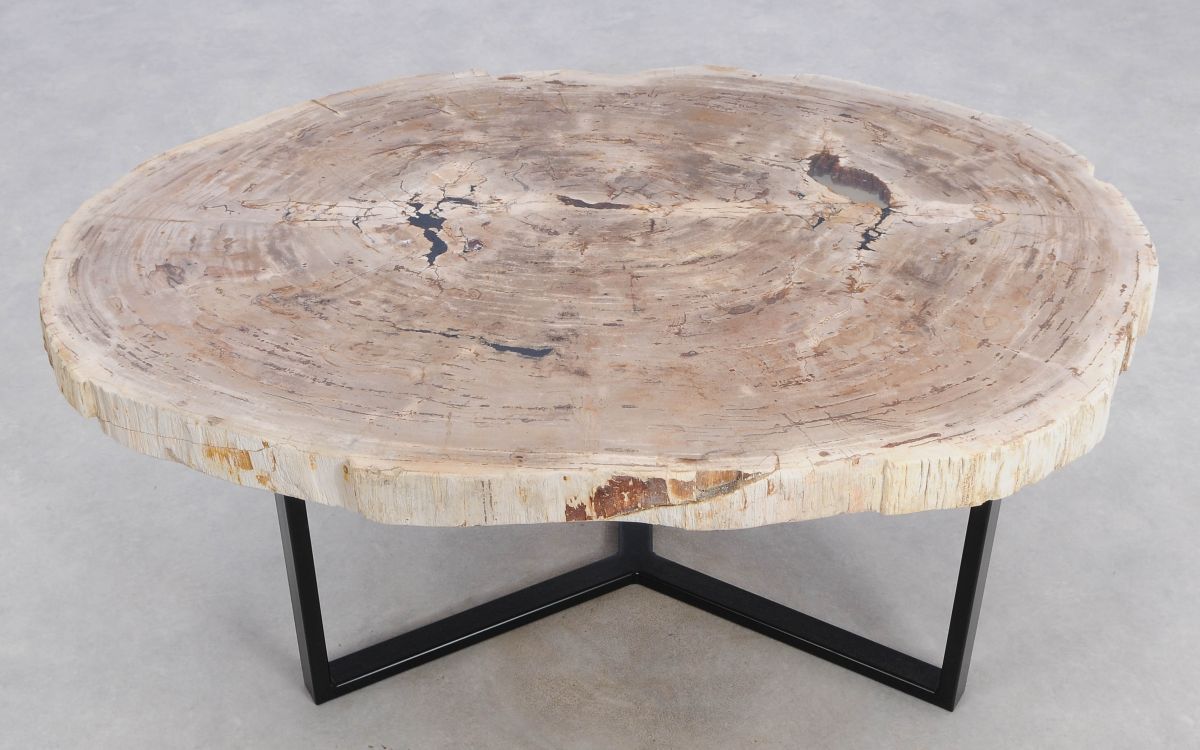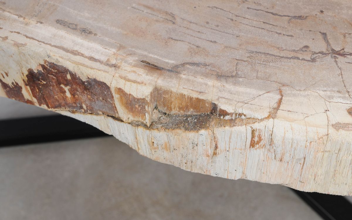 Deze unieke salontafel van versteend hout past in ieder interieur. Het tafelblad is gezaagd uit een grote versteende boom, die ongeveer 20 miljoen jaar geleden geleefd heeft. De kleuren zijn bepaald door de mineralen die het hout van deze boom vervangen hebben.