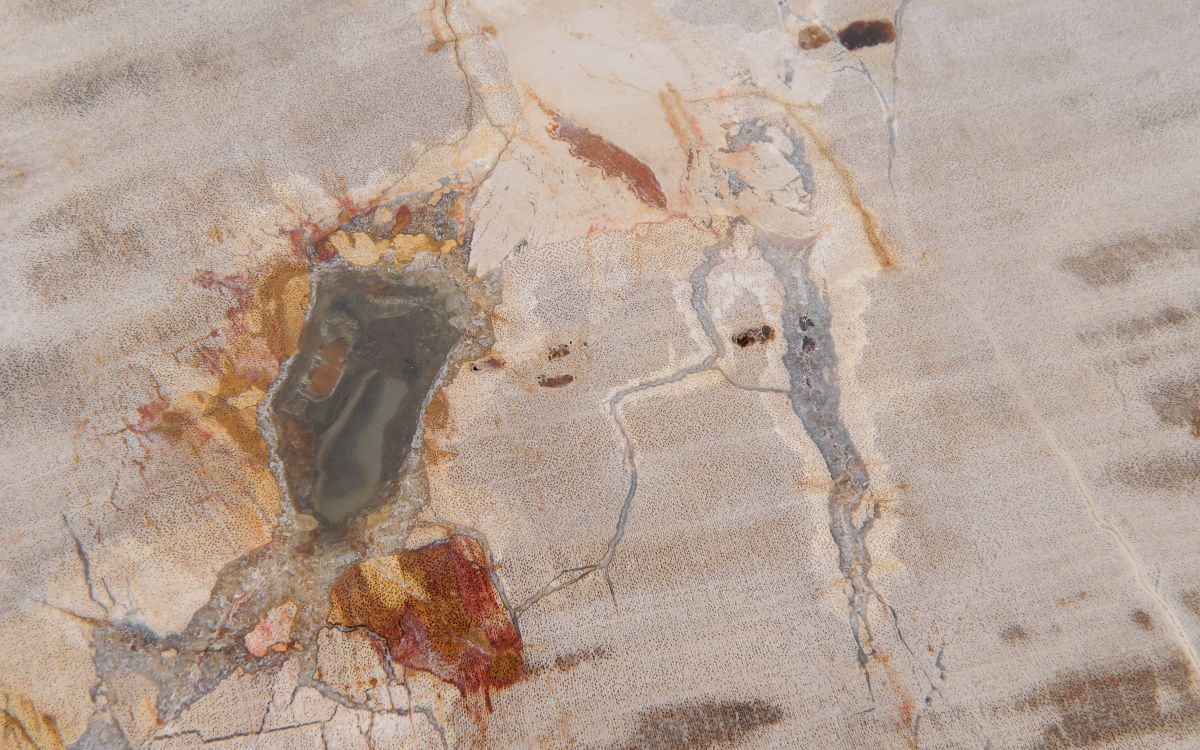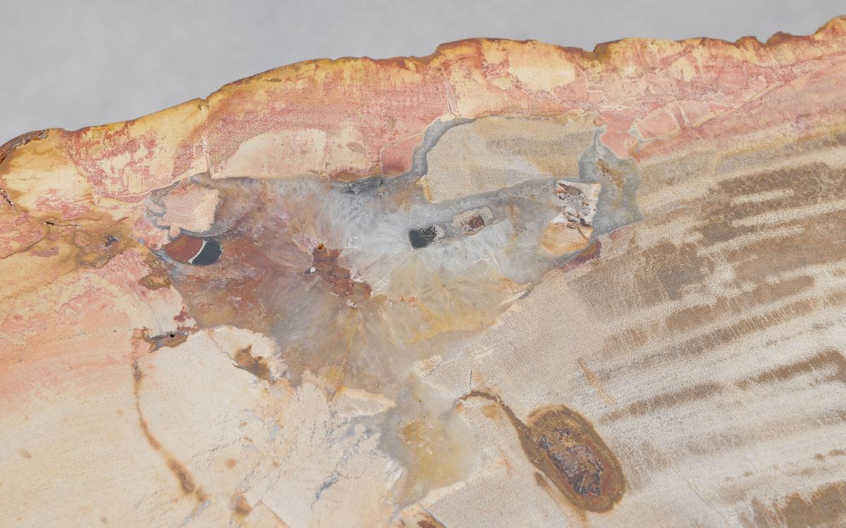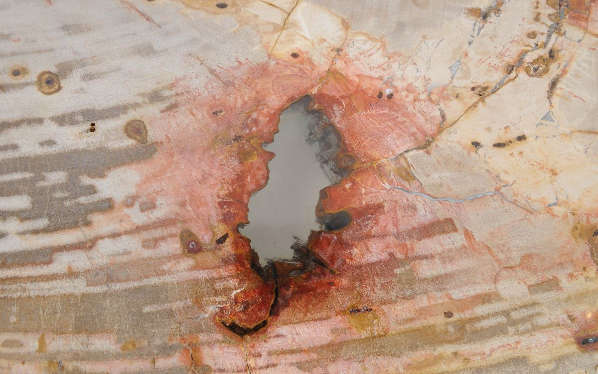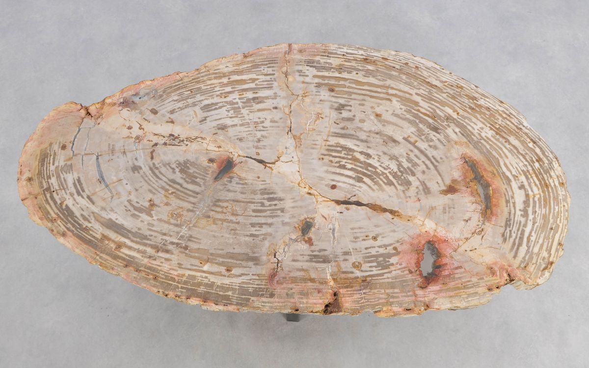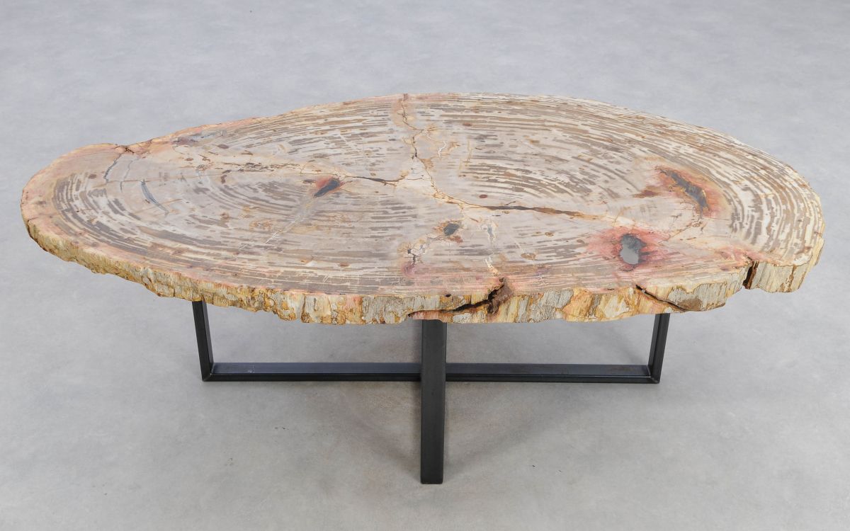 Deze unieke salontafel van versteend hout past in ieder interieur. Het tafelblad is gezaagd uit een grote versteende boom, die ongeveer 20 miljoen jaar geleden geleefd heeft. De kleuren zijn bepaald door de mineralen die het hout van deze boom vervangen hebben.