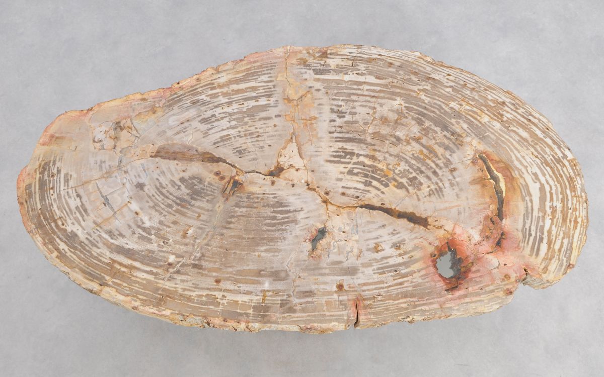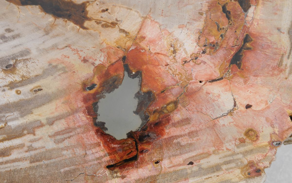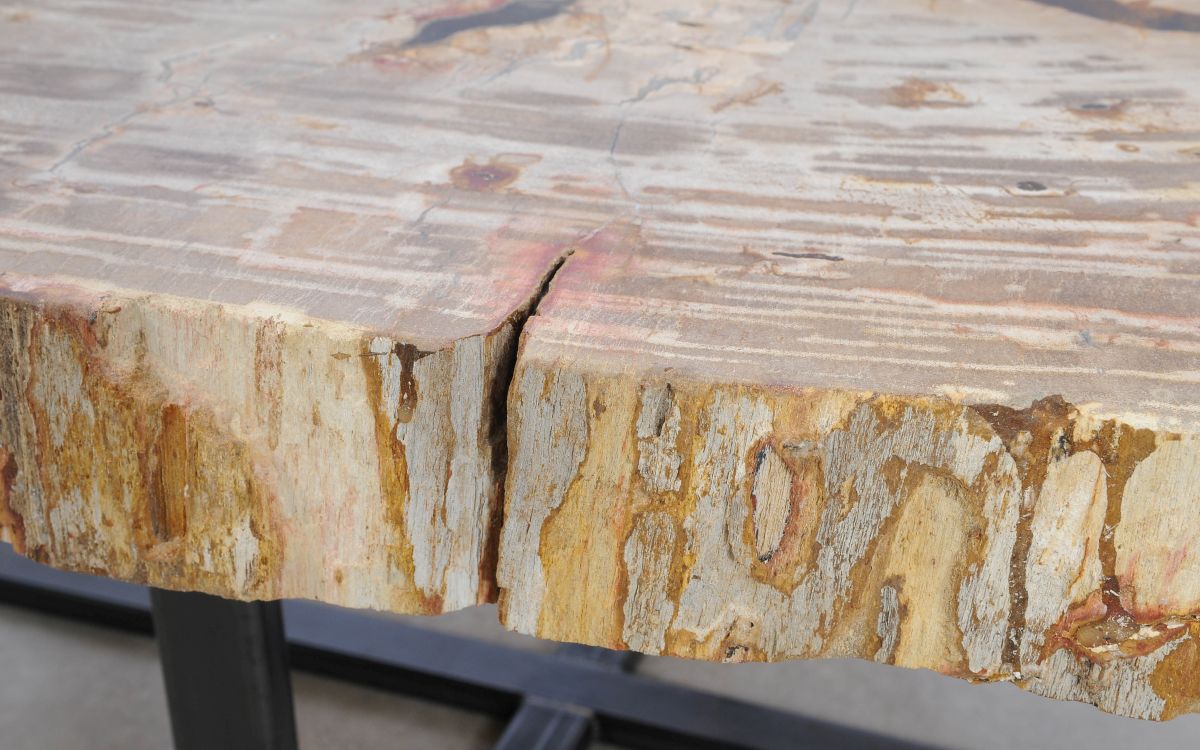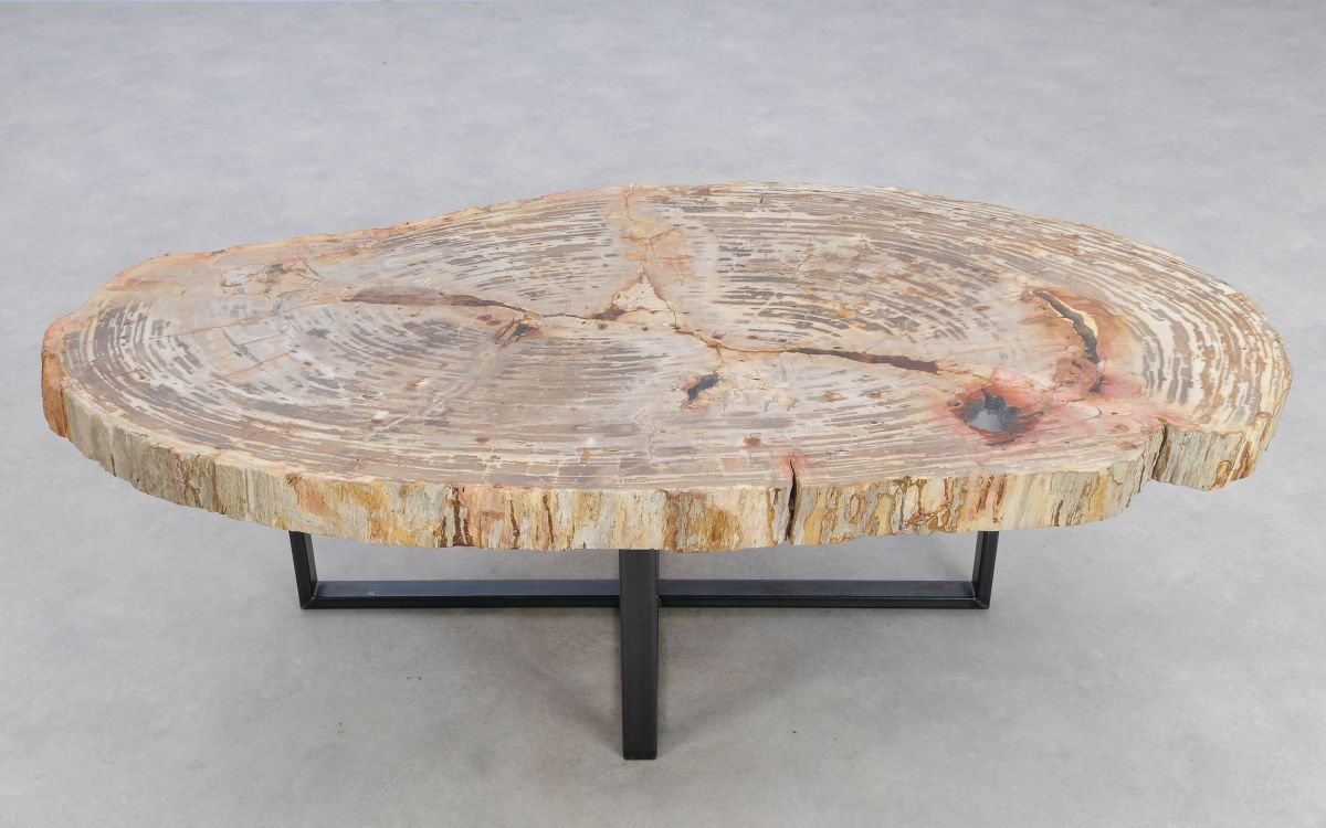 Deze unieke salontafel van versteend hout past in ieder interieur. Het tafelblad is gezaagd uit een grote versteende boom, die ongeveer 20 miljoen jaar geleden geleefd heeft. De kleuren zijn bepaald door de mineralen die het hout van deze boom vervangen hebben.