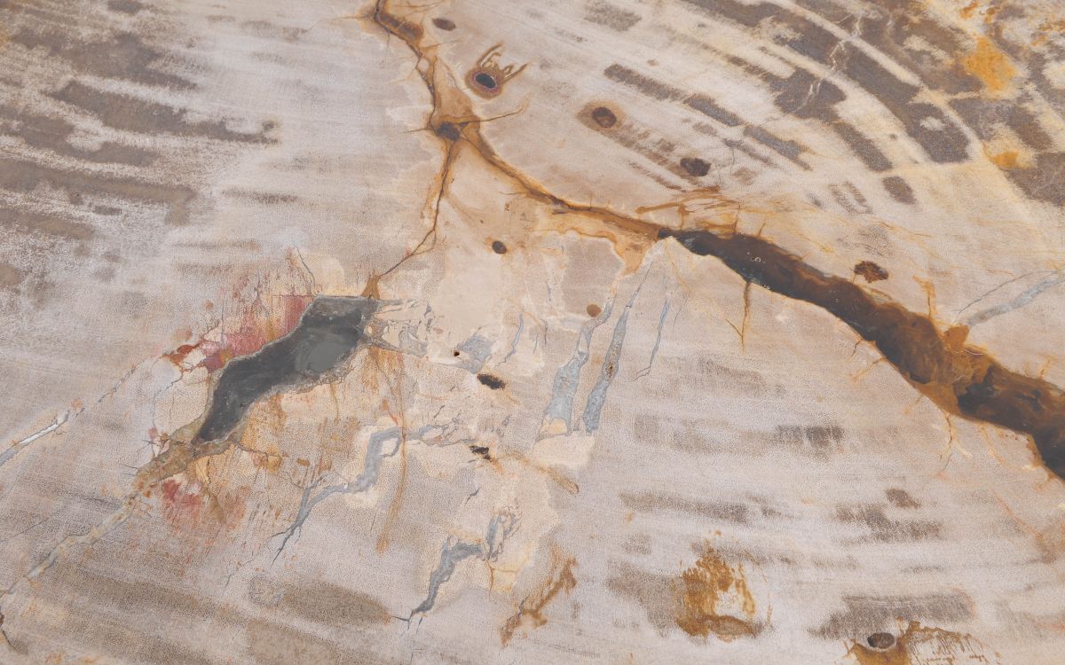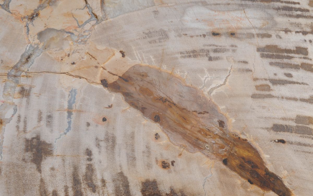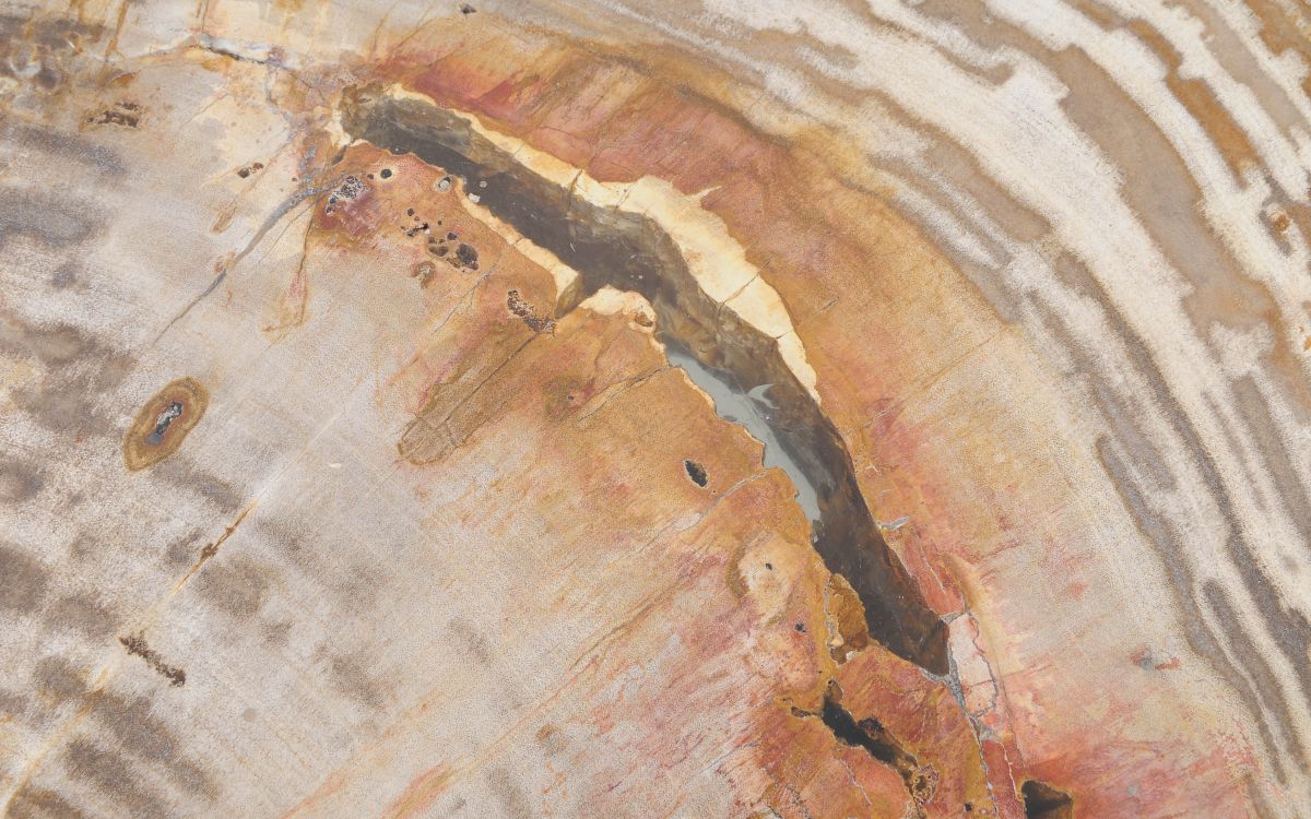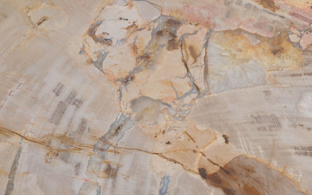 Deze unieke salontafel van versteend hout past in ieder interieur. Het tafelblad is gezaagd uit een grote versteende boom, die ongeveer 20 miljoen jaar geleden geleefd heeft. De kleuren zijn bepaald door de mineralen die het hout van deze boom vervangen hebben.