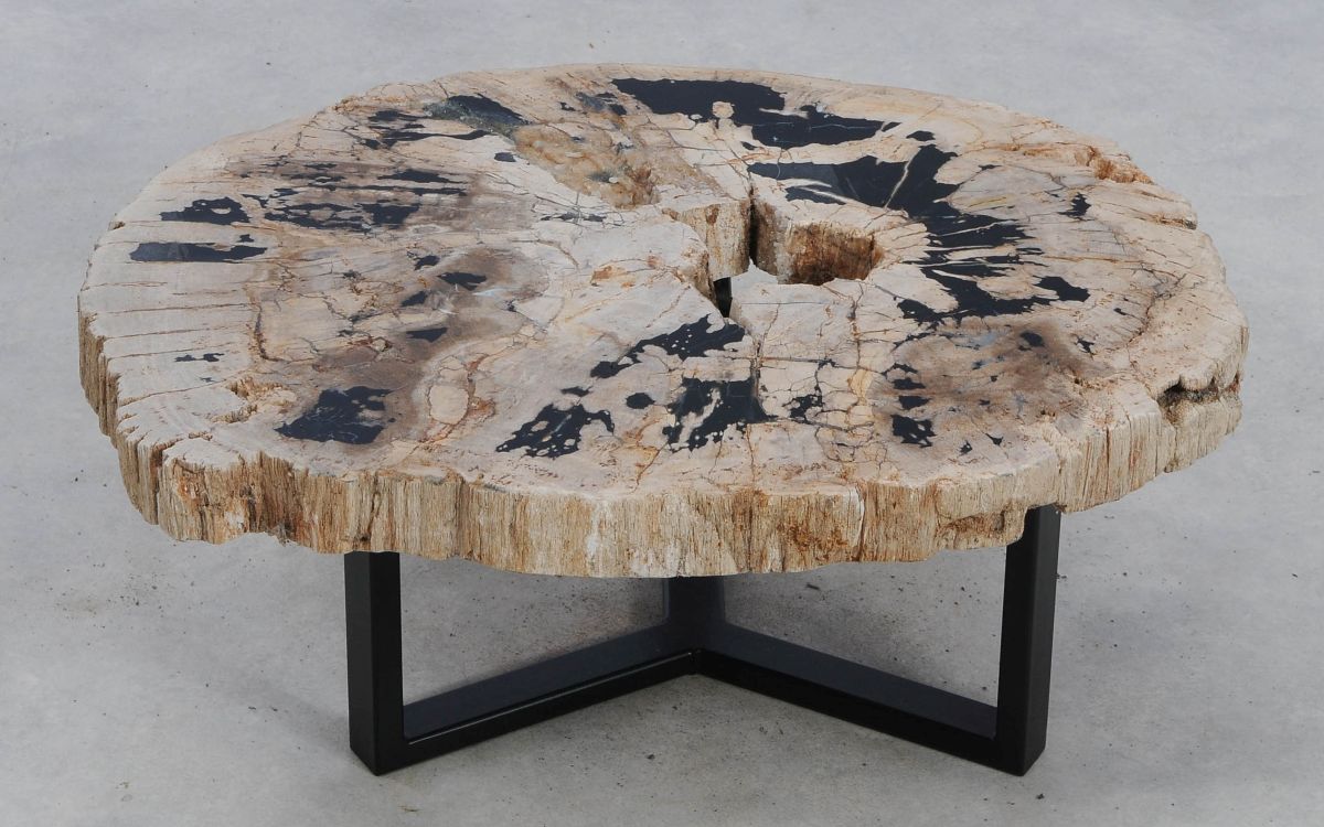 Deze unieke salontafel van versteend hout past in ieder interieur. Het tafelblad is gezaagd uit een grote versteende boom, die ongeveer 20 miljoen jaar geleden geleefd heeft. De kleuren zijn bepaald door de mineralen die het hout van deze boom vervangen hebben.