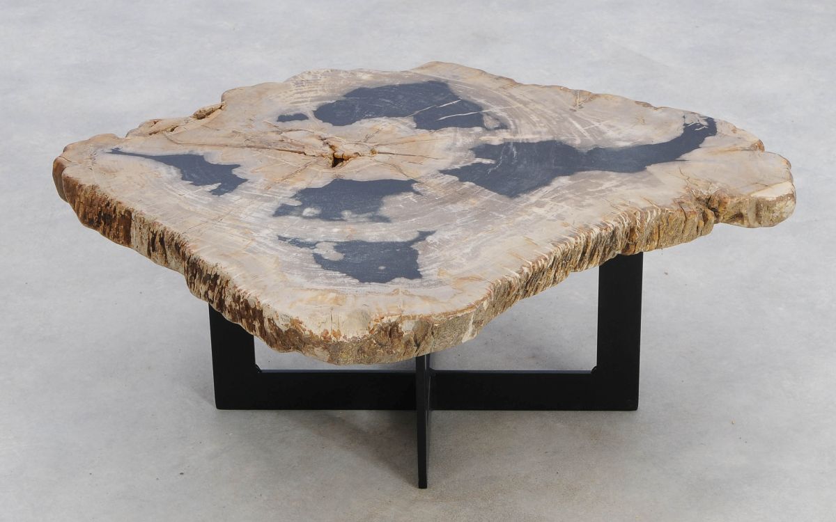 Deze unieke salontafel van versteend hout past in ieder interieur. Het tafelblad is gezaagd uit een grote versteende boom, die ongeveer 20 miljoen jaar geleden geleefd heeft. De kleuren zijn bepaald door de mineralen die het hout van deze boom vervangen hebben.