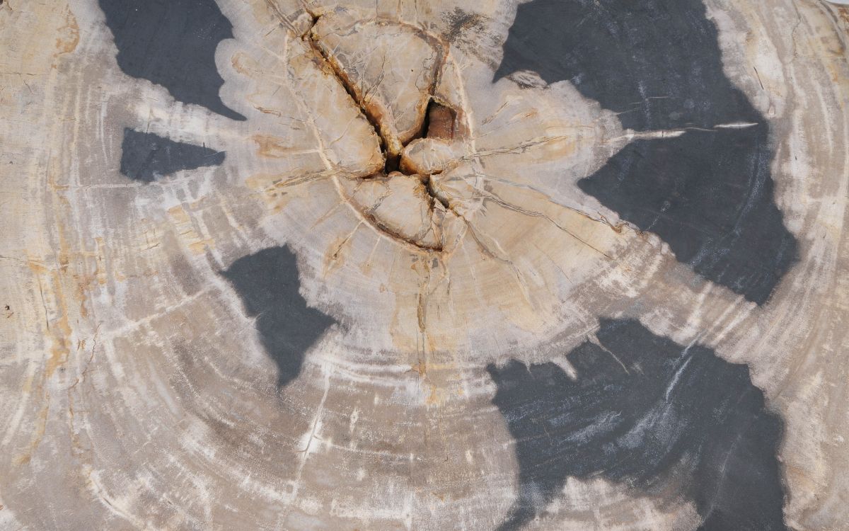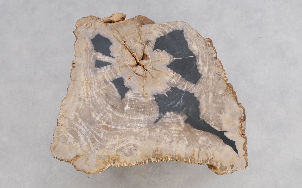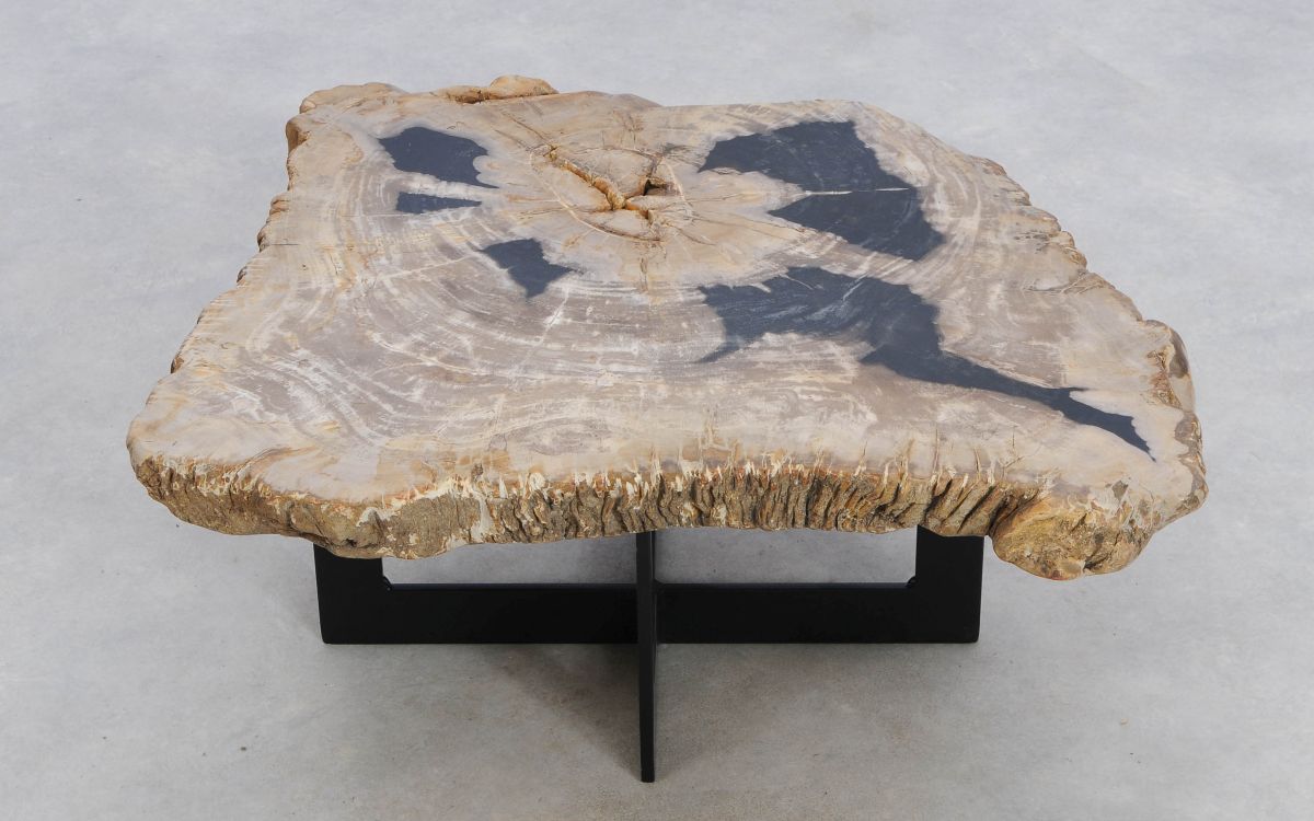 Deze unieke salontafel van versteend hout past in ieder interieur. Het tafelblad is gezaagd uit een grote versteende boom, die ongeveer 20 miljoen jaar geleden geleefd heeft. De kleuren zijn bepaald door de mineralen die het hout van deze boom vervangen hebben.