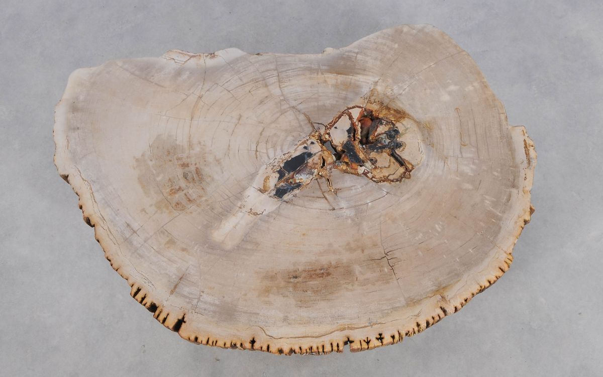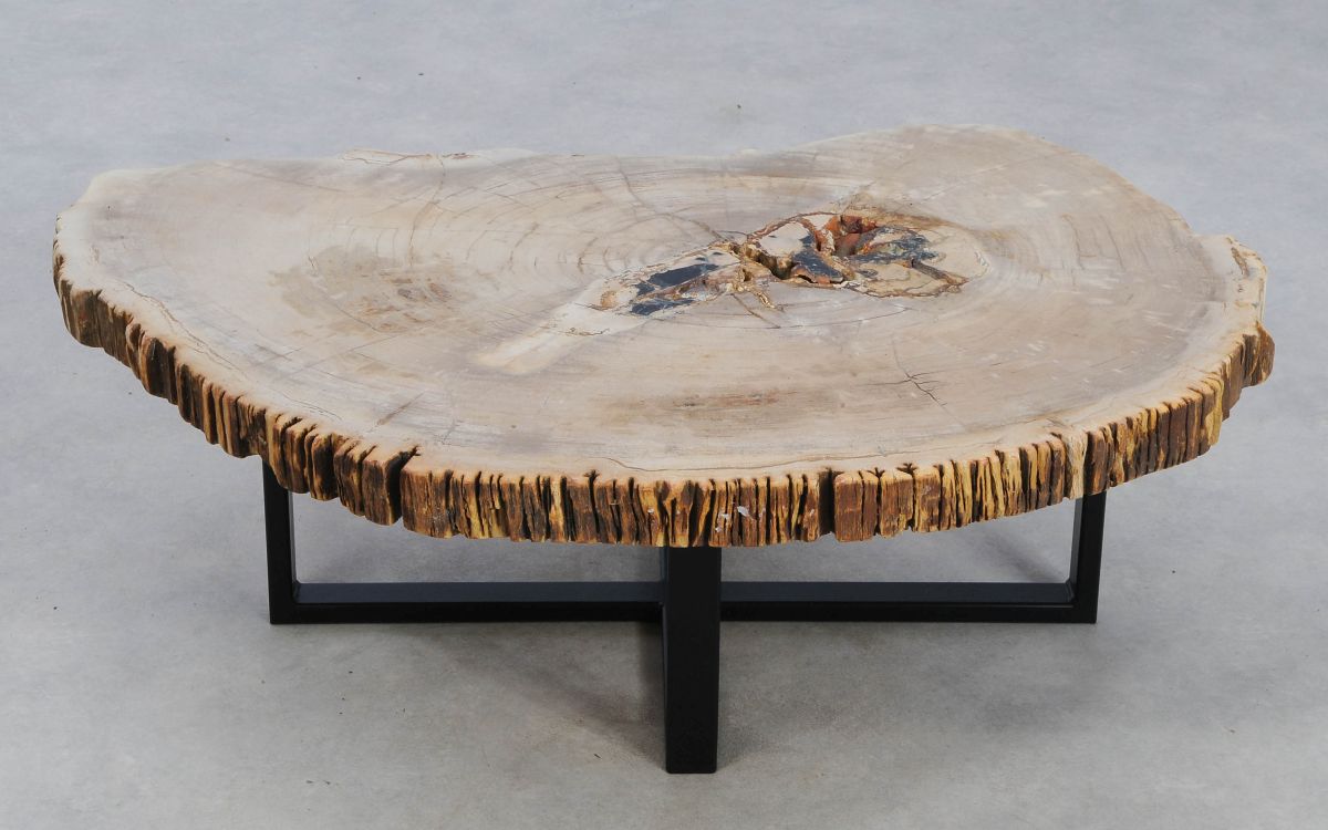 Deze unieke salontafel van versteend hout past in ieder interieur. Het tafelblad is gezaagd uit een grote versteende boom, die ongeveer 20 miljoen jaar geleden geleefd heeft. De kleuren zijn bepaald door de mineralen die het hout van deze boom vervangen hebben.