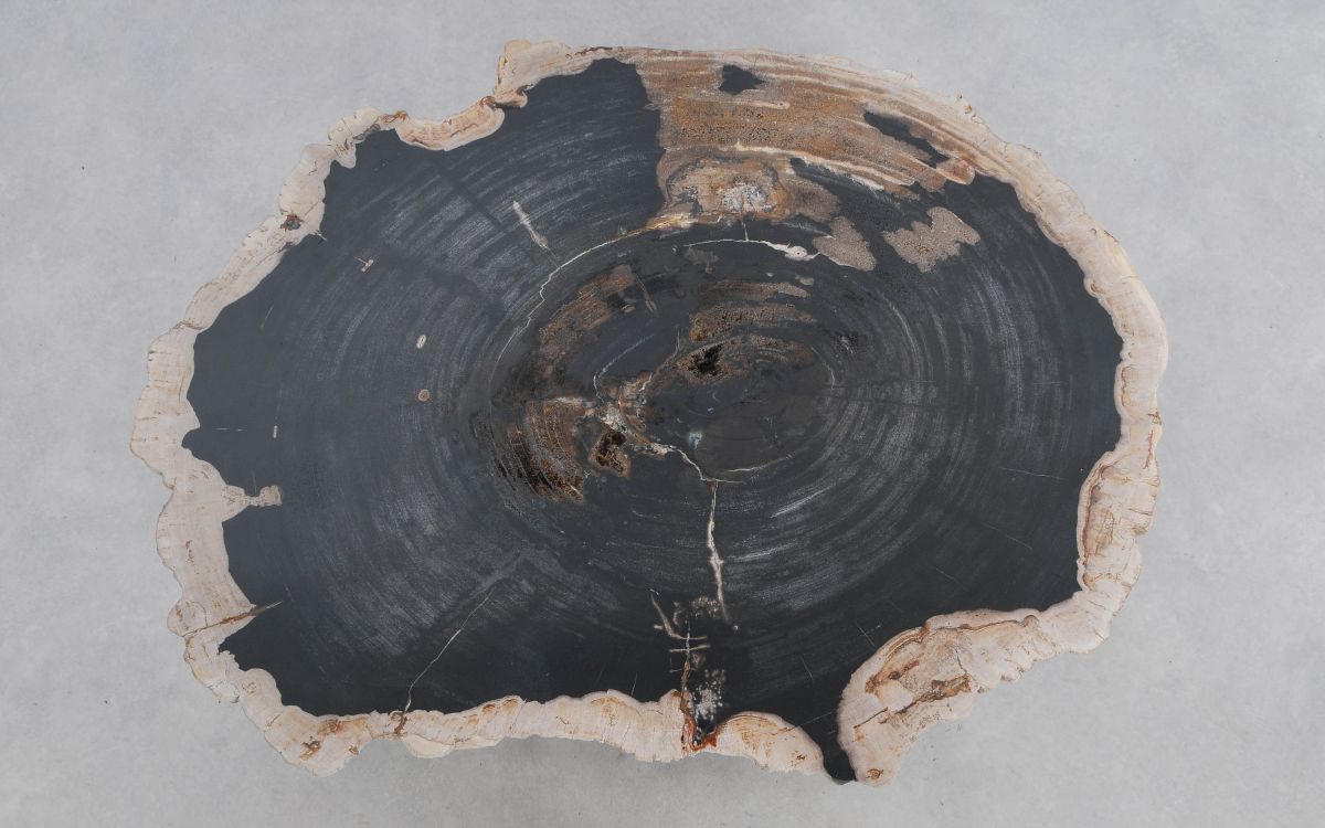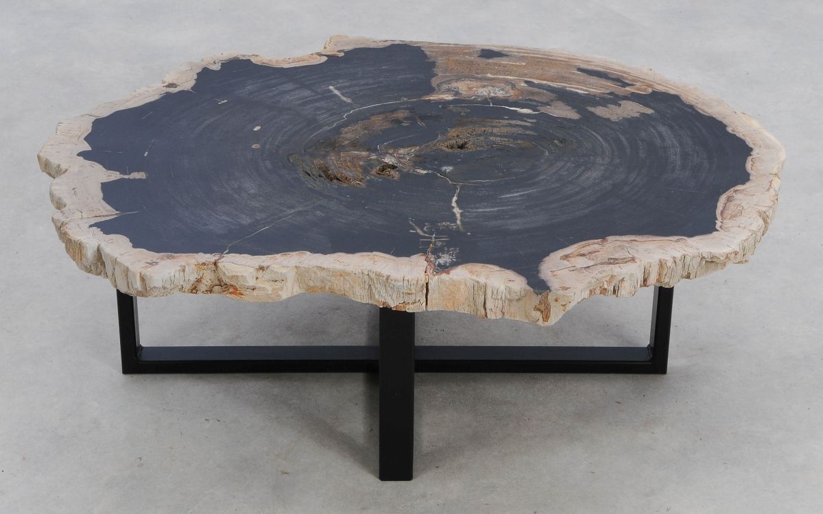 Deze unieke salontafel van versteend hout past in ieder interieur. Het tafelblad is gezaagd uit een grote versteende boom, die ongeveer 20 miljoen jaar geleden geleefd heeft. De kleuren zijn bepaald door de mineralen die het hout van deze boom vervangen hebben.