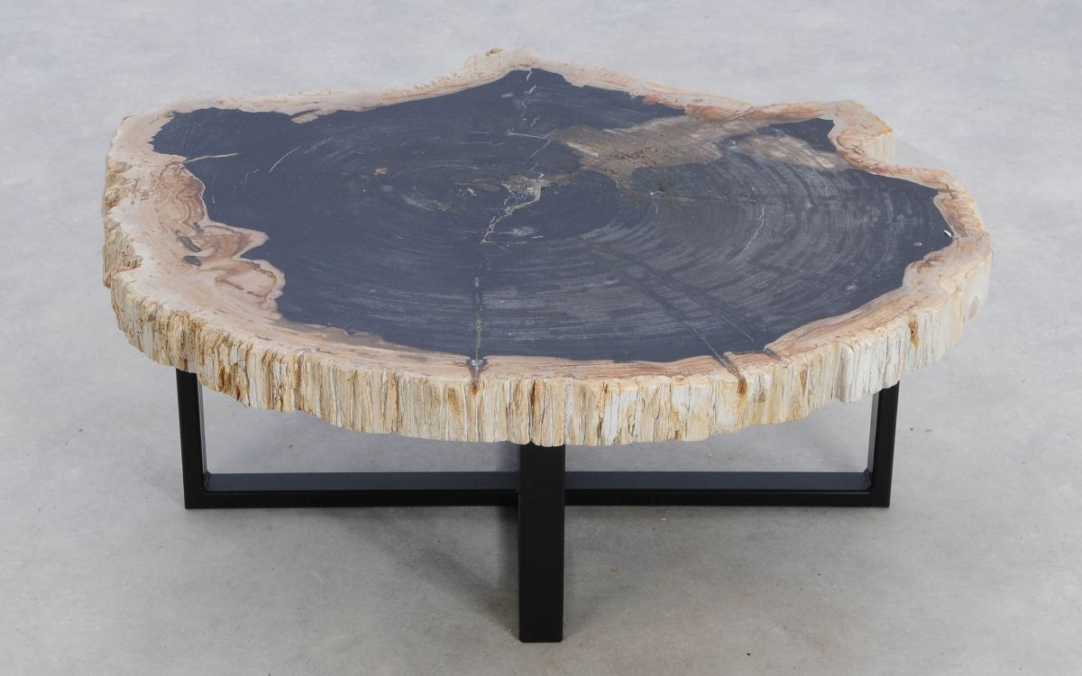 Deze unieke salontafel van versteend hout past in ieder interieur. Het tafelblad is gezaagd uit een grote versteende boom, die ongeveer 20 miljoen jaar geleden geleefd heeft. De kleuren zijn bepaald door de mineralen die het hout van deze boom vervangen hebben.