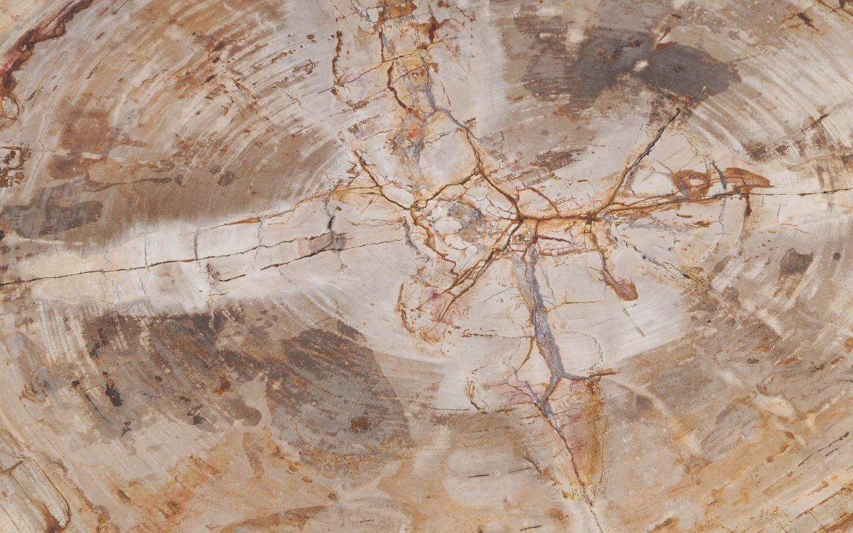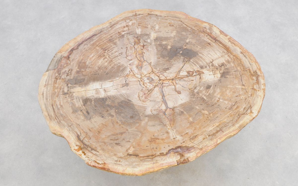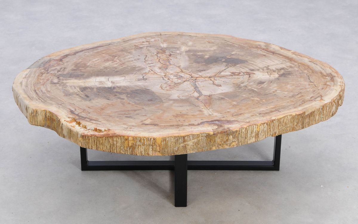 Deze unieke salontafel van versteend hout past in ieder interieur. Het tafelblad is gezaagd uit een grote versteende boom, die ongeveer 20 miljoen jaar geleden geleefd heeft. De kleuren zijn bepaald door de mineralen die het hout van deze boom vervangen hebben.
