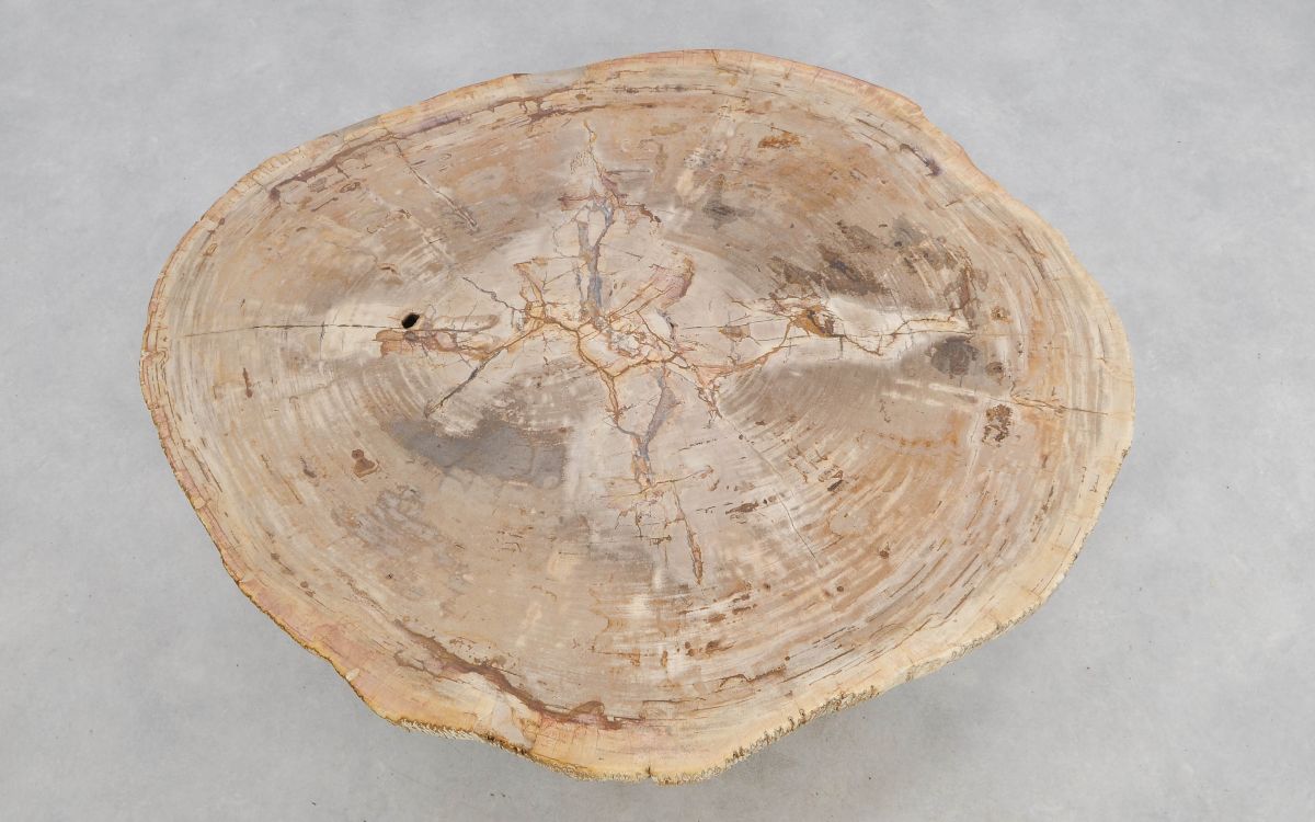 Deze unieke salontafel van versteend hout past in ieder interieur. Het tafelblad is gezaagd uit een grote versteende boom, die ongeveer 20 miljoen jaar geleden geleefd heeft. De kleuren zijn bepaald door de mineralen die het hout van deze boom vervangen hebben.