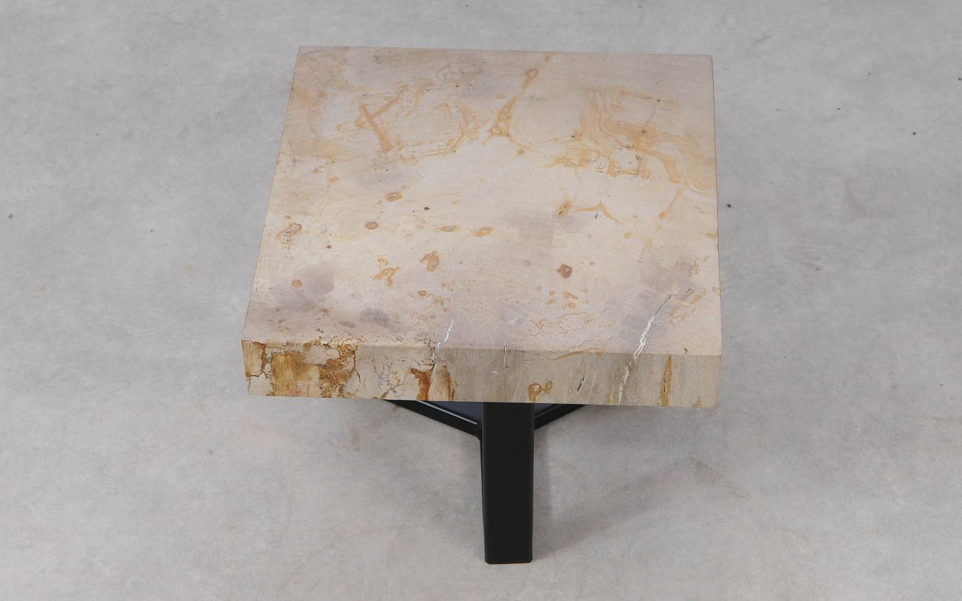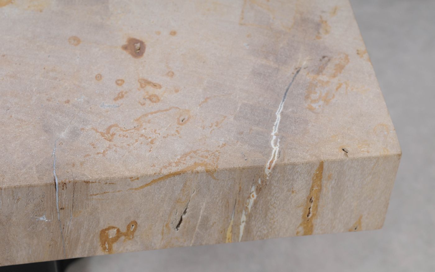 Deze unieke salontafel van versteend hout past in ieder interieur. Het tafelblad is gezaagd uit een grote versteende boom, die ongeveer 20 miljoen jaar geleden geleefd heeft. De kleuren zijn bepaald door de mineralen die het hout van deze boom vervangen hebben.