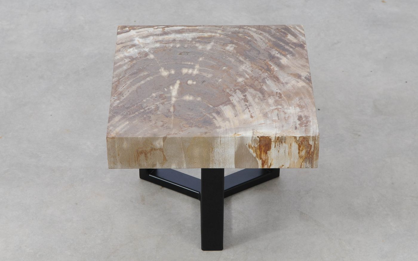 Deze unieke salontafel van versteend hout past in ieder interieur. Het tafelblad is gezaagd uit een grote versteende boom, die ongeveer 20 miljoen jaar geleden geleefd heeft. De kleuren zijn bepaald door de mineralen die het hout van deze boom vervangen hebben.