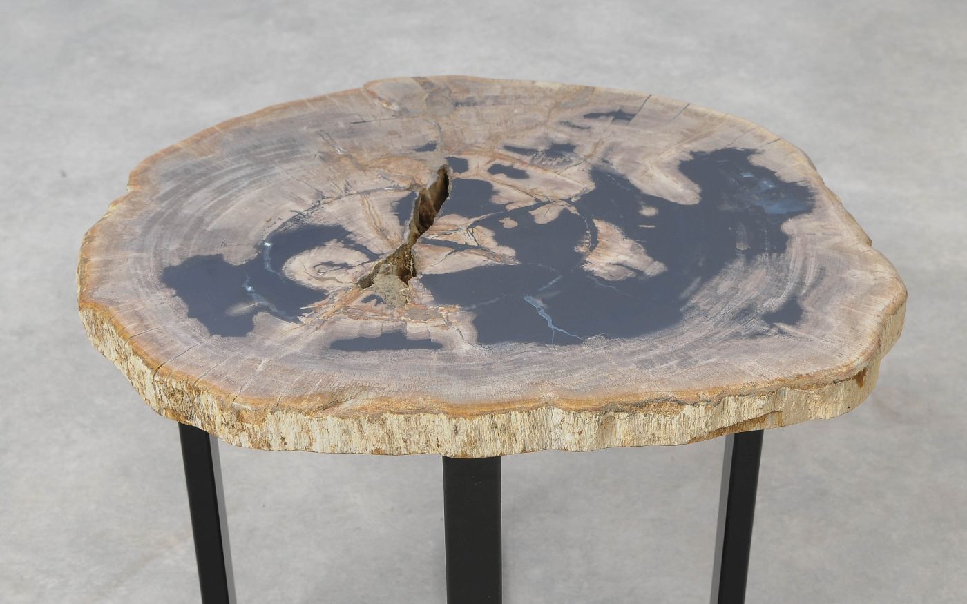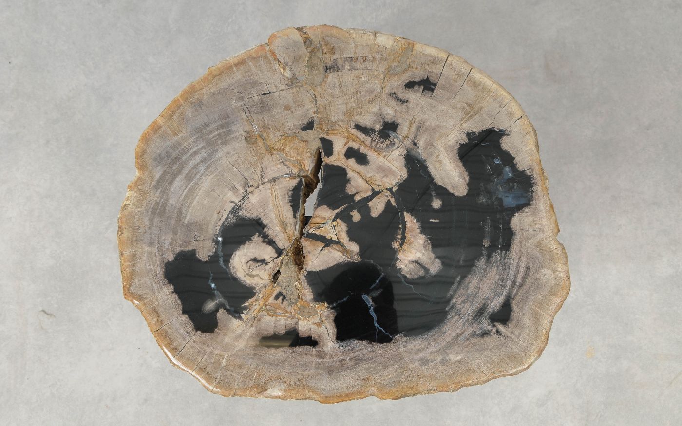 Deze unieke salontafel van versteend hout past in ieder interieur. Het tafelblad is gezaagd uit een grote versteende boom, die ongeveer 20 miljoen jaar geleden geleefd heeft. De kleuren zijn bepaald door de mineralen die het hout van deze boom vervangen hebben.