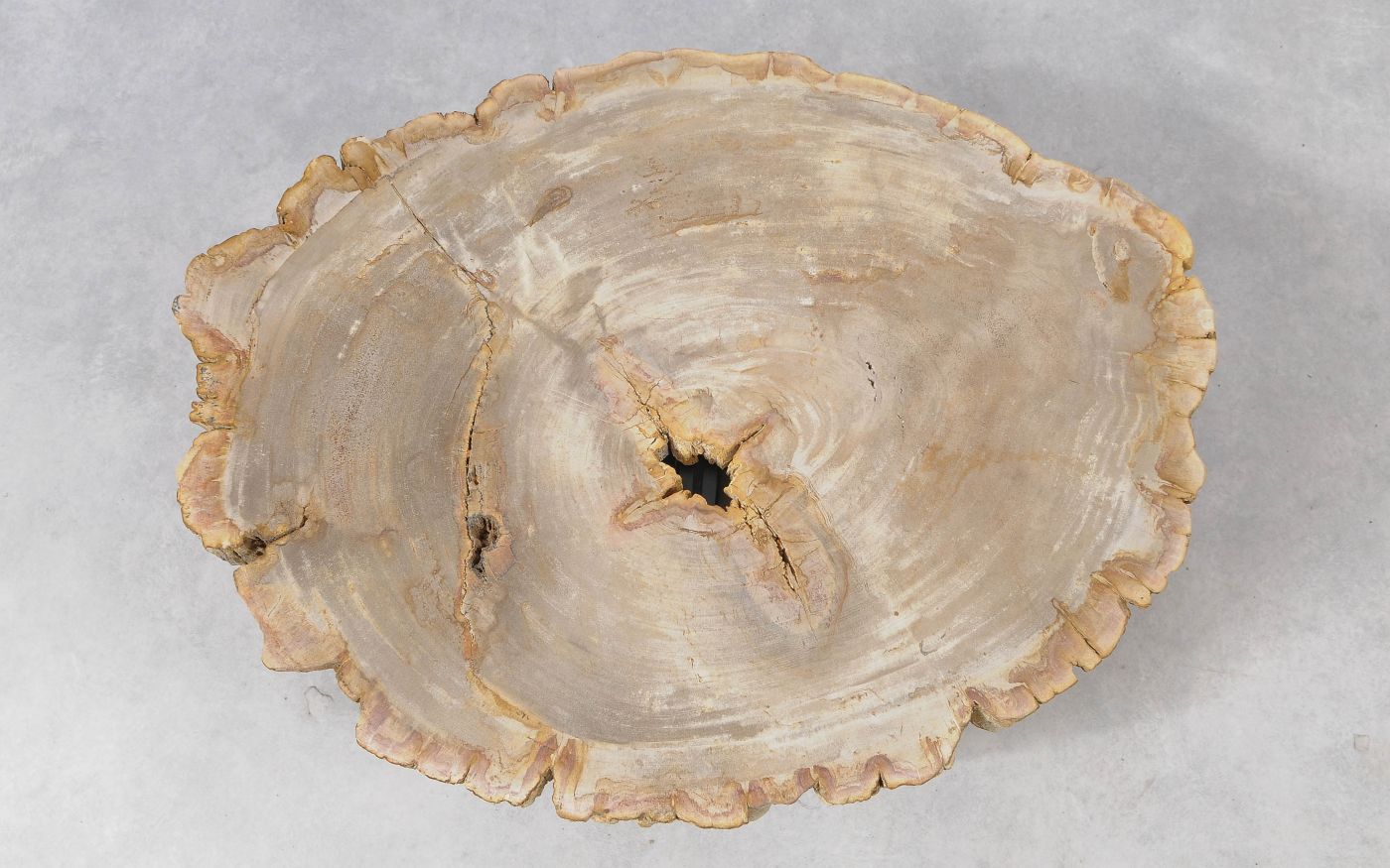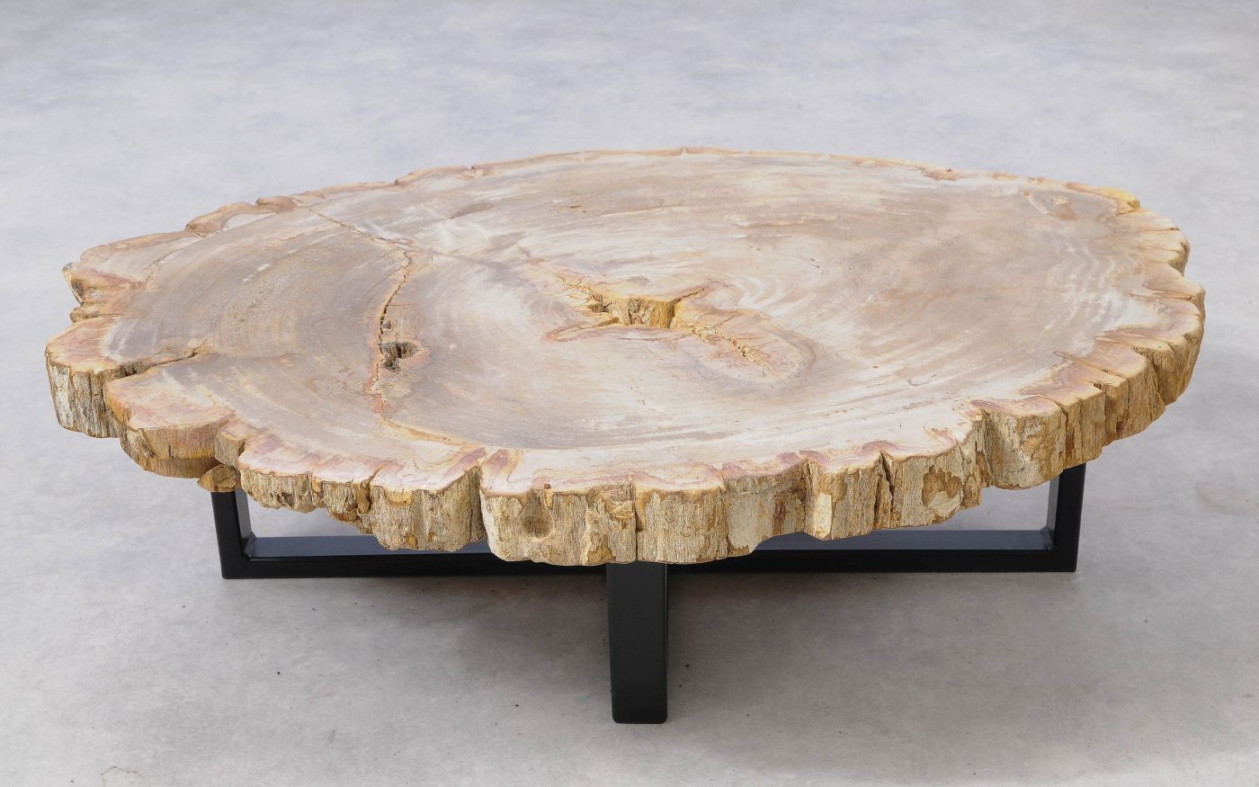Deze unieke salontafel van versteend hout past in ieder interieur. Het tafelblad is gezaagd uit een grote versteende boom, die ongeveer 20 miljoen jaar geleden geleefd heeft. De kleuren zijn bepaald door de mineralen die het hout van deze boom vervangen hebben.
