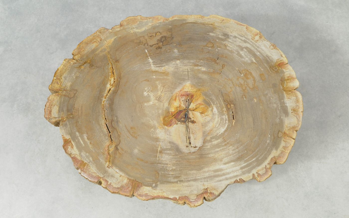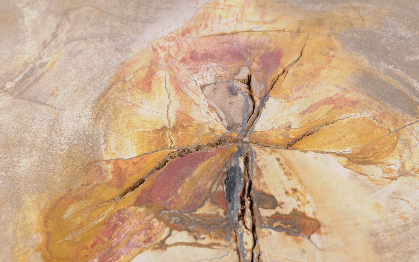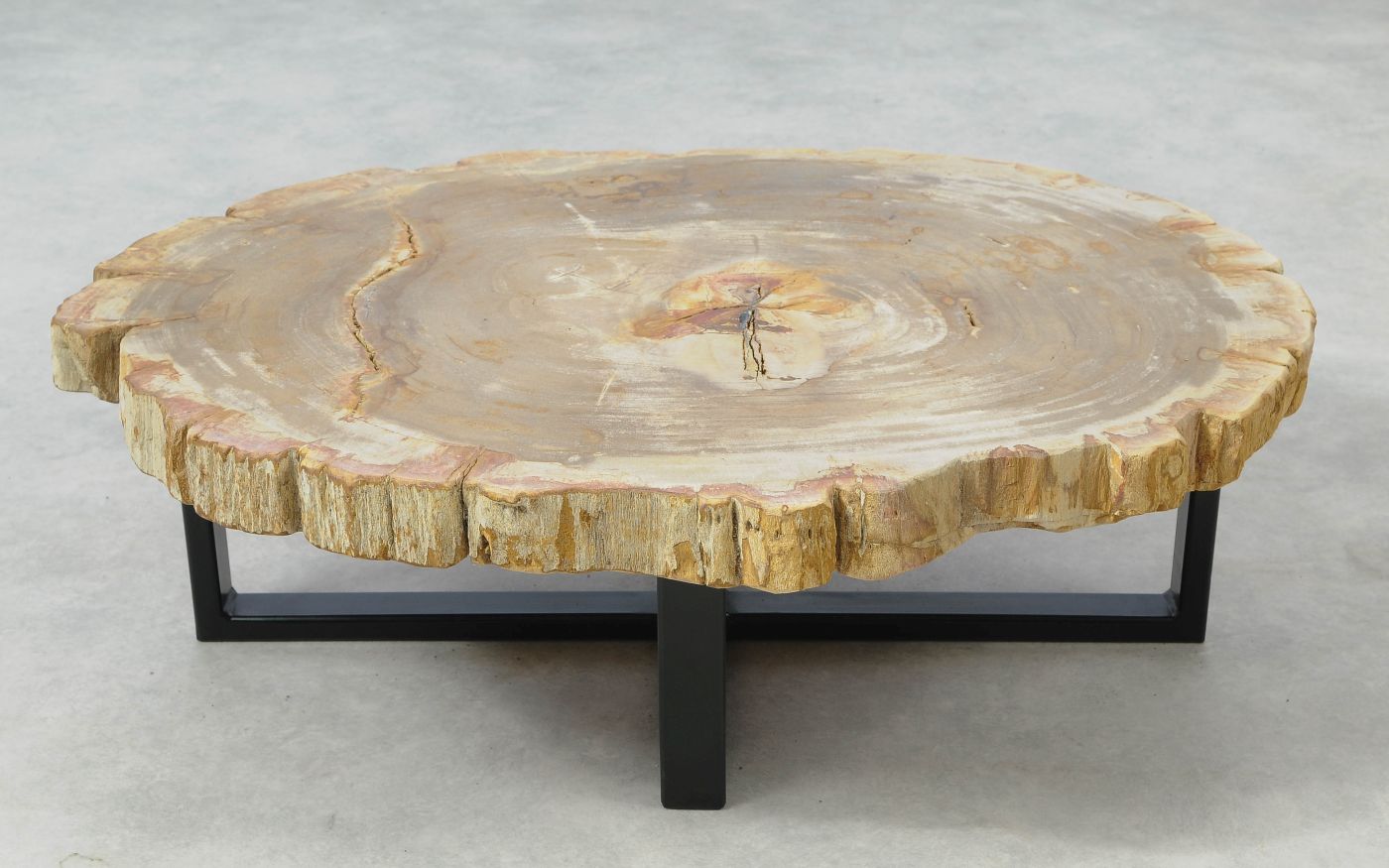 Deze unieke salontafel van versteend hout past in ieder interieur. Het tafelblad is gezaagd uit een grote versteende boom, die ongeveer 20 miljoen jaar geleden geleefd heeft. De kleuren zijn bepaald door de mineralen die het hout van deze boom vervangen hebben.