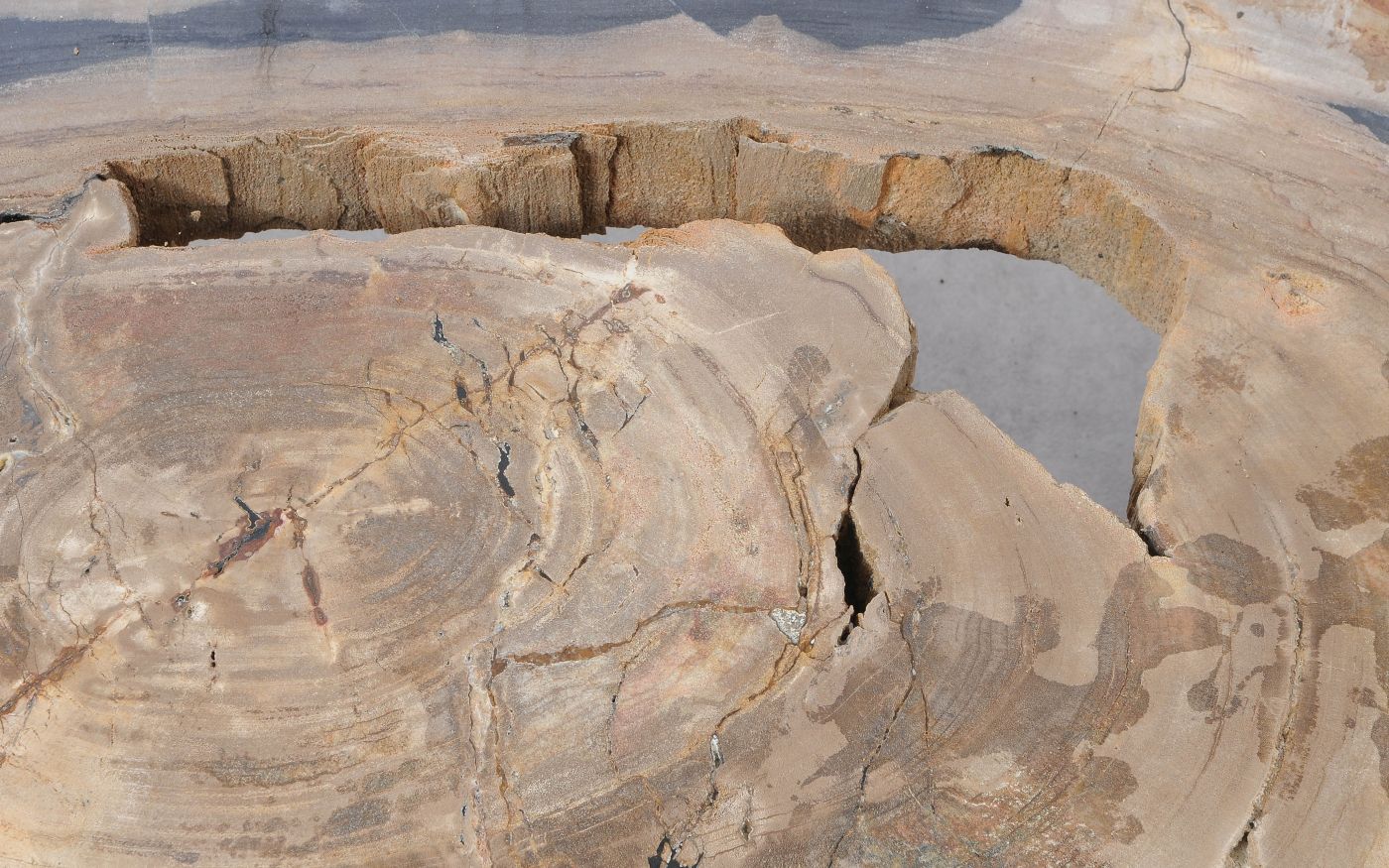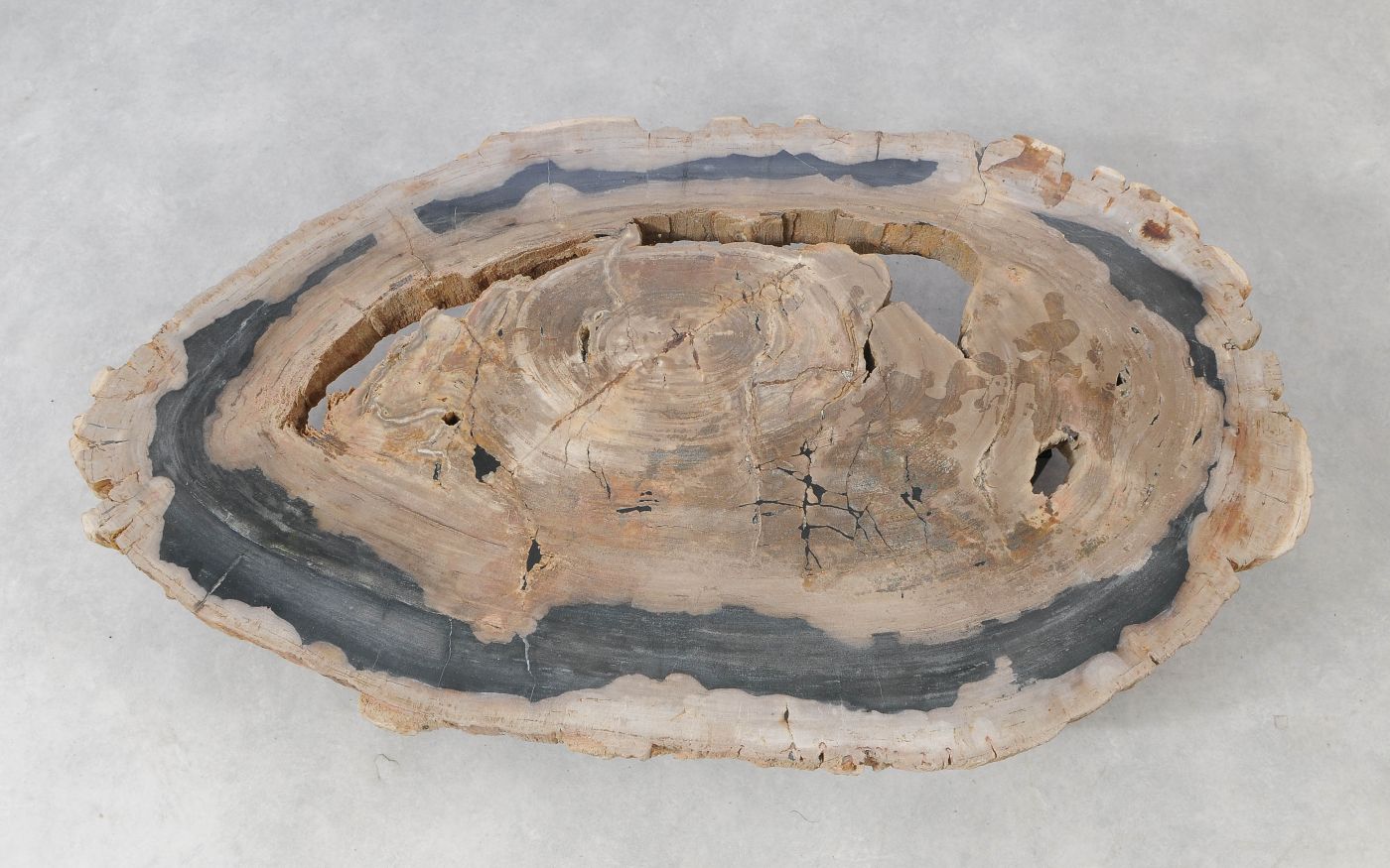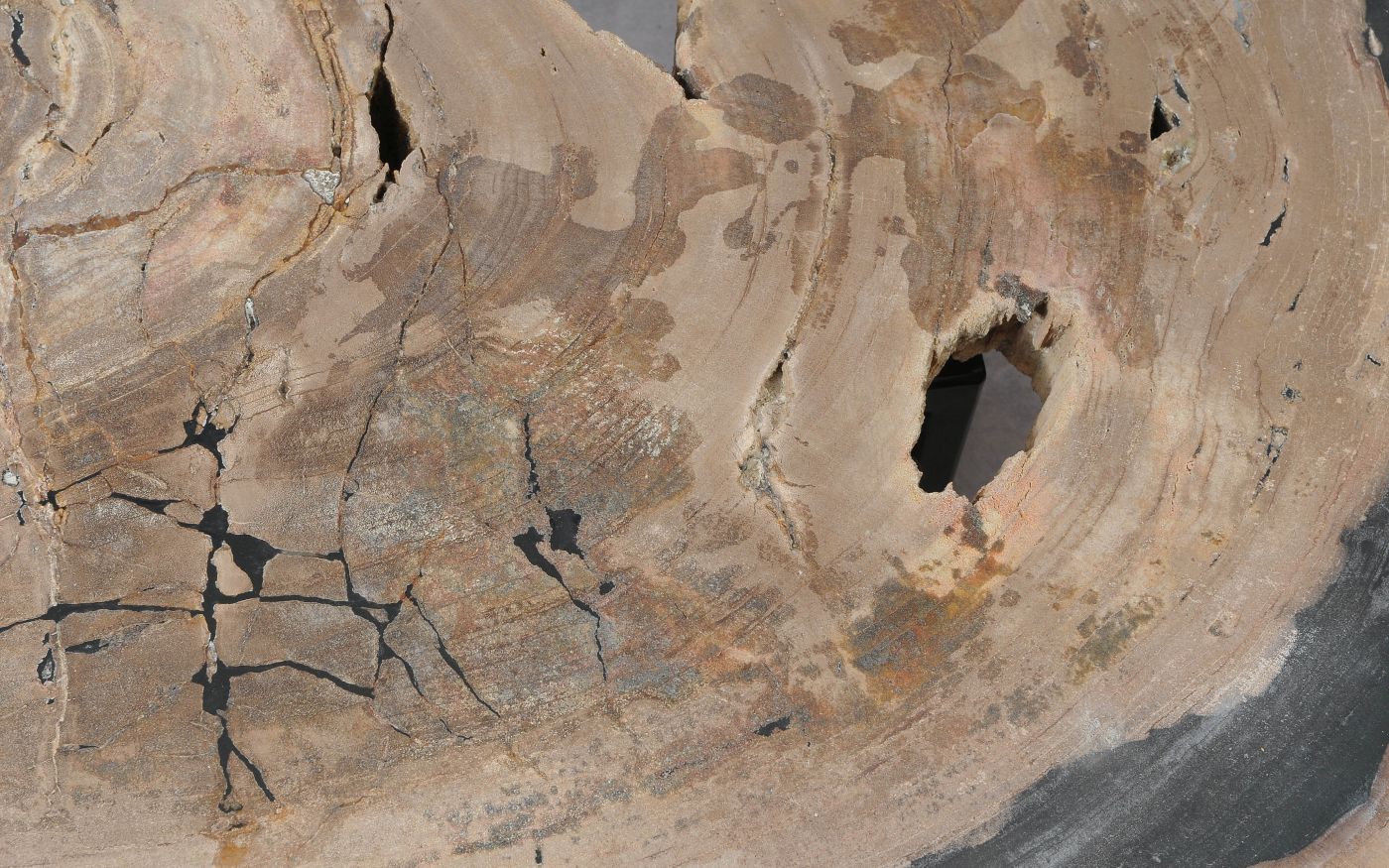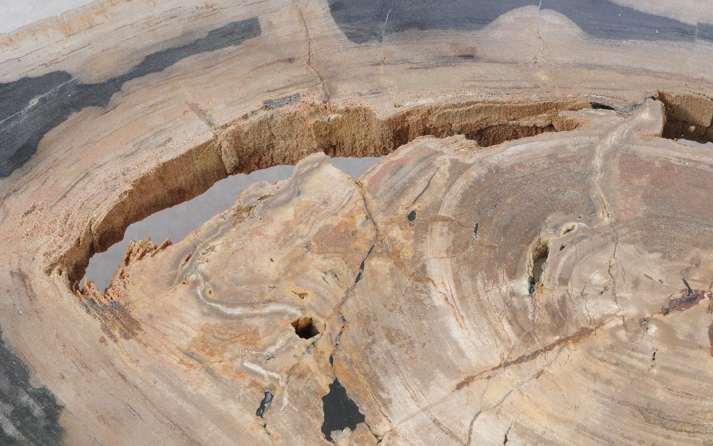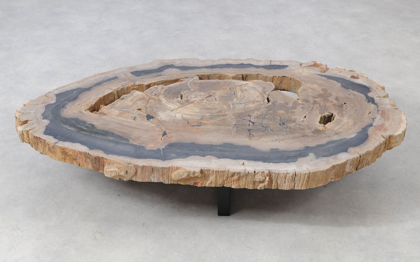Deze unieke salontafel van versteend hout past in ieder interieur. Het tafelblad is gezaagd uit een grote versteende boom, die ongeveer 20 miljoen jaar geleden geleefd heeft. De kleuren zijn bepaald door de mineralen die het hout van deze boom vervangen hebben.