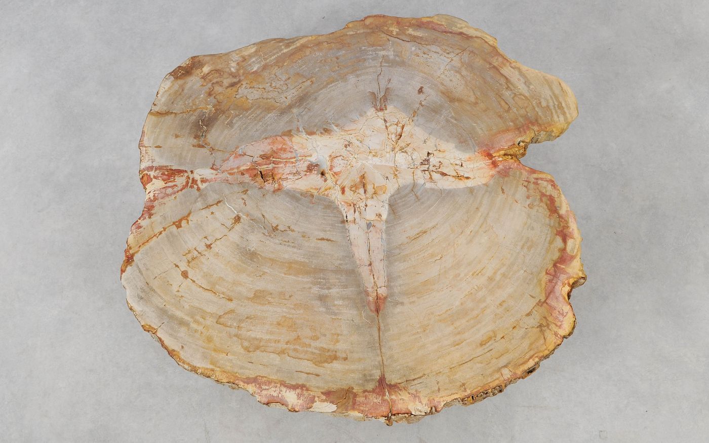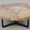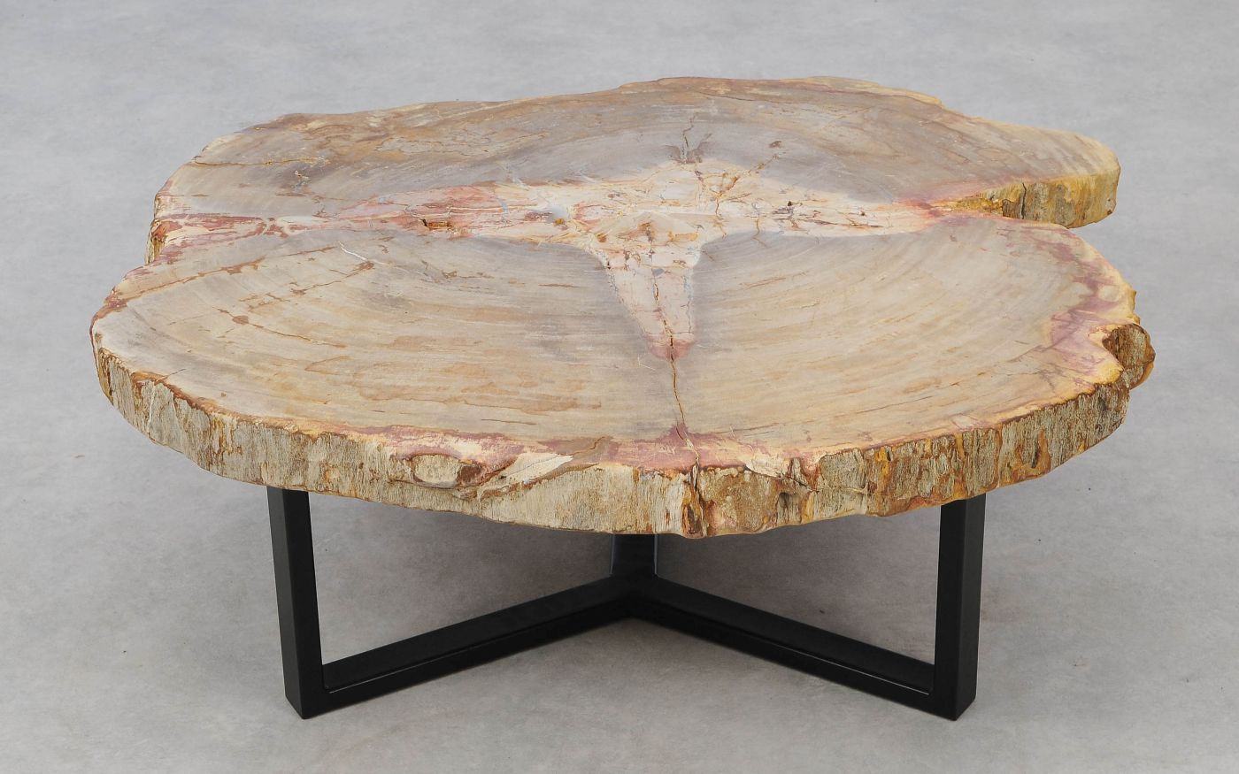 Deze unieke salontafel van versteend hout past in ieder interieur. Het tafelblad is gezaagd uit een grote versteende boom, die ongeveer 20 miljoen jaar geleden geleefd heeft. De kleuren zijn bepaald door de mineralen die het hout van deze boom vervangen hebben.
