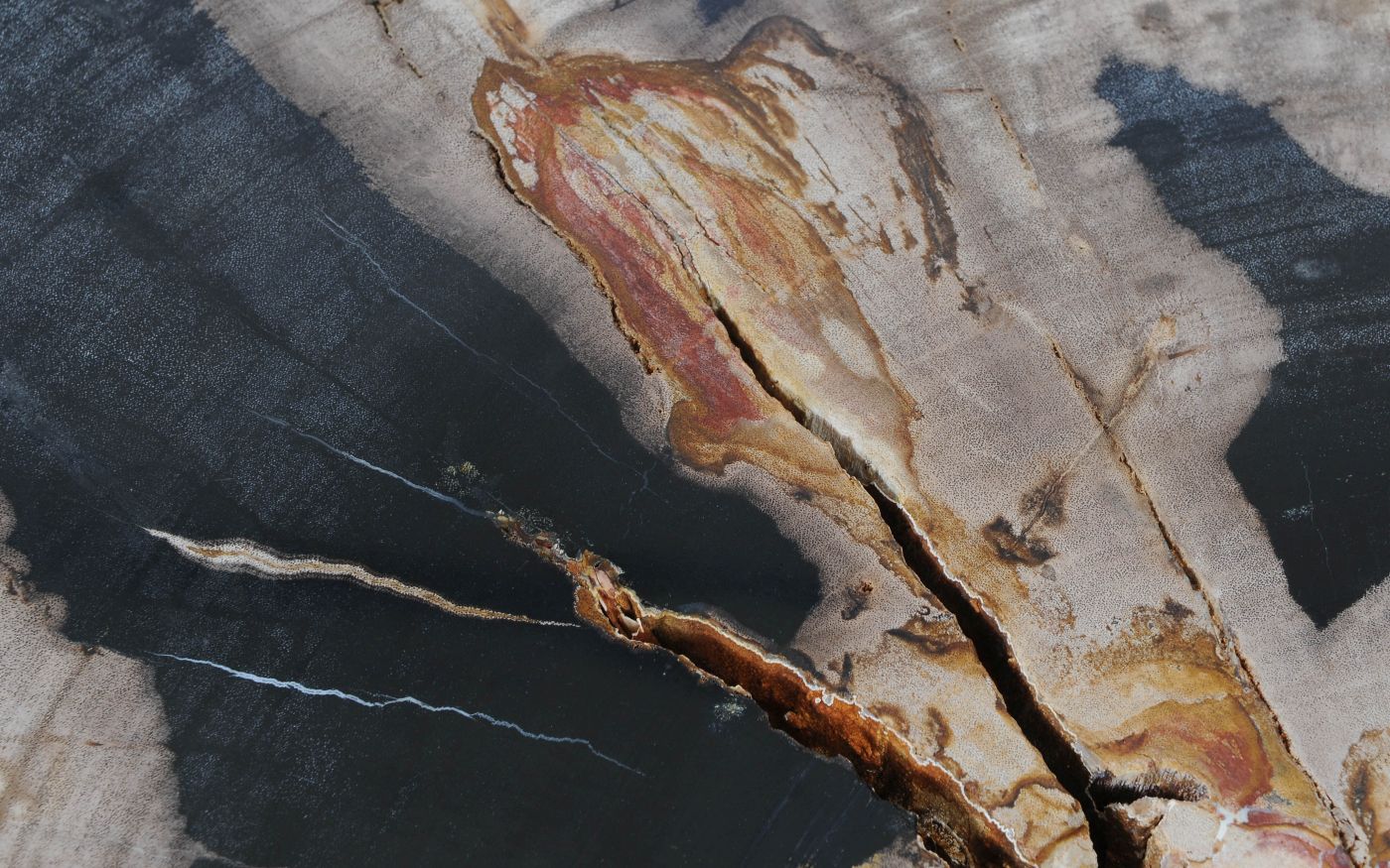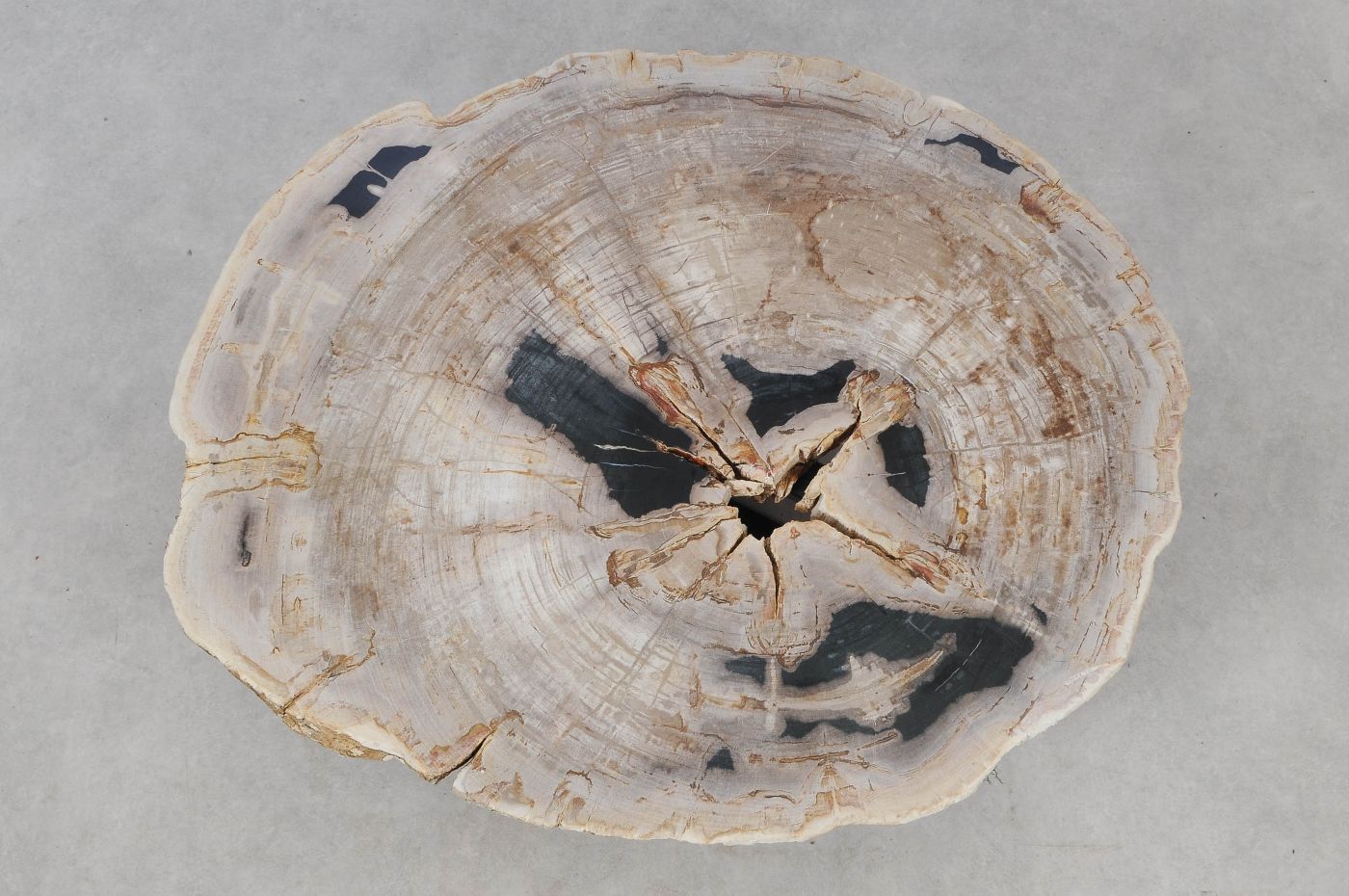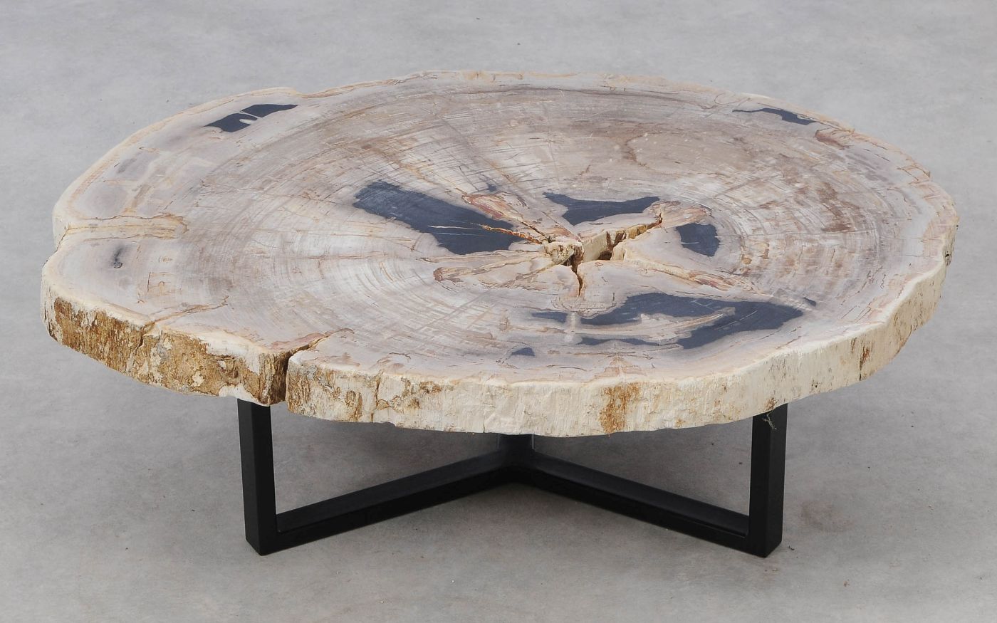 Deze unieke salontafel van versteend hout past in ieder interieur. Het tafelblad is gezaagd uit een grote versteende boom, die ongeveer 20 miljoen jaar geleden geleefd heeft. De kleuren zijn bepaald door de mineralen die het hout van deze boom vervangen hebben.