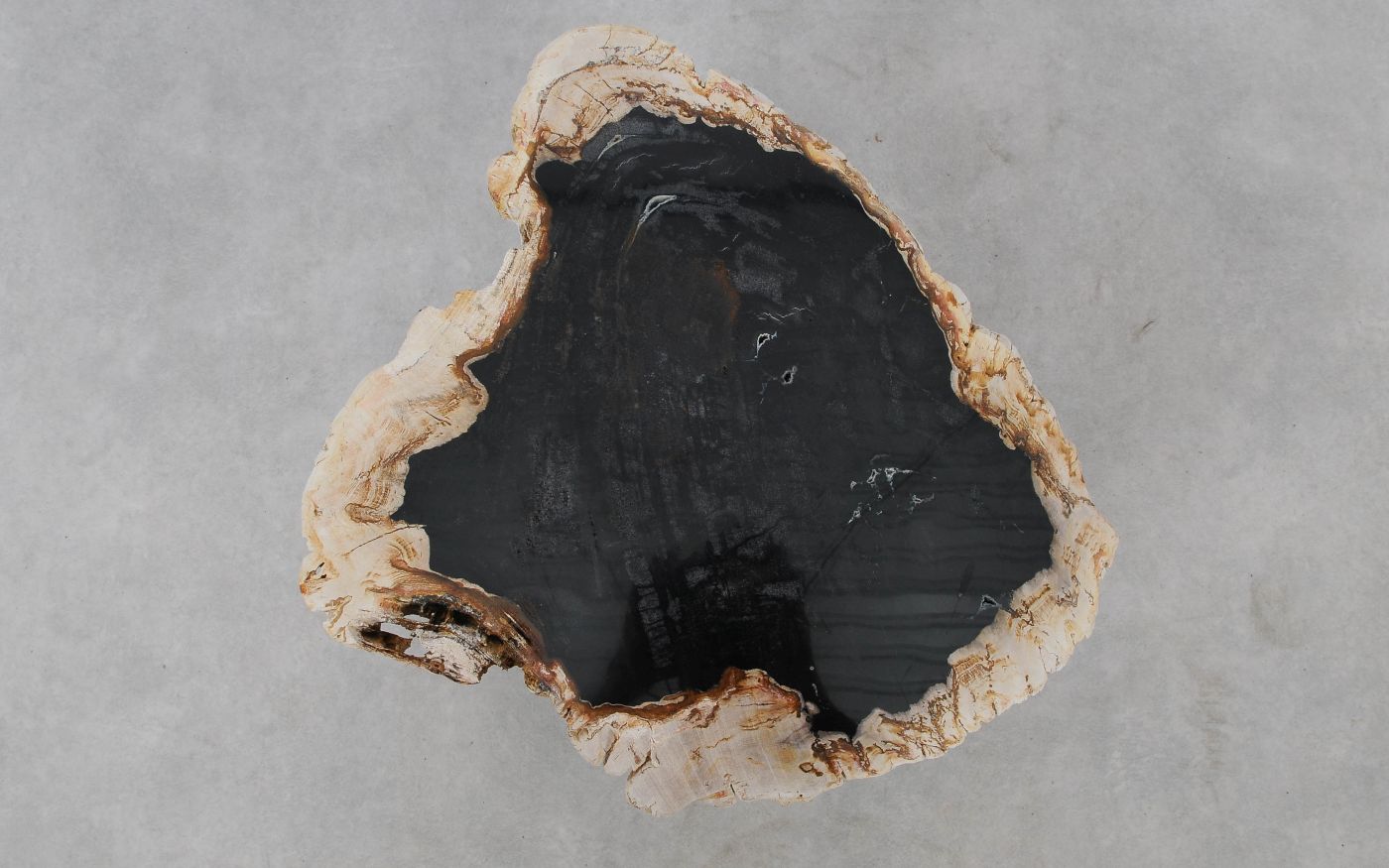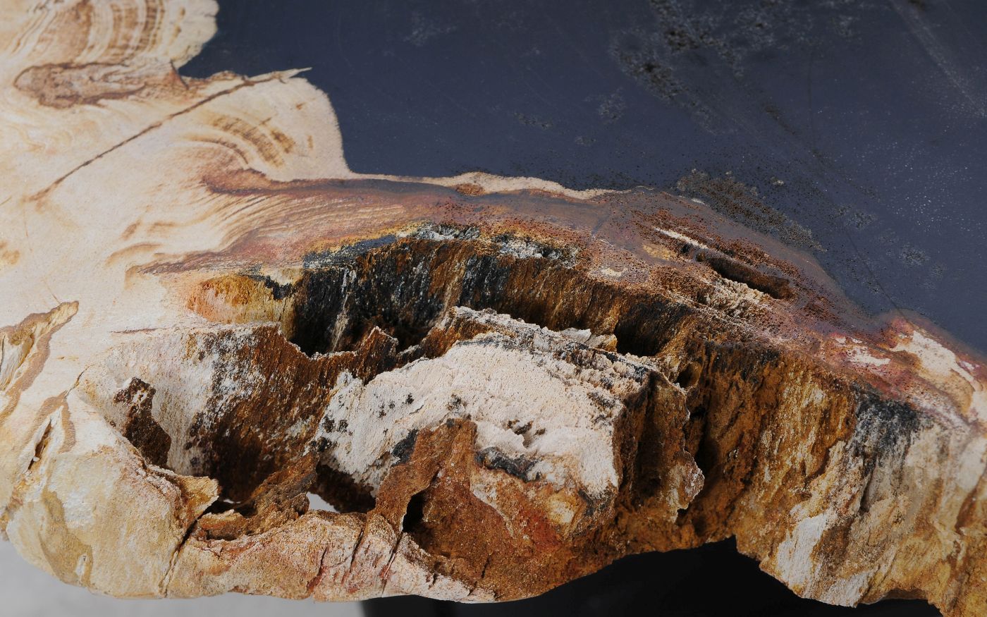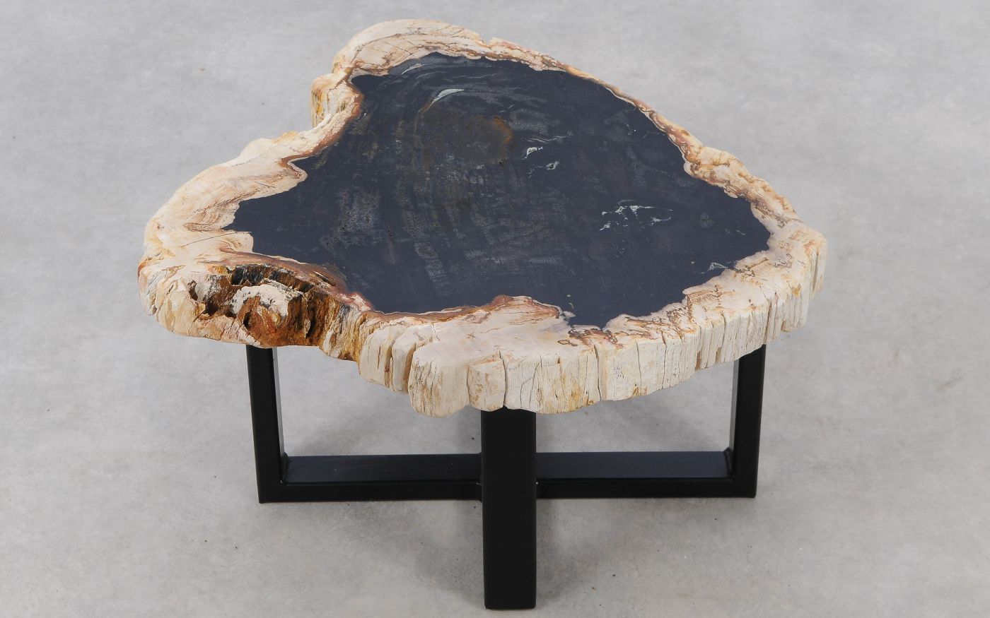 Deze unieke salontafel van versteend hout past in ieder interieur. Het tafelblad is gezaagd uit een grote versteende boom, die ongeveer 20 miljoen jaar geleden geleefd heeft. De kleuren zijn bepaald door de mineralen die het hout van deze boom vervangen hebben.