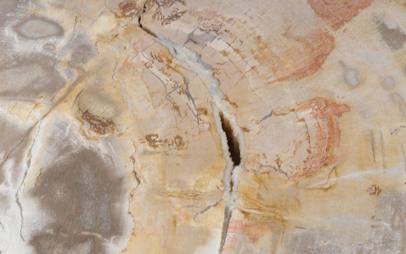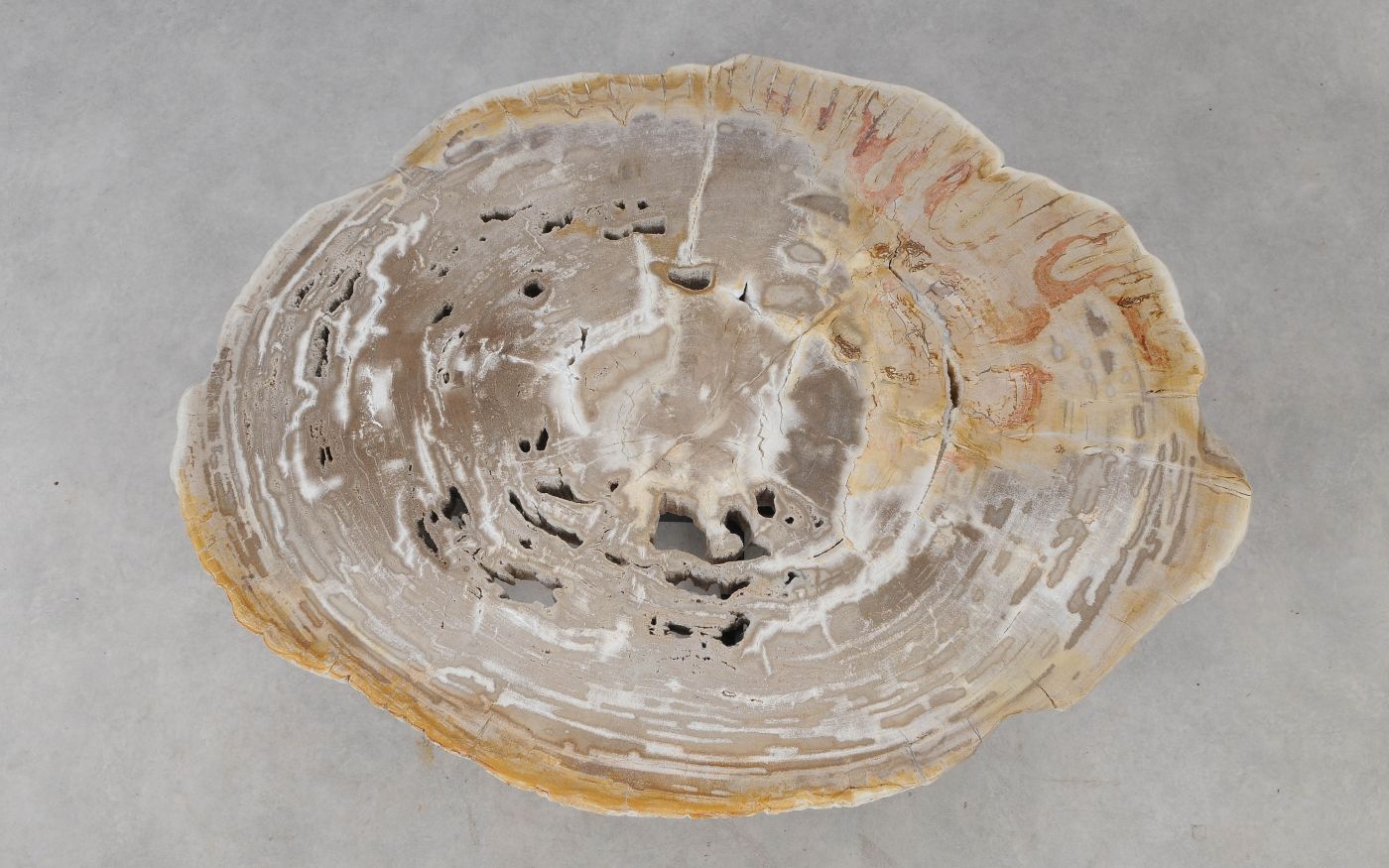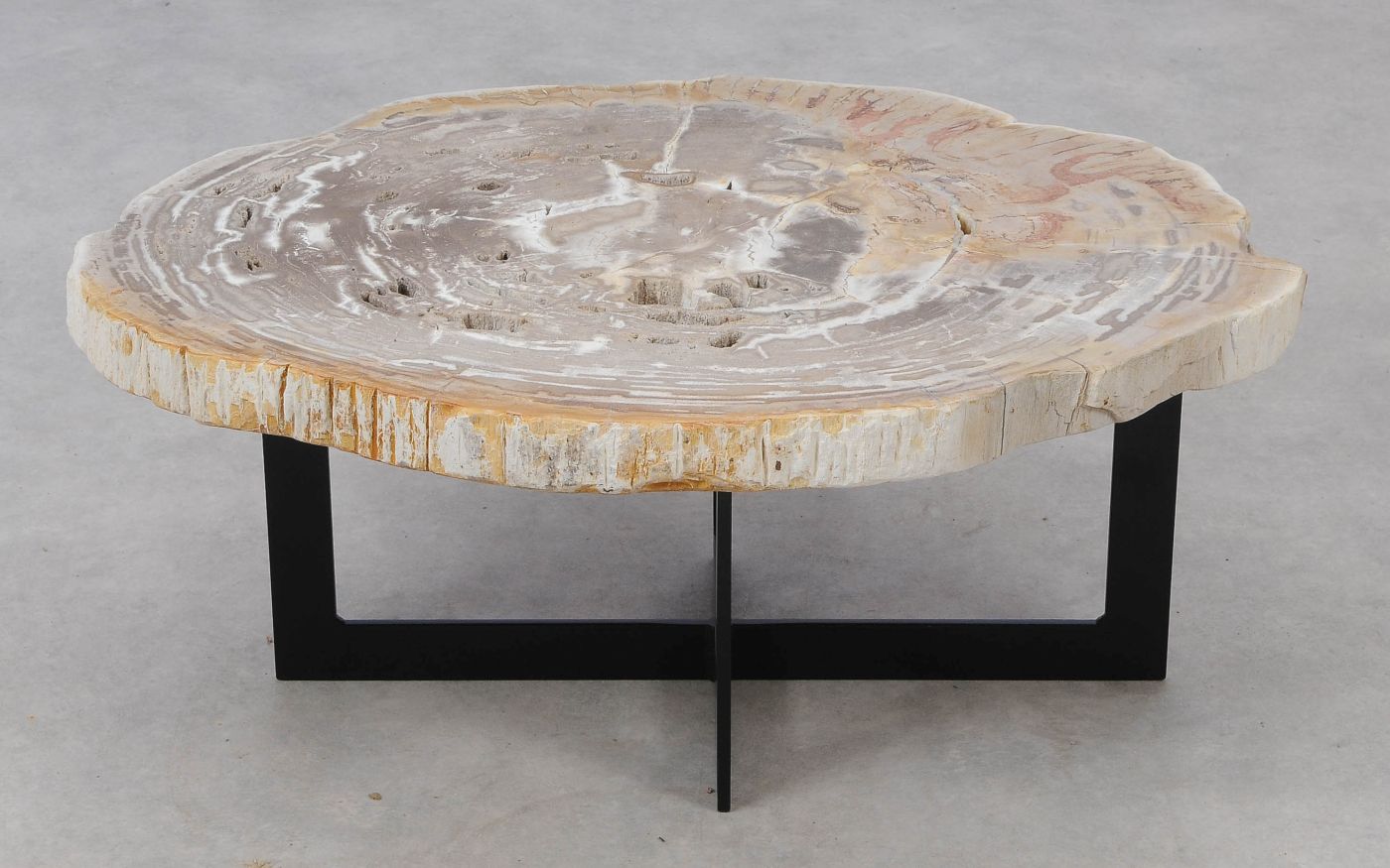 Deze unieke salontafel van versteend hout past in ieder interieur. Het tafelblad is gezaagd uit een grote versteende boom, die ongeveer 20 miljoen jaar geleden geleefd heeft. De kleuren zijn bepaald door de mineralen die het hout van deze boom vervangen hebben.