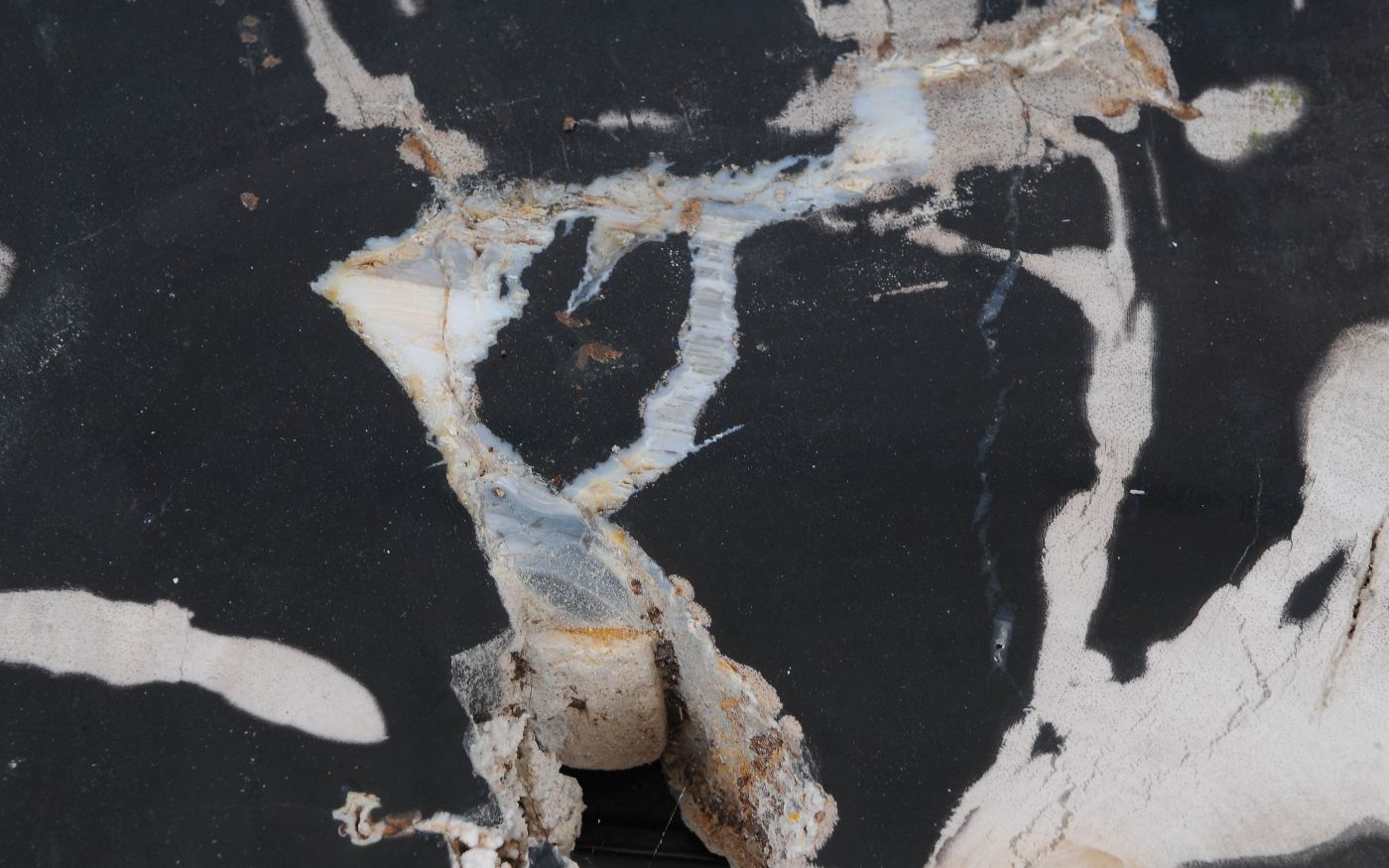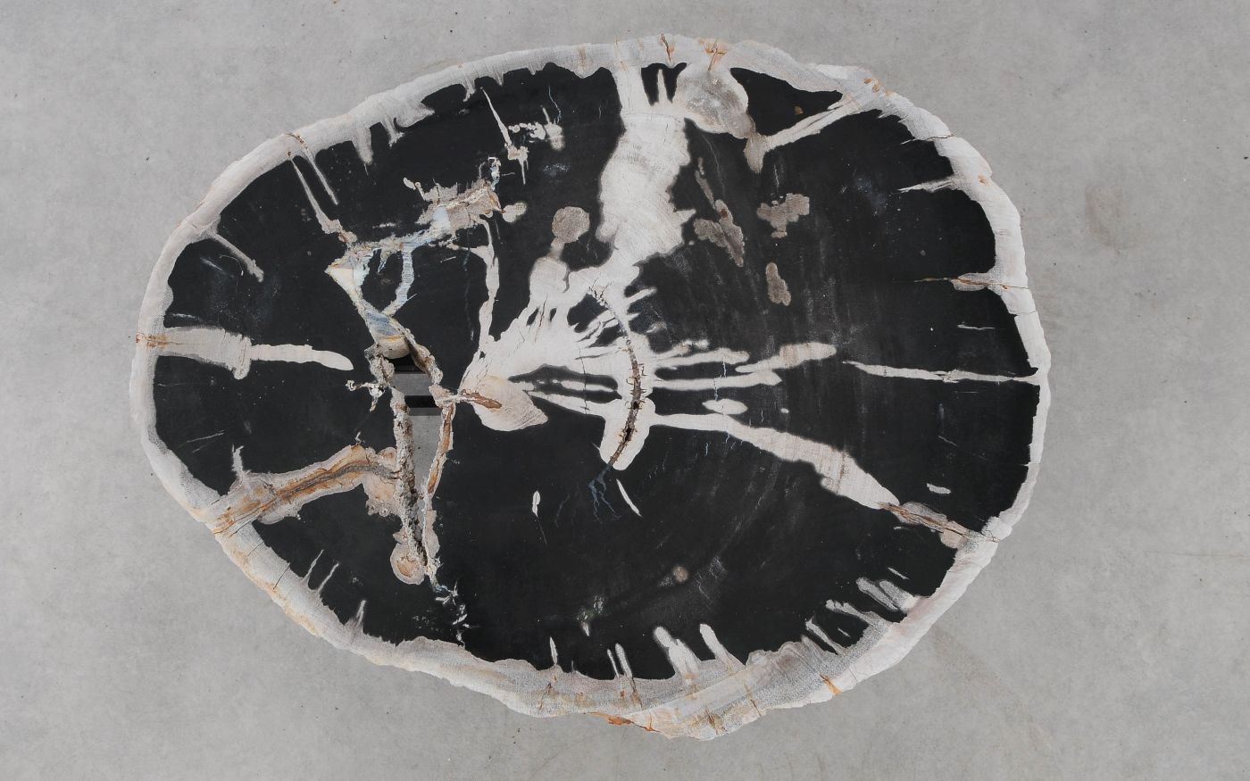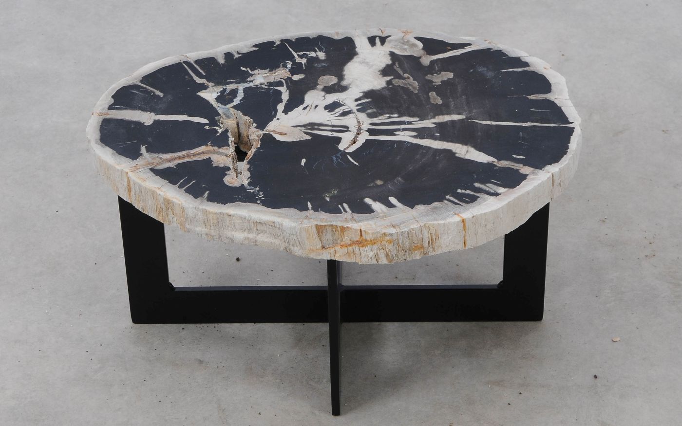 Deze unieke salontafel van versteend hout past in ieder interieur. Het tafelblad is gezaagd uit een grote versteende boom, die ongeveer 20 miljoen jaar geleden geleefd heeft. De kleuren zijn bepaald door de mineralen die het hout van deze boom vervangen hebben.