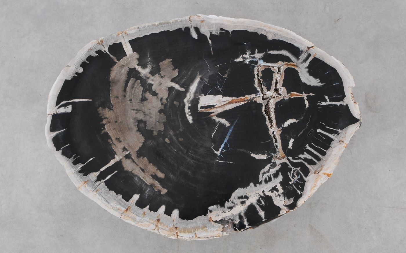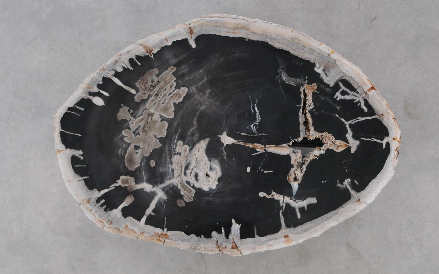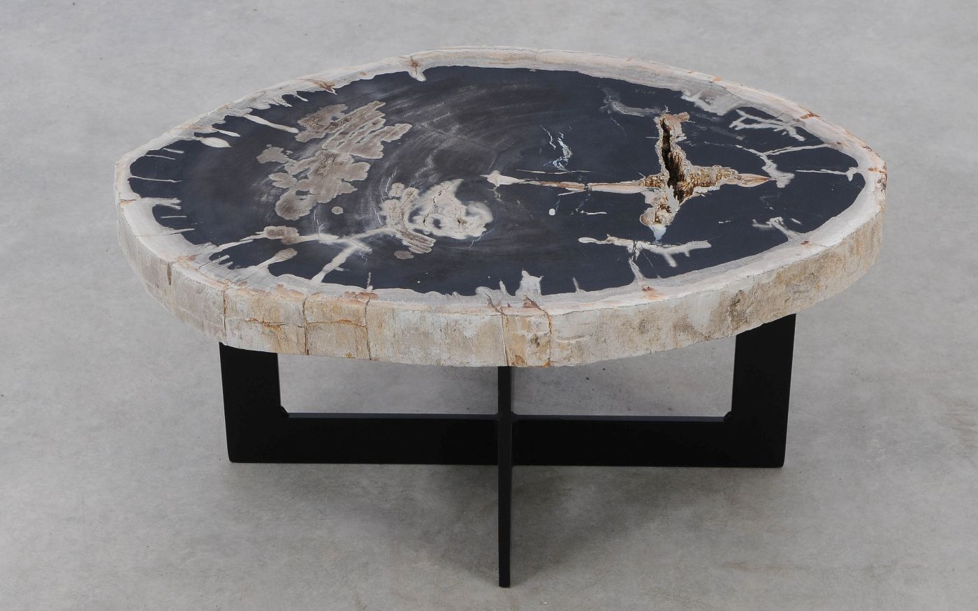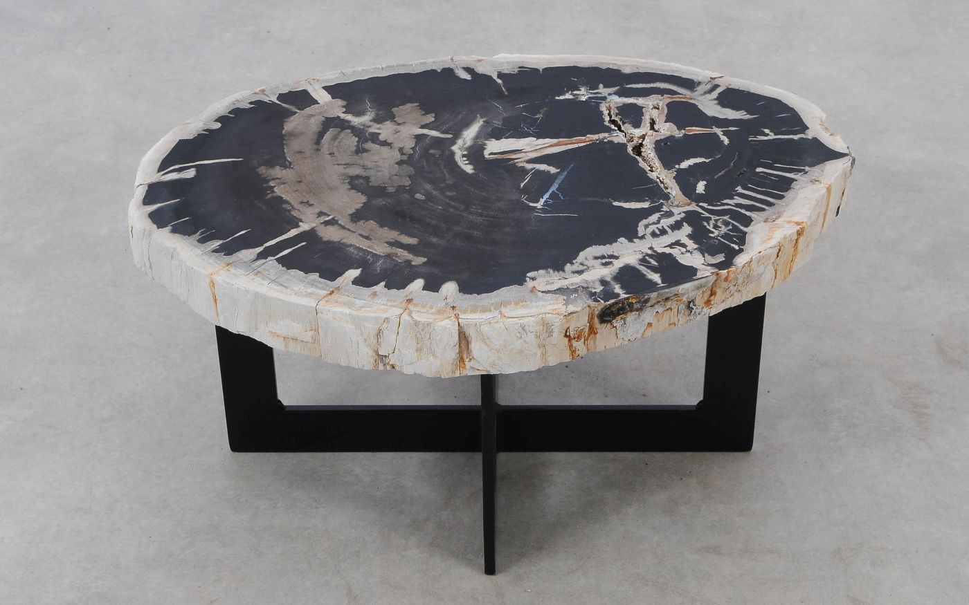 Deze unieke salontafel van versteend hout past in ieder interieur. Het tafelblad is gezaagd uit een grote versteende boom, die ongeveer 20 miljoen jaar geleden geleefd heeft. De kleuren zijn bepaald door de mineralen die het hout van deze boom vervangen hebben.