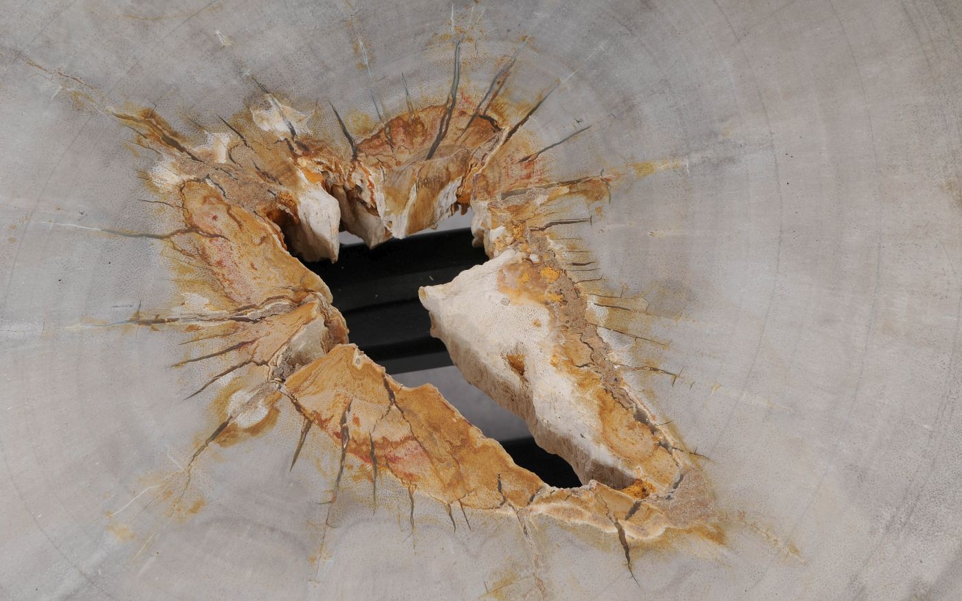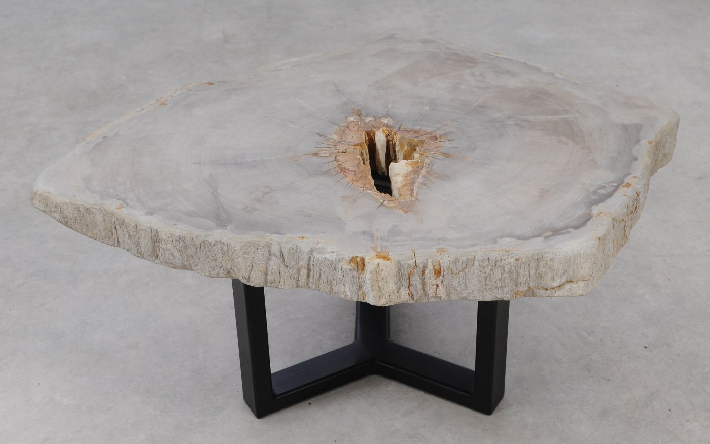 Deze unieke salontafel van versteend hout past in ieder interieur. Het tafelblad is gezaagd uit een grote versteende boom, die ongeveer 20 miljoen jaar geleden geleefd heeft. De kleuren zijn bepaald door de mineralen die het hout van deze boom vervangen hebben.