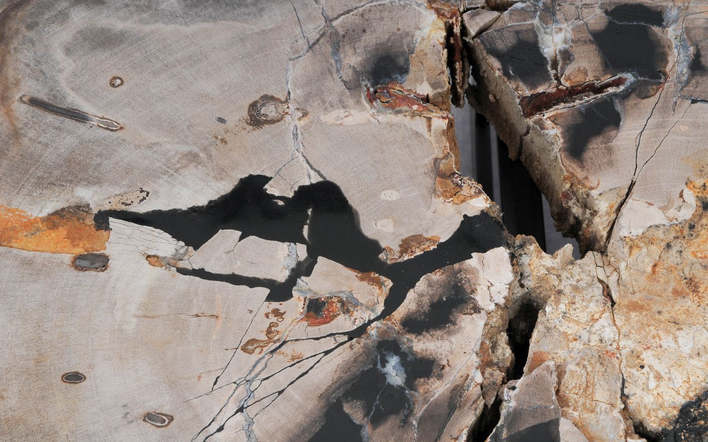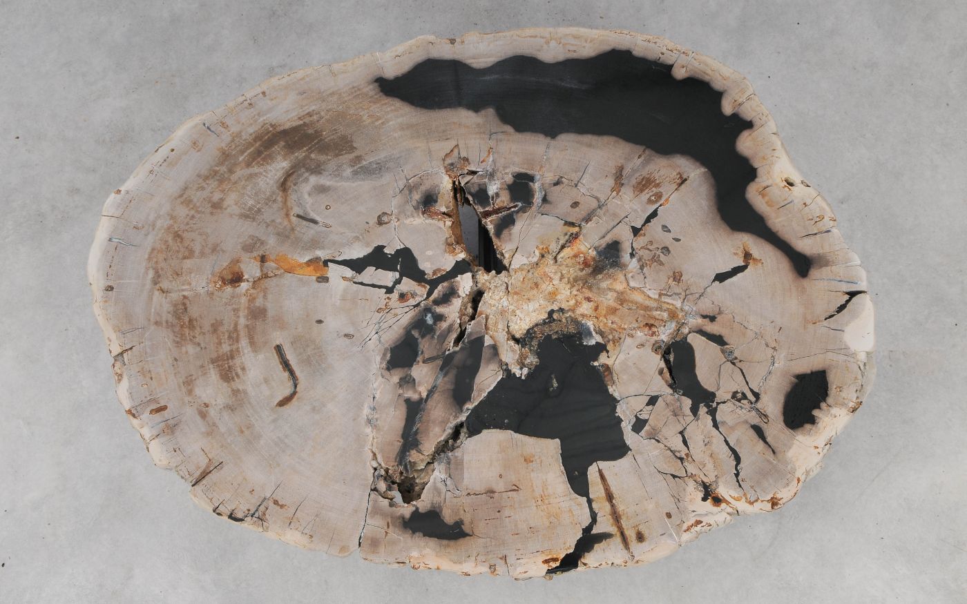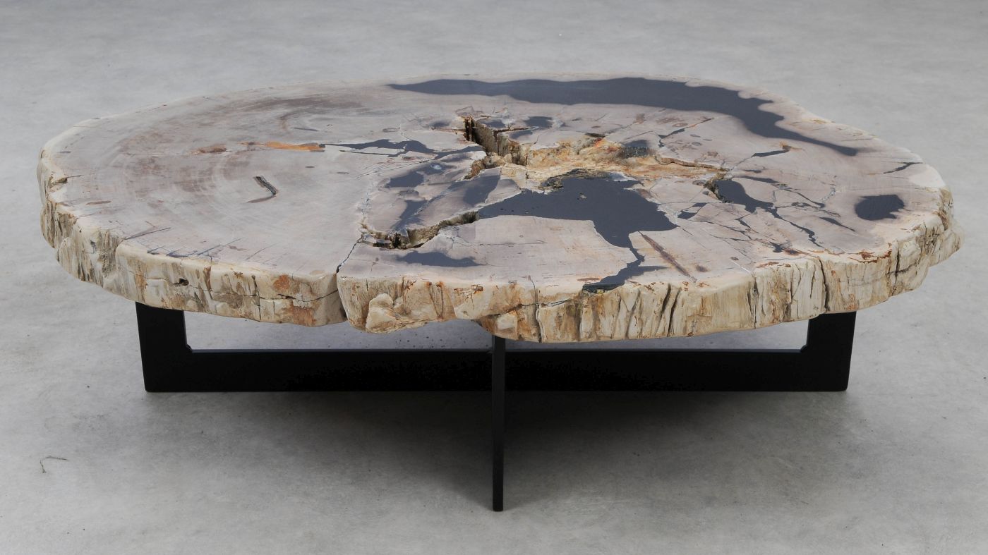 Deze unieke salontafel van versteend hout past in ieder interieur. Het tafelblad is gezaagd uit een grote versteende boom, die ongeveer 20 miljoen jaar geleden geleefd heeft. De kleuren zijn bepaald door de mineralen die het hout van deze boom vervangen hebben.