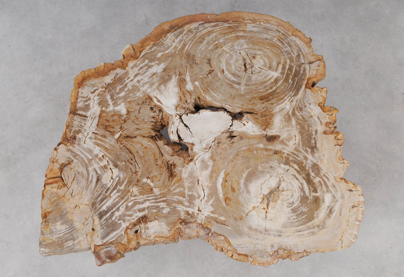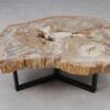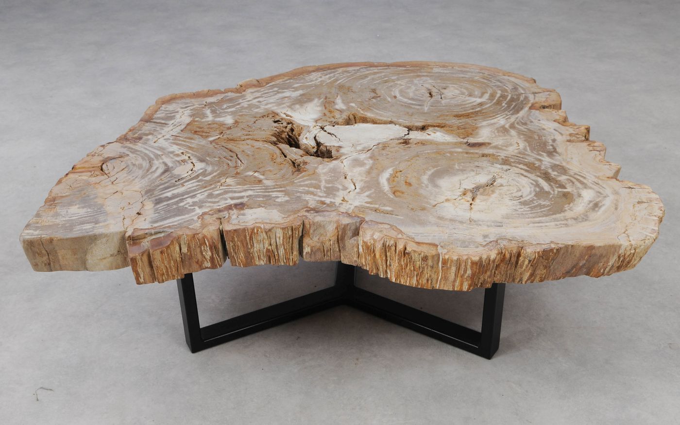 Deze unieke salontafel van versteend hout past in ieder interieur. Het tafelblad is gezaagd uit een grote versteende boom, die ongeveer 20 miljoen jaar geleden geleefd heeft. De kleuren zijn bepaald door de mineralen die het hout van deze boom vervangen hebben.