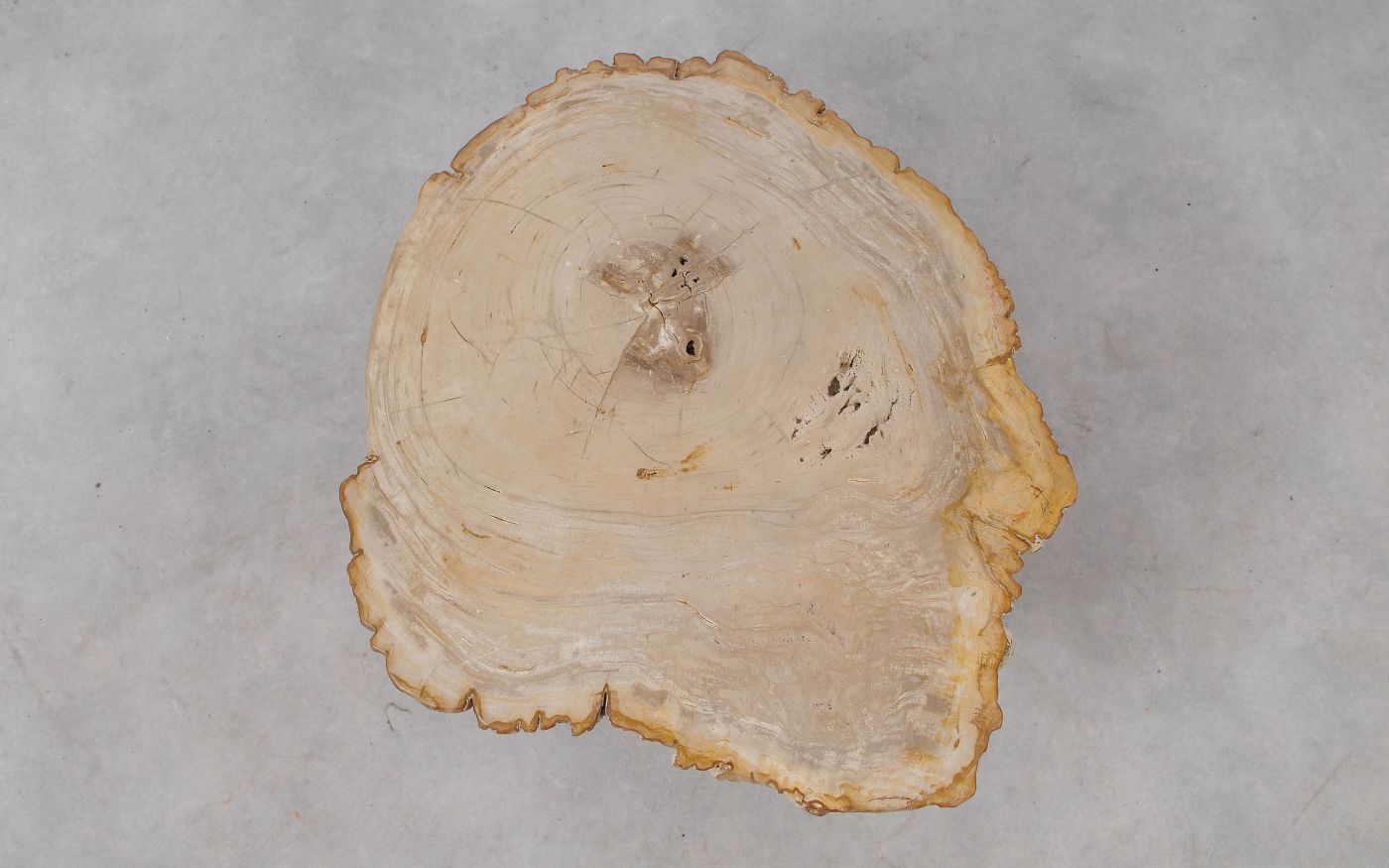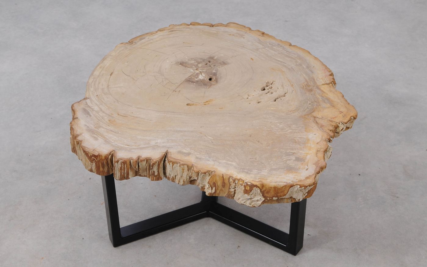 Deze unieke salontafel van versteend hout past in ieder interieur. Het tafelblad is gezaagd uit een grote versteende boom, die ongeveer 20 miljoen jaar geleden geleefd heeft. De kleuren zijn bepaald door de mineralen die het hout van deze boom vervangen hebben.