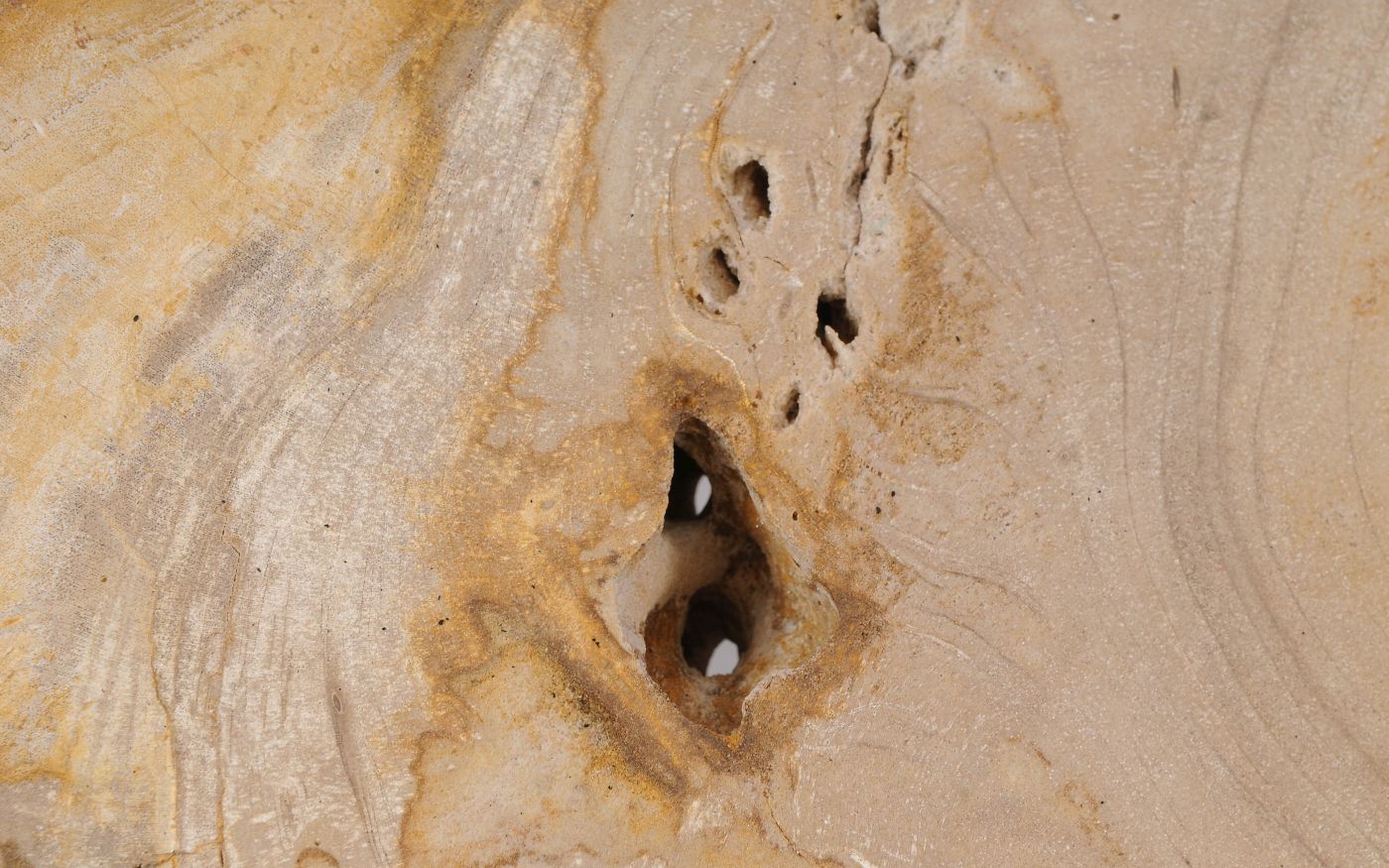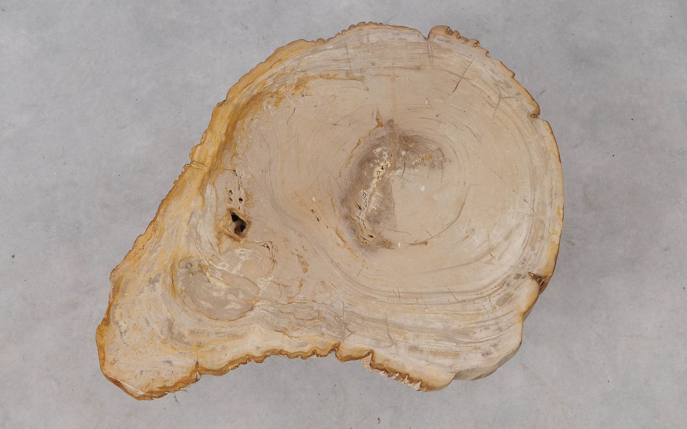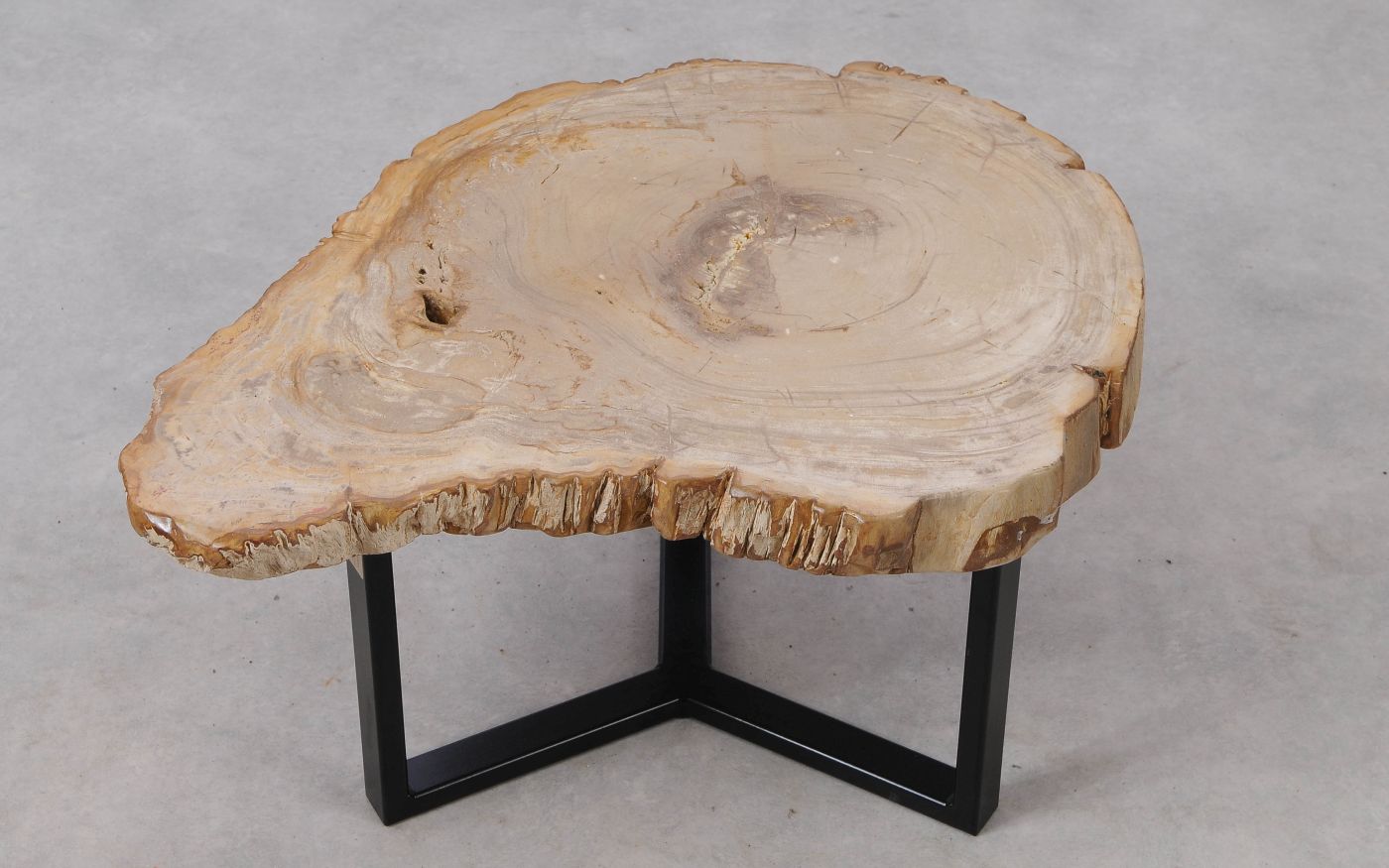 Deze unieke salontafel van versteend hout past in ieder interieur. Het tafelblad is gezaagd uit een grote versteende boom, die ongeveer 20 miljoen jaar geleden geleefd heeft. De kleuren zijn bepaald door de mineralen die het hout van deze boom vervangen hebben.