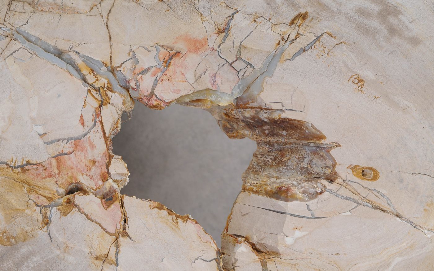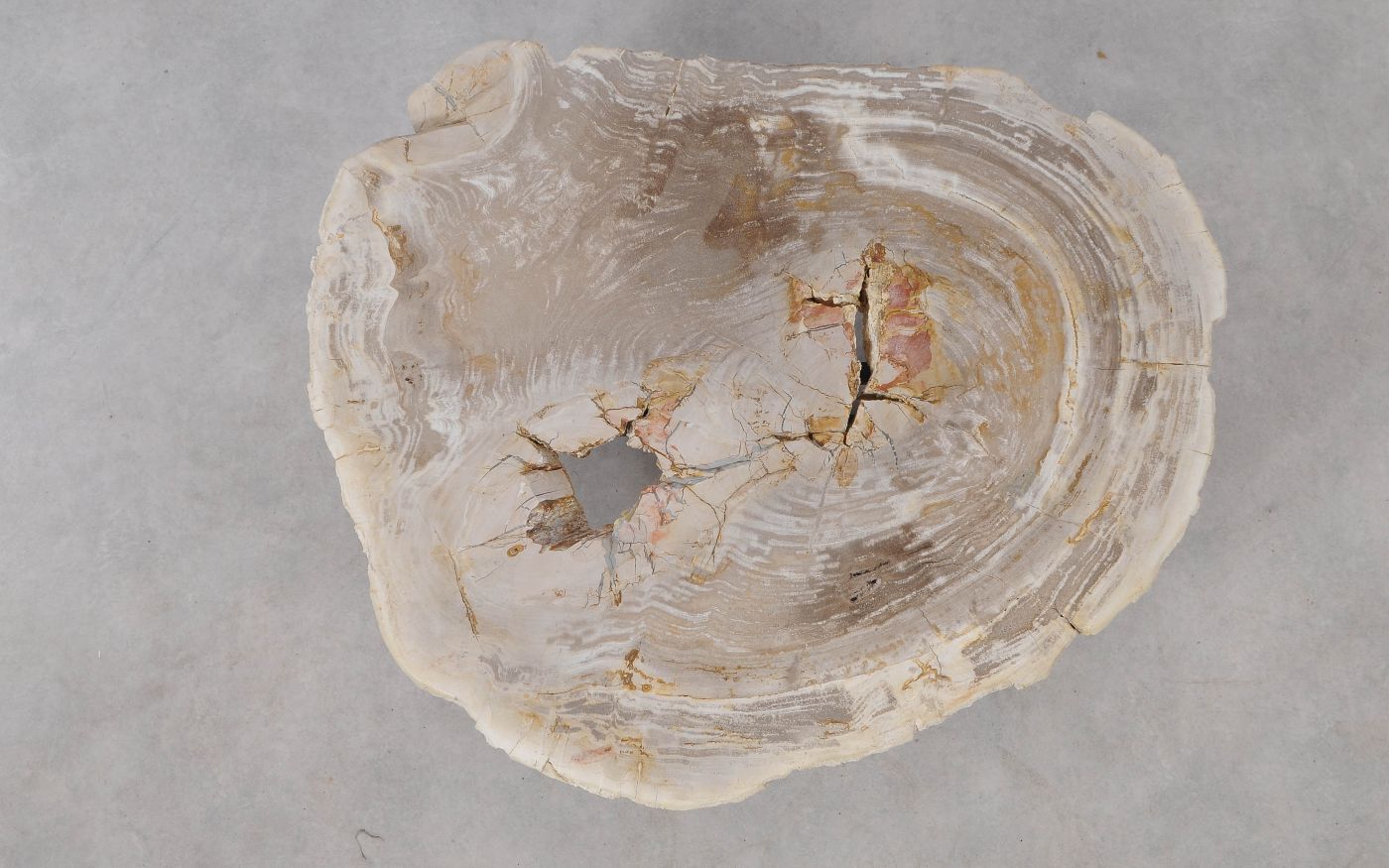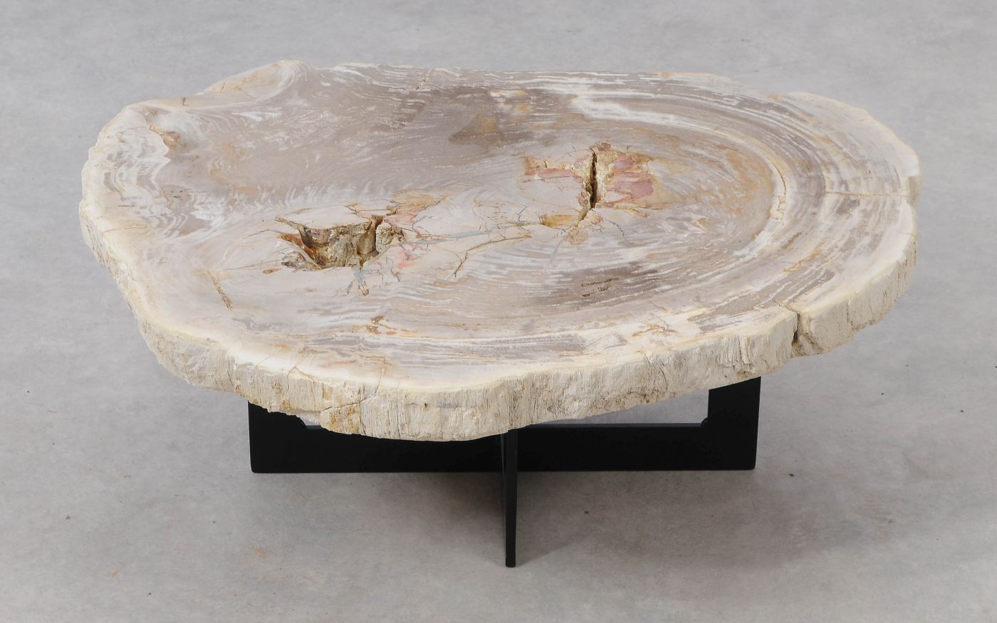 Deze unieke salontafel van versteend hout past in ieder interieur. Het tafelblad is gezaagd uit een grote versteende boom, die ongeveer 20 miljoen jaar geleden geleefd heeft. De kleuren zijn bepaald door de mineralen die het hout van deze boom vervangen hebben.