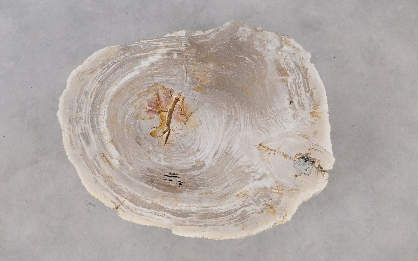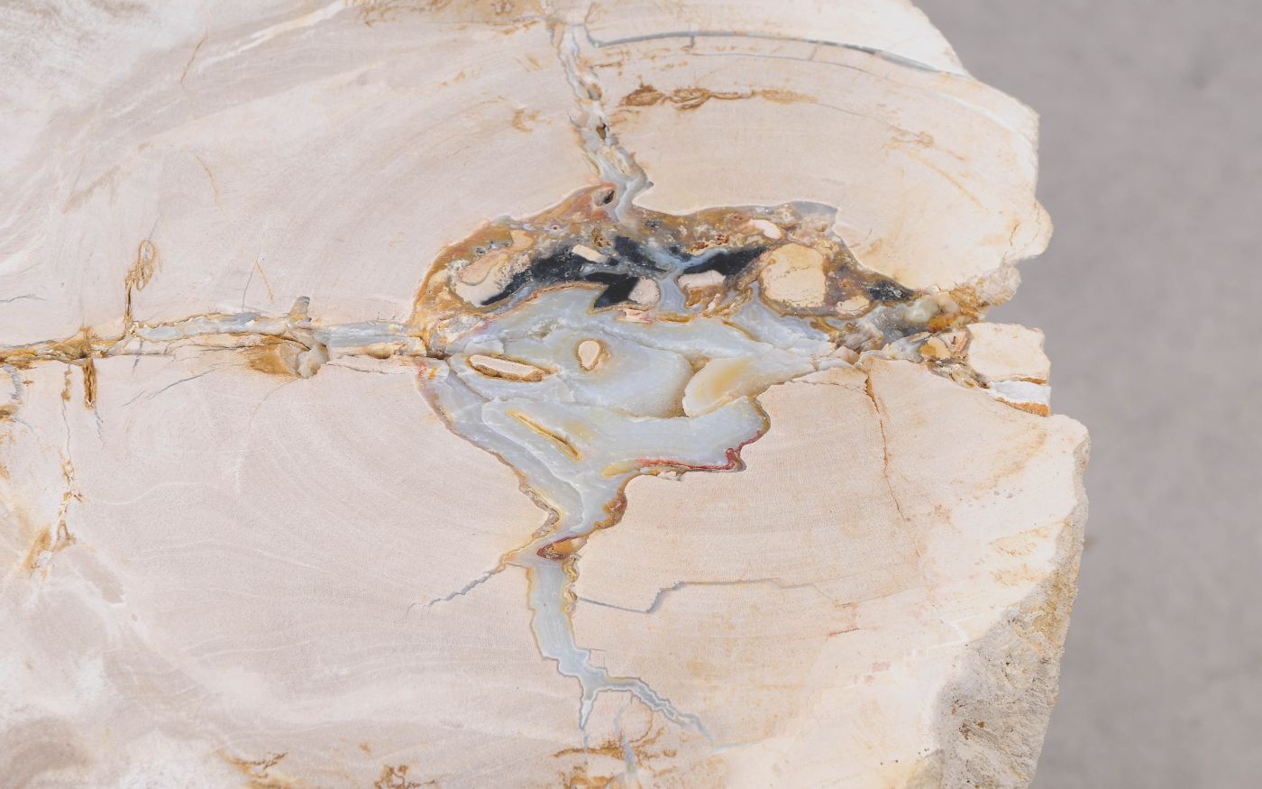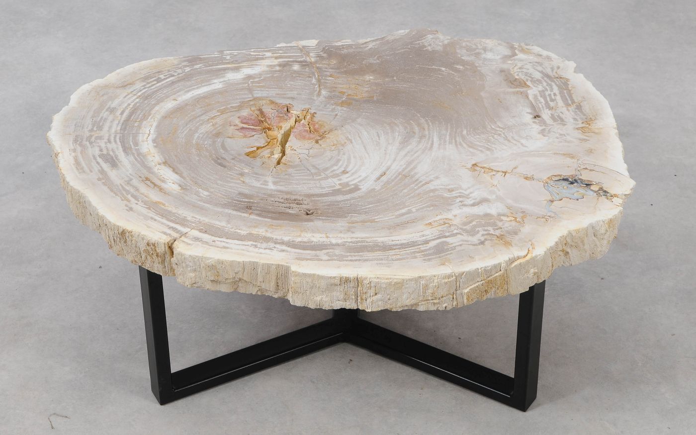 Deze unieke salontafel van versteend hout past in ieder interieur. Het tafelblad is gezaagd uit een grote versteende boom, die ongeveer 20 miljoen jaar geleden geleefd heeft. De kleuren zijn bepaald door de mineralen die het hout van deze boom vervangen hebben.