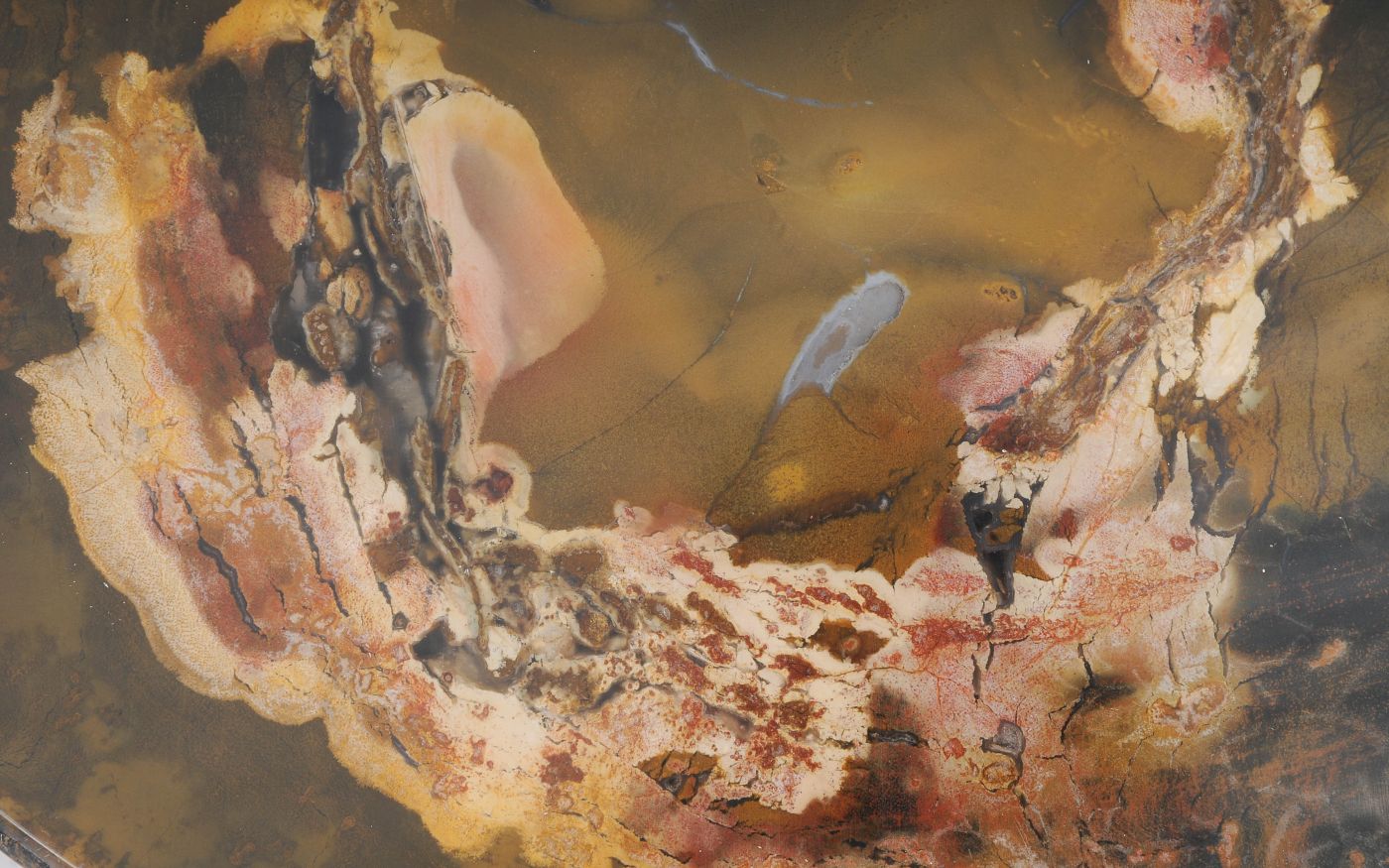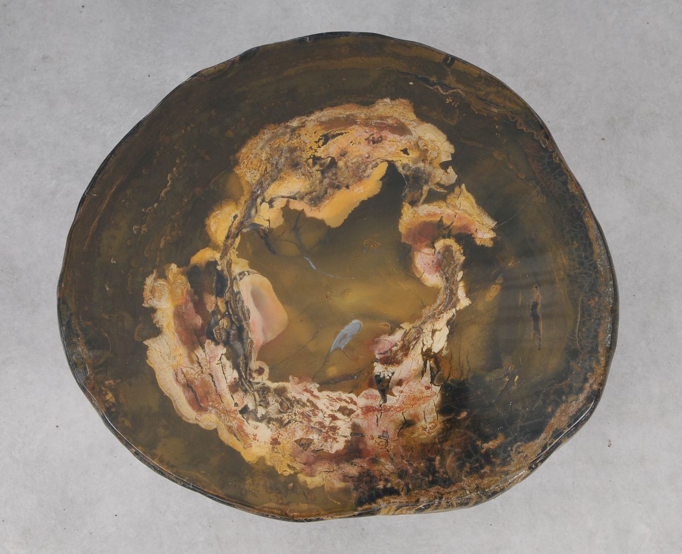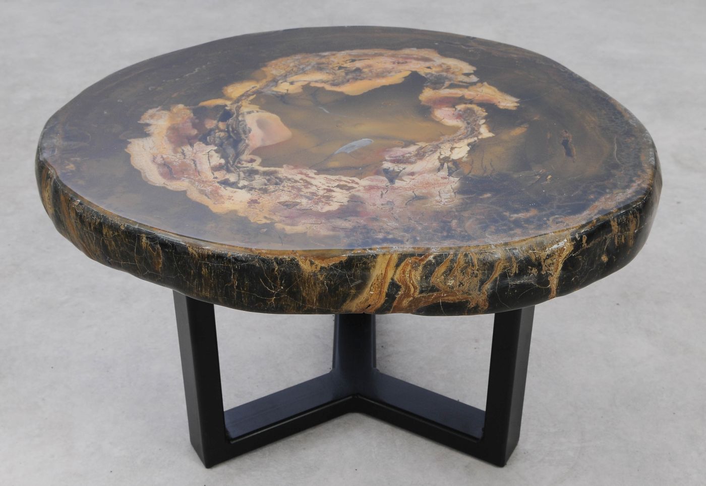 Deze unieke salontafel van versteend hout past in ieder interieur. Het tafelblad is gezaagd uit een grote versteende boom, die ongeveer 20 miljoen jaar geleden geleefd heeft. De kleuren zijn bepaald door de mineralen die het hout van deze boom vervangen hebben.