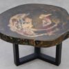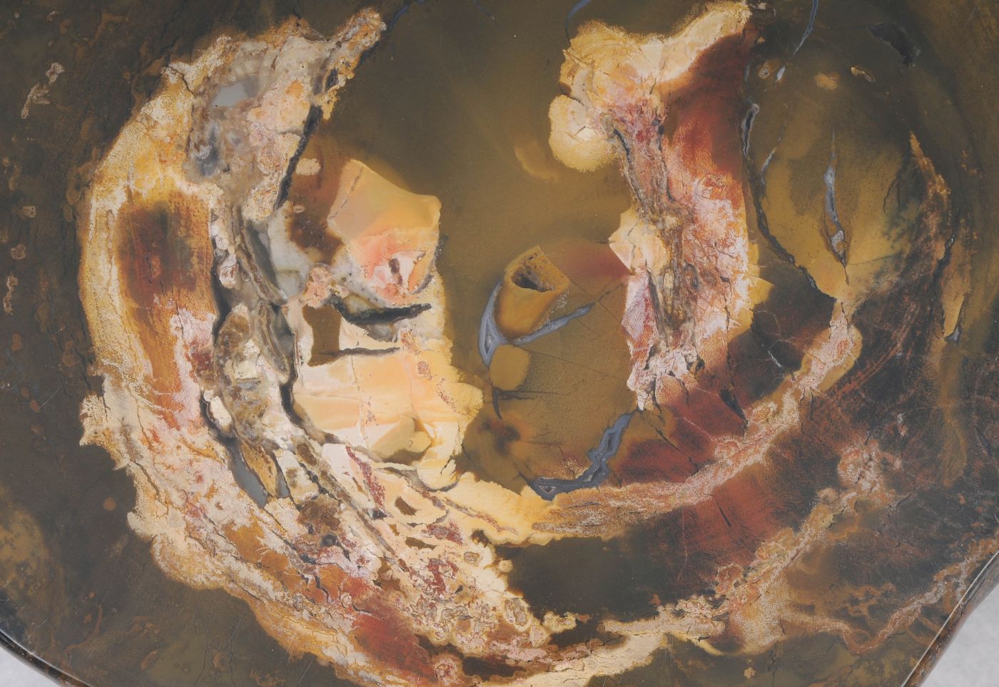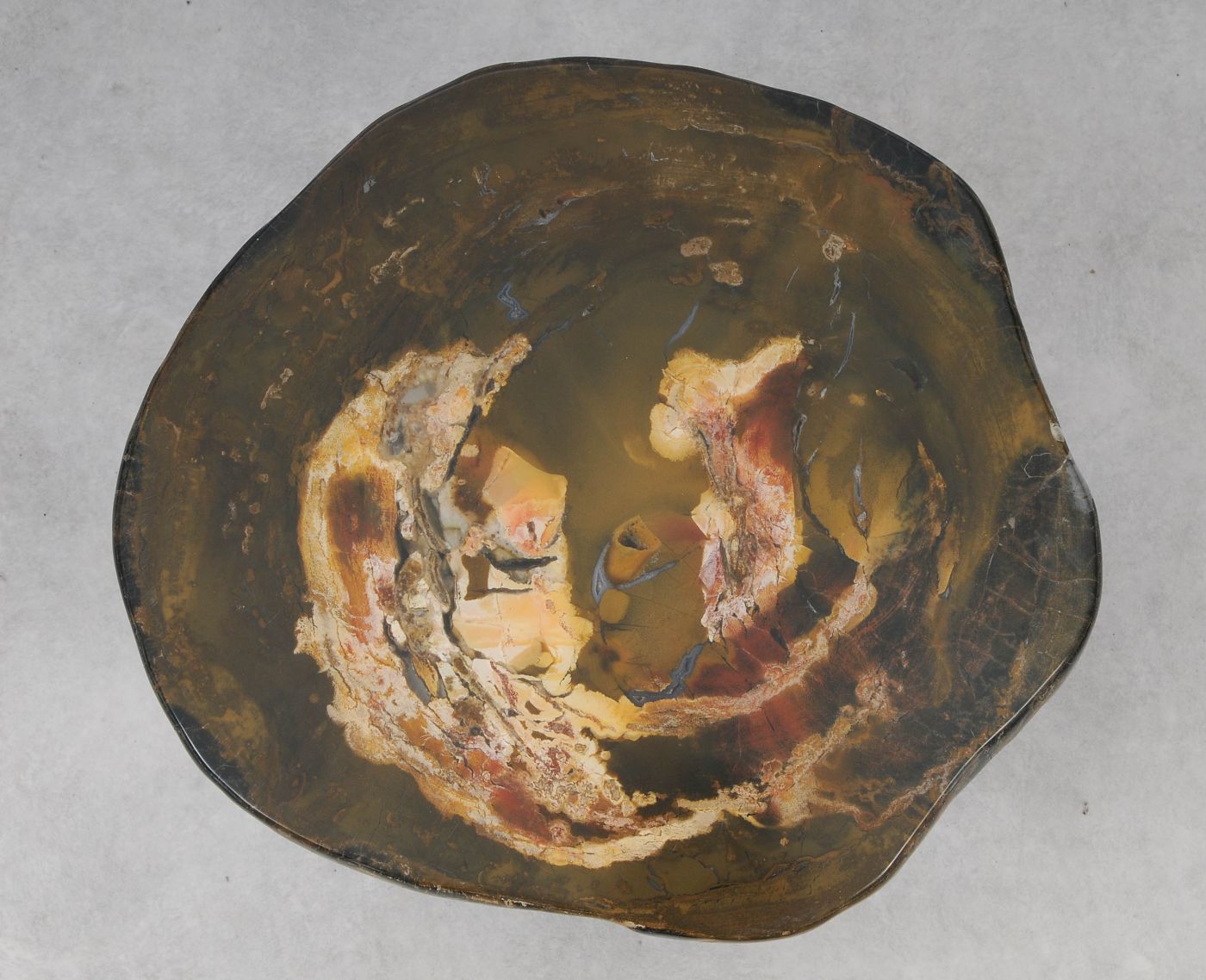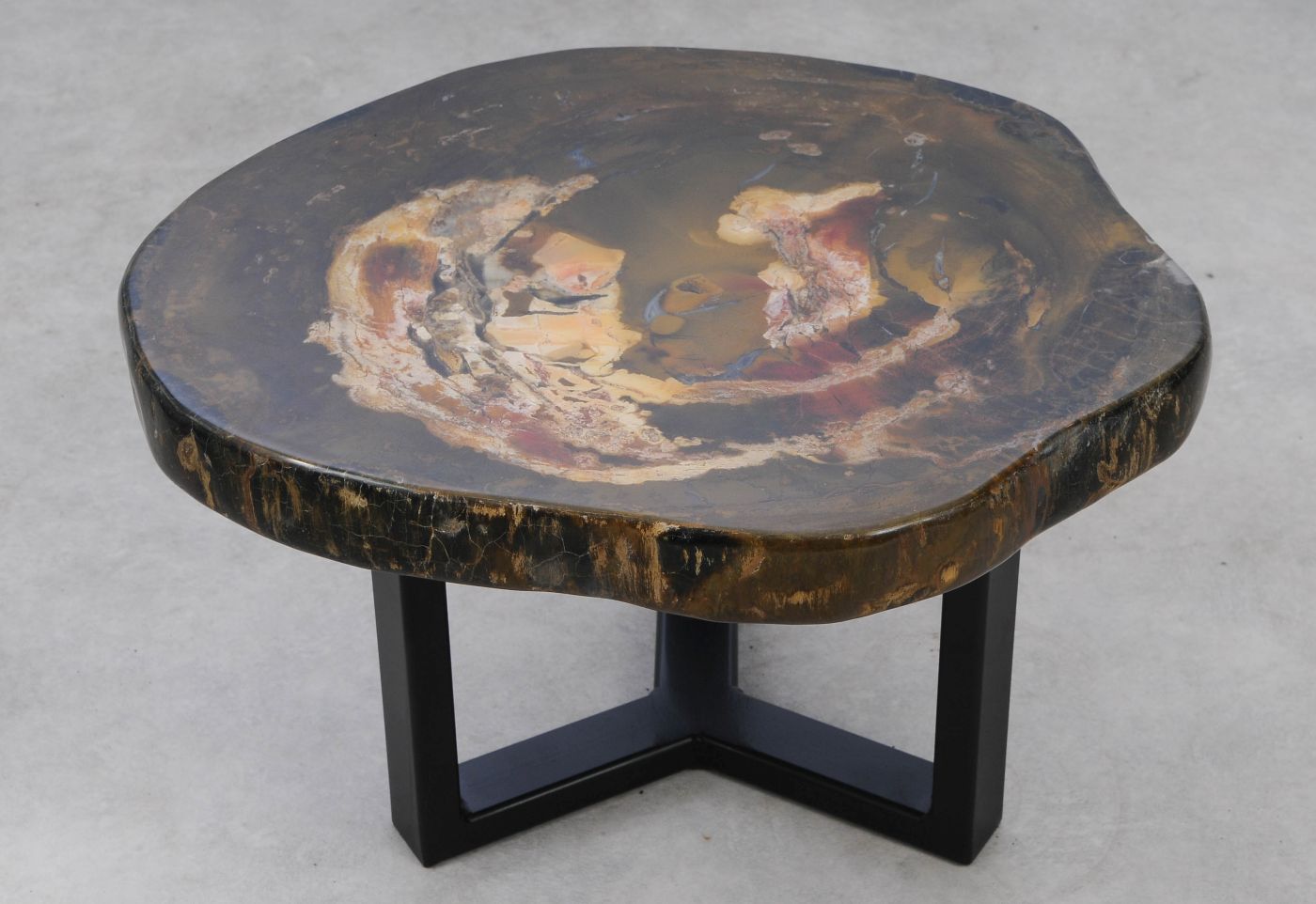 Deze unieke salontafel van versteend hout past in ieder interieur. Het tafelblad is gezaagd uit een grote versteende boom, die ongeveer 20 miljoen jaar geleden geleefd heeft. De kleuren zijn bepaald door de mineralen die het hout van deze boom vervangen hebben.