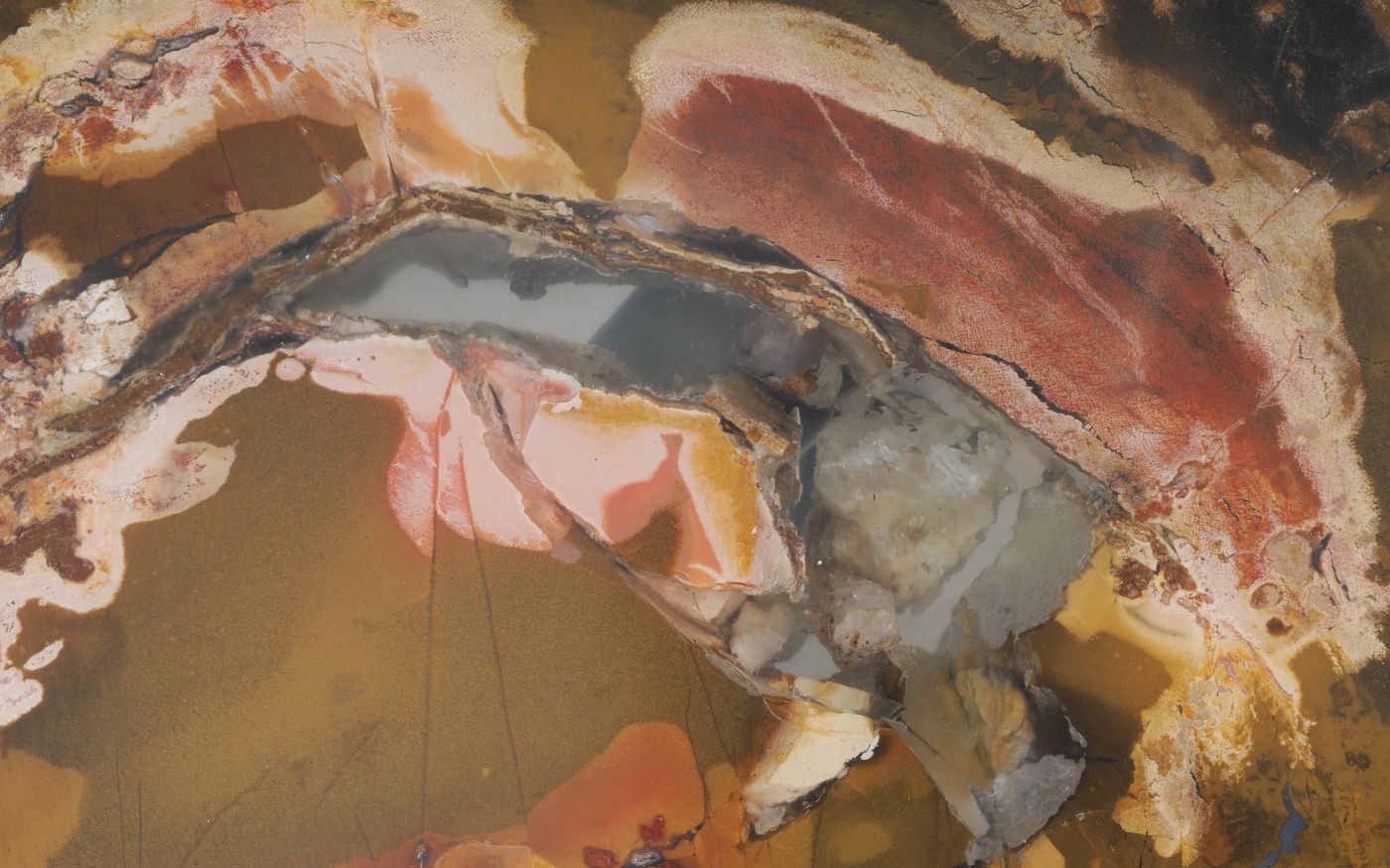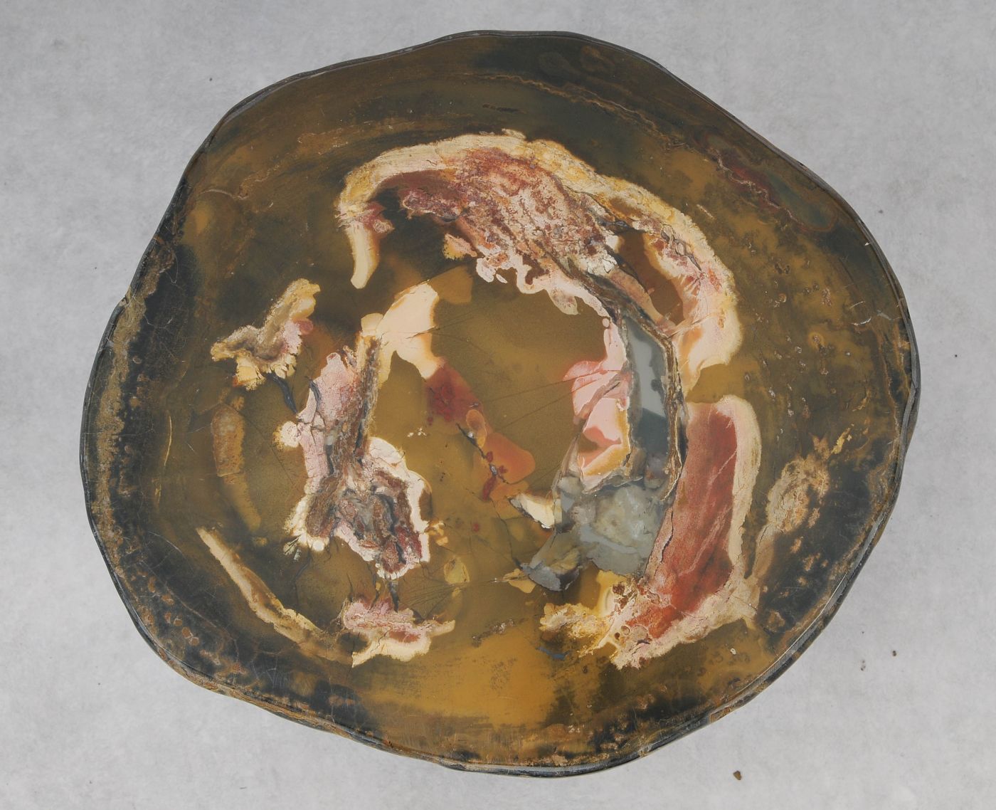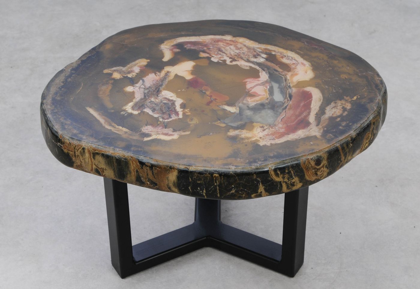 Deze unieke salontafel van versteend hout past in ieder interieur. Het tafelblad is gezaagd uit een grote versteende boom, die ongeveer 20 miljoen jaar geleden geleefd heeft. De kleuren zijn bepaald door de mineralen die het hout van deze boom vervangen hebben.
