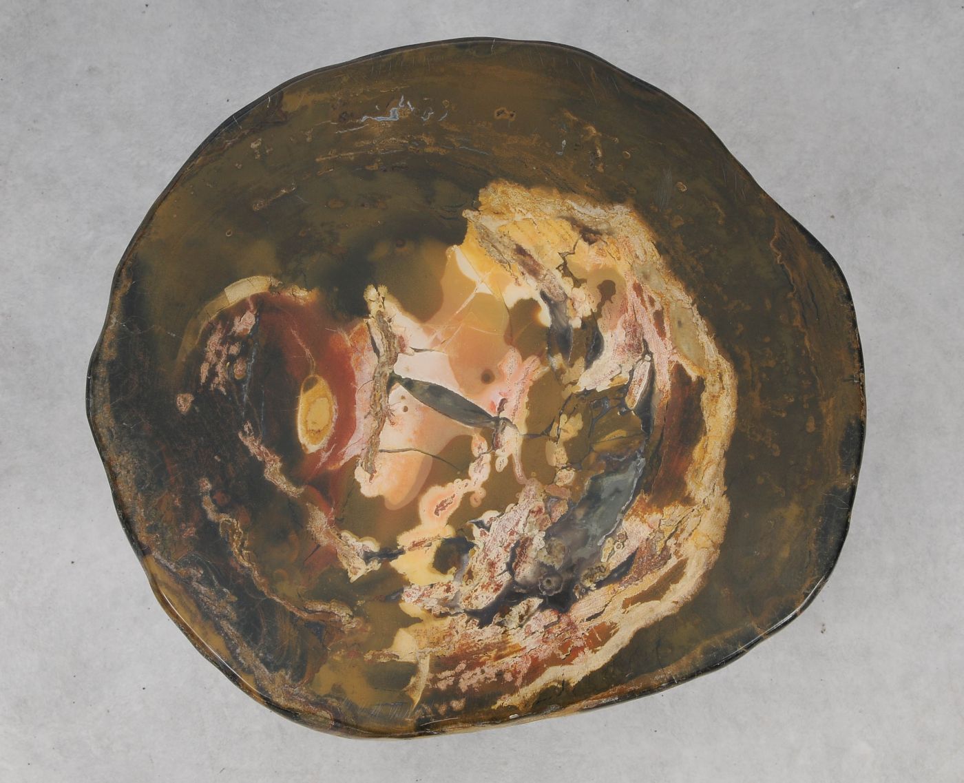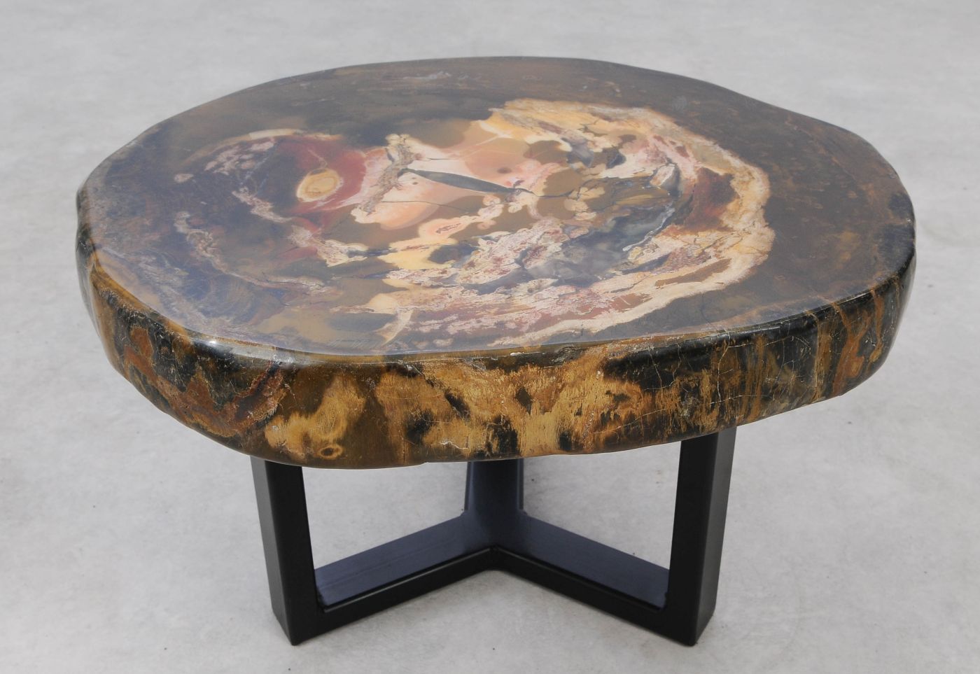 Deze unieke salontafel van versteend hout past in ieder interieur. Het tafelblad is gezaagd uit een grote versteende boom, die ongeveer 20 miljoen jaar geleden geleefd heeft. De kleuren zijn bepaald door de mineralen die het hout van deze boom vervangen hebben.